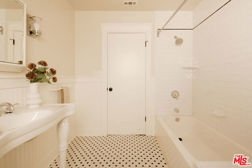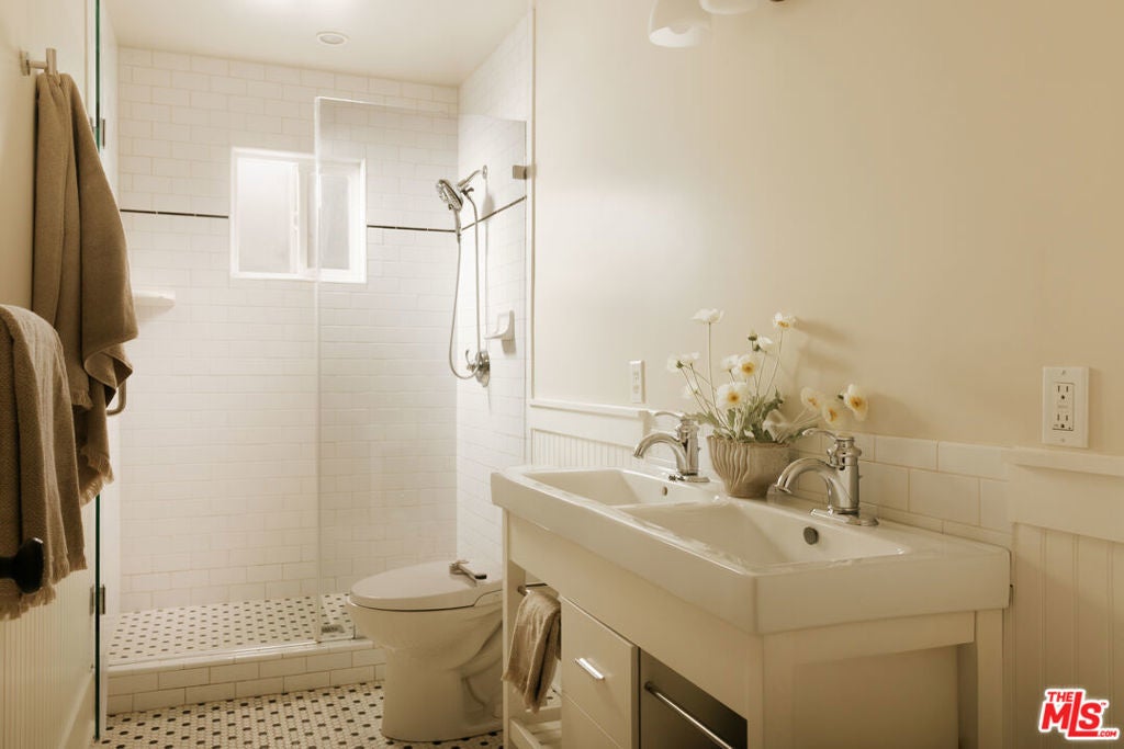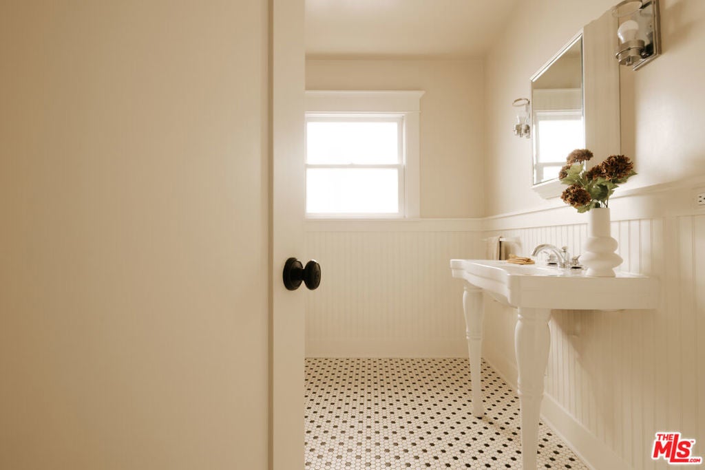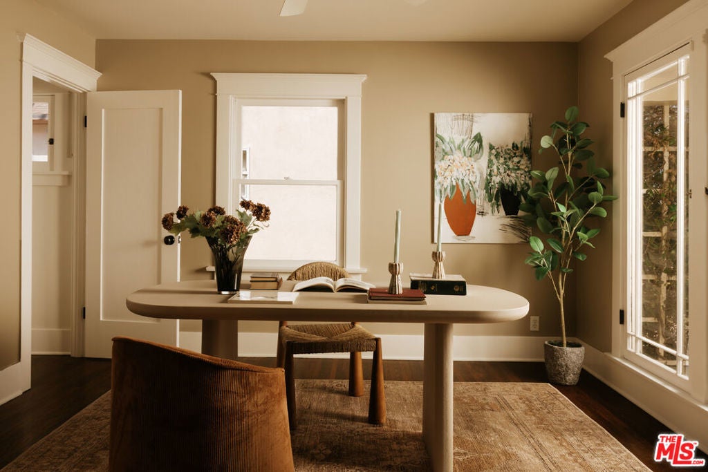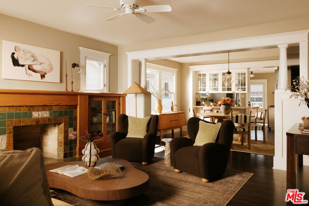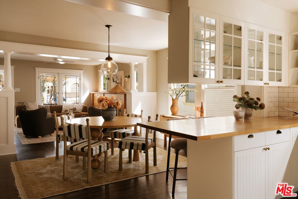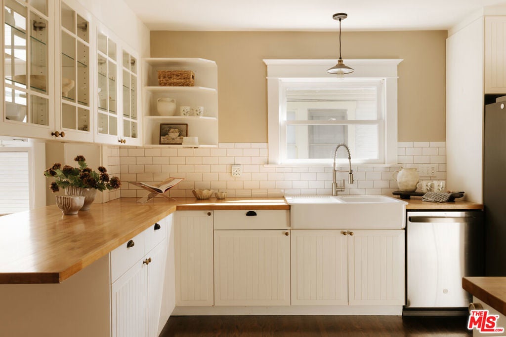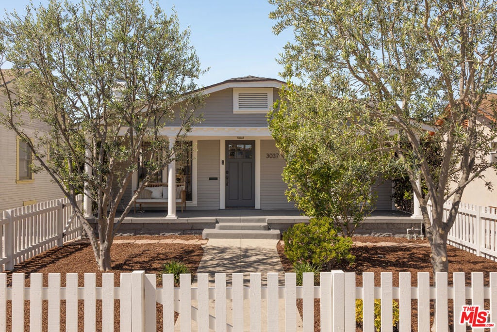 A thoughtfully restored Craftsman by Art Craft Homes in a great pocket of West Adams. A home that exemplifies the perfect balance of bright & fresh contemporary feel with historic preservation. The verdant front yard and wide porch are set behind an idyllic white picket fence. Inside, the open layout runs from the living room, which features a Batchelder-esque tile fireplace and built-ins, through to the dining area with decorative crown moldings, and into the kitchen. The kitchen includes glass-front cabinetry, wood countertops, a farmhouse sink, and a paneled dishwasher. The front bedroom, originally called a parlor room, makes for a great home office. The primary, with its vaulted ceiling, has a generous scale. Doors from both the kitchen and primary bedroom open to a spacious backyard with a deck, grassy area, and a double-bay garage with fantastic ADU potential. Be a part of the burgeoning West Adams neighborhood, and close to great new spots like Maydan Market, Halfday Coffee, and The Little Room.