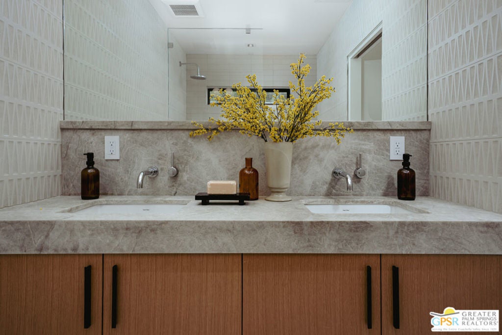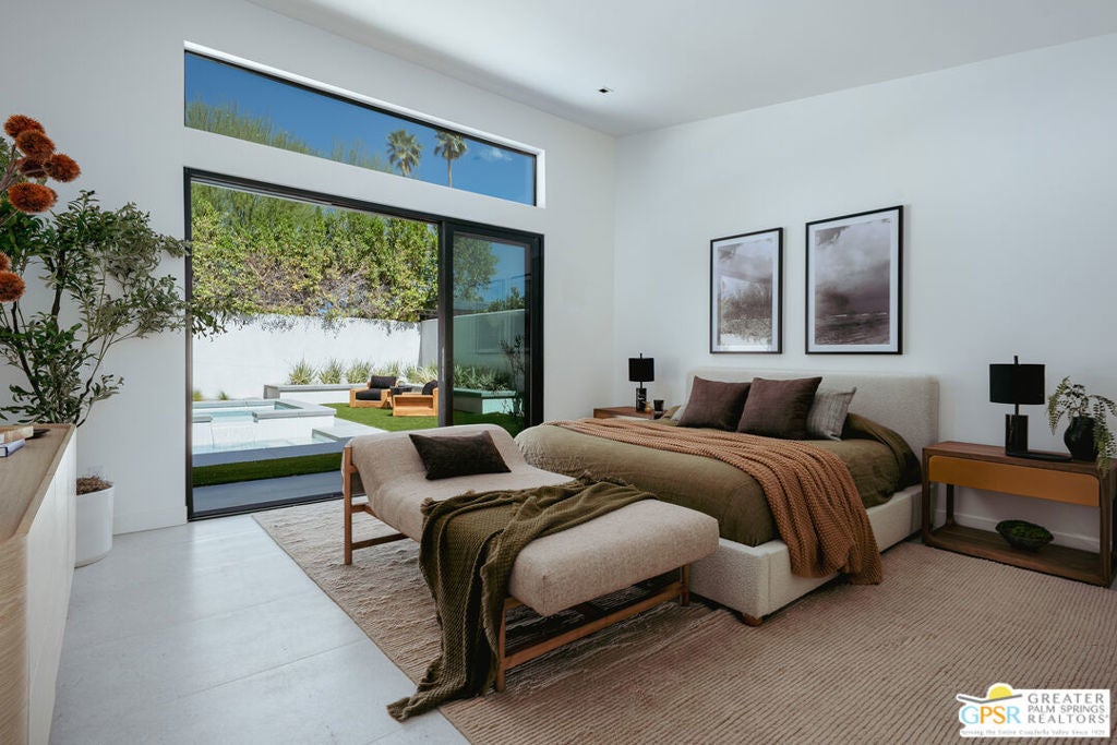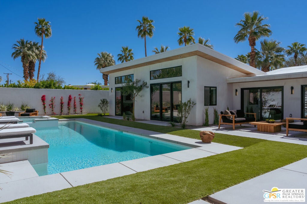 Originally built in 1957 and completely reimagined for modern living, this striking Sunrise Park residence offers the rare opportunity to enjoy the architectural spirit of mid-century Palm Springs with the confidence of new construction. Taken down to the studs and extensively redesigned, the home features soaring 12-foot vaulted ceilings, expansive walls of glass, and a seamless indoor-outdoor flow that frames dramatic mountain views. The 3-bedroom, 3-bathroom main residence is complemented by a beautifully appointed detached casita offering 2 bedrooms, 1 bath, and its own living space ideal for guests and family, or premium short-term rental flexibility. Every system has been rebuilt or replaced, including plumbing, electrical, gas lines, HVAC, roof, windows, and doors. Interiors balance warm natural materials with clean architectural lines, creating spaces that feel comfortably chic and effortlessly livable. Fully walled and gated, the outdoor living spaces are anchored by a newly constructed resort-style pool and spa, lounging platforms, and multiple outdoor entertaining areas designed to create a compound-like feel. With 2,630 square feet of living space in one of central Palm Springs' most desirable neighborhoods and full short-term rental eligibility this home offers exceptional flexibility as a private retreat, luxury second home, or high-performing investment property.