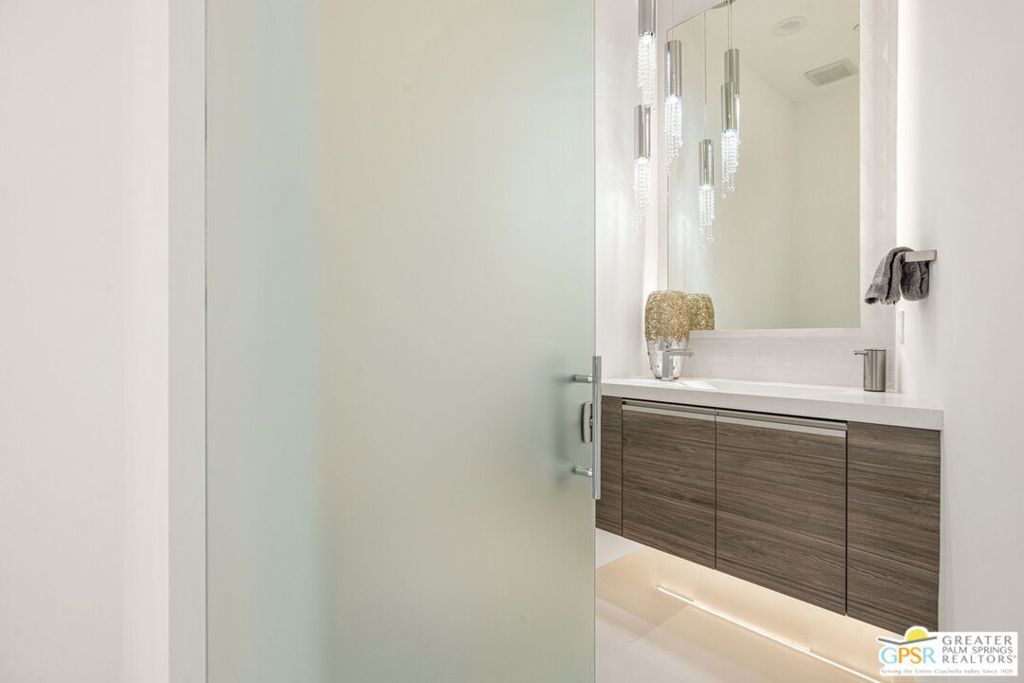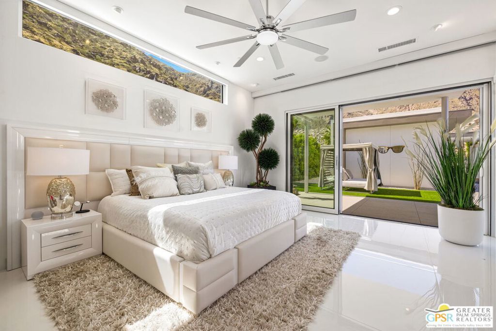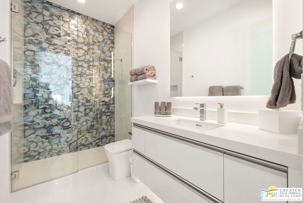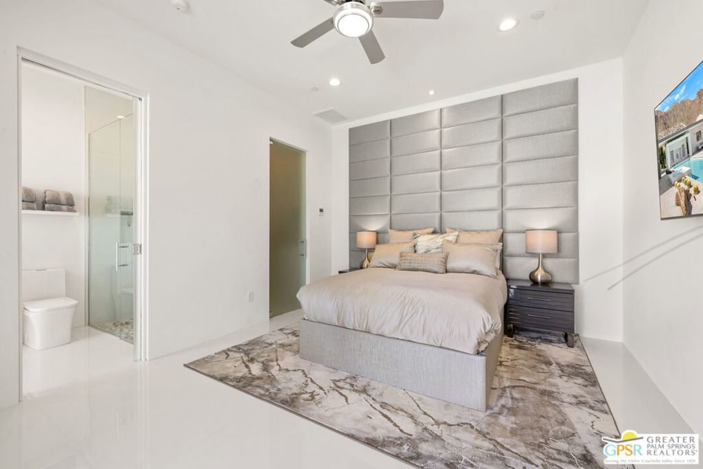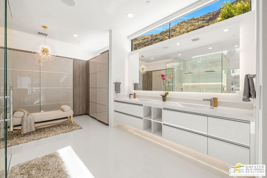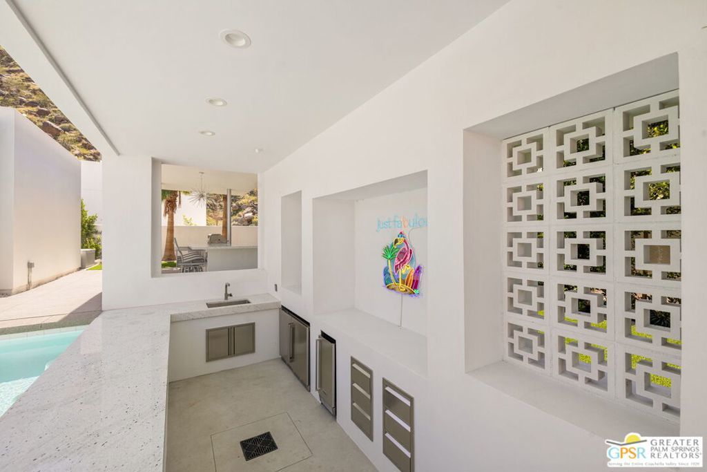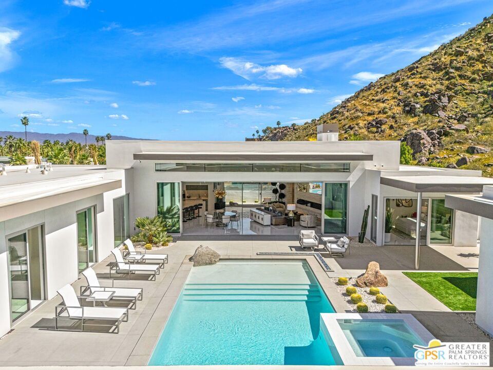 Set within the exclusive gated enclave of ONE Las Palmas in coveted Old Las Palmas, this architecturally striking modern compound captures dramatic, up-close views of the San Jacinto mountains and the iconic Dry Falls. This enhanced residence blends mid-century inspiration with contemporary execution, delivering privacy, scale, and a true resort-caliber lifestyle just moments from downtown Palm Springs. Completed and furnished in 2025 and lightly enjoyed as a private retreat, the home offers a rare sense of newness paired with thoughtful upgrades throughout. Walls of glass, soaring ceilings with clerestory windows, and expansive sliding doors create seamless indoor/outdoor living, filling the interiors with natural light while framing the surrounding landscape. Outdoor living is exceptional. A dramatic pool setting is anchored by an expansive cabana complete with lounge, swim-up bar, bath, BBQ island, and outdoor shower designed for entertaining at scale or relaxing in total privacy. At the center of the home, a gourmet kitchen with oversized island, Cambria quartz surfaces, dual dishwashers, and a full Wolf and Sub-Zero appliance suite opens to the living and dining areas, all oriented toward the pool terrace where the lifestyle unfolds. A generous walk-in pantry enhances both function and entertaining capacity. The floor plan offers excellent separation, with a private Primary Suite wing featuring mountain views, direct pool access, spa-like bath, and Lutron-controlled shades, along with a dedicated work area and powder bath. On the opposite side of the residence, two additional ensuites connect to a flexible media or wellness space, while a detached casita provides a true guest retreat. Infrastructure and efficiency are equally impressive, including 30 solar panels paired with two Tesla Powerwall batteries, four-zone HVAC, integrated audio, full security system, EV charging prep, and upgraded construction finishes throughout. Offered TURNKEY FURNISHED and never rented, this is a rare opportunity to own one of the most compelling modern estates in Old Las Palmas - where architecture, privacy, and lifestyle converge at the highest level.