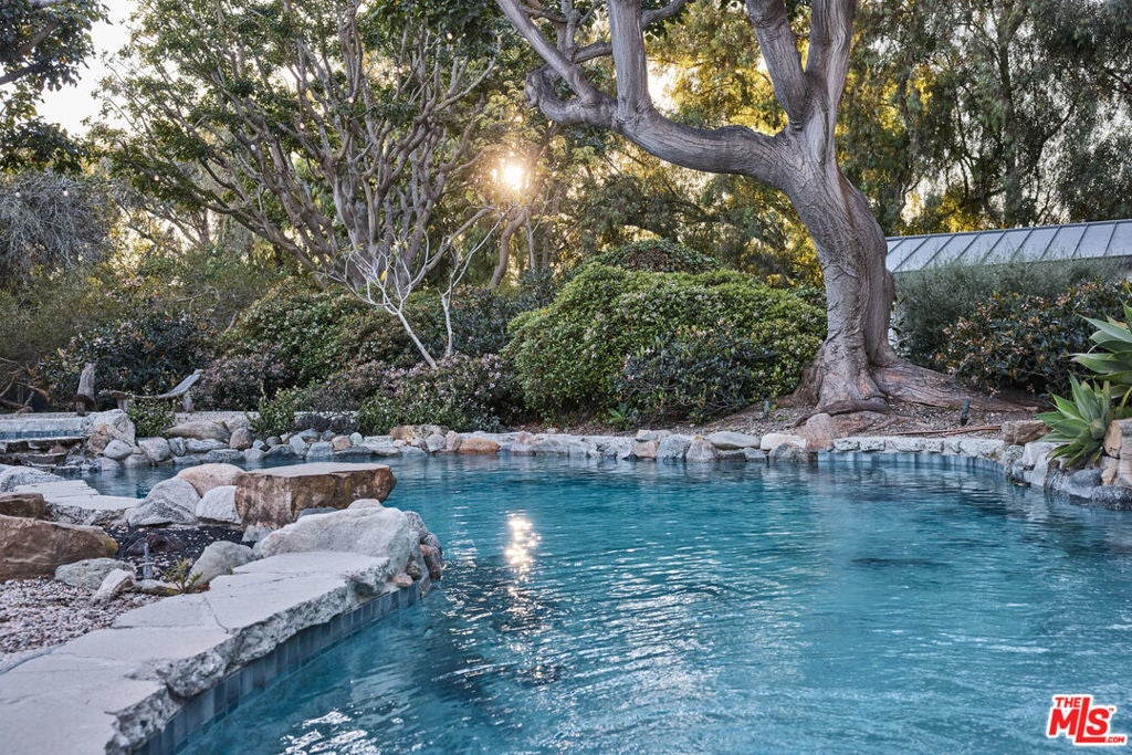 This sensational Point Dume house is set on more than an acre of gated and landscaped privacy. Complete with beach rights, it is a home created for comfortable indoor/outdoor living and sophisticated entertaining. The home is detailed with high wood-beamed ceilings, Fleetwood glass doors and cement floors. In addition to a beautiful living room, the home has a media room, family room with fireplace, a dining area, and a chef's kitchen equipped with a Viking stove and oversized Sub Zero refrigerator and freezer. Large 12-foot sliding doors open the house to the front and back yards. There are three bedrooms and four bathrooms, plus an office/bonus room, with a fireplace, that could be a fourth bedroom. The owner's suite has a fireplace, a wall of glass doors opening to the back patio, and a luxurious garden-view bath with a huge shower, tub, and double sinks. The exquisite grounds are tranquil and harmonious, with a pool and spa, dining area, fire pit, double barbecue island, multiple recreation and seating areas among beautiful trees and plantings, and a detached one bedroom guest house. The home is also equipped with modern updates such as Sonos speakers, Generac auxiliary power, NEST heating and cooling, and security entry. This exceptional property is just a short distance to Riviera 2 private beach access.