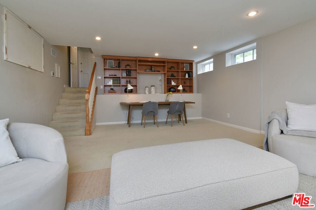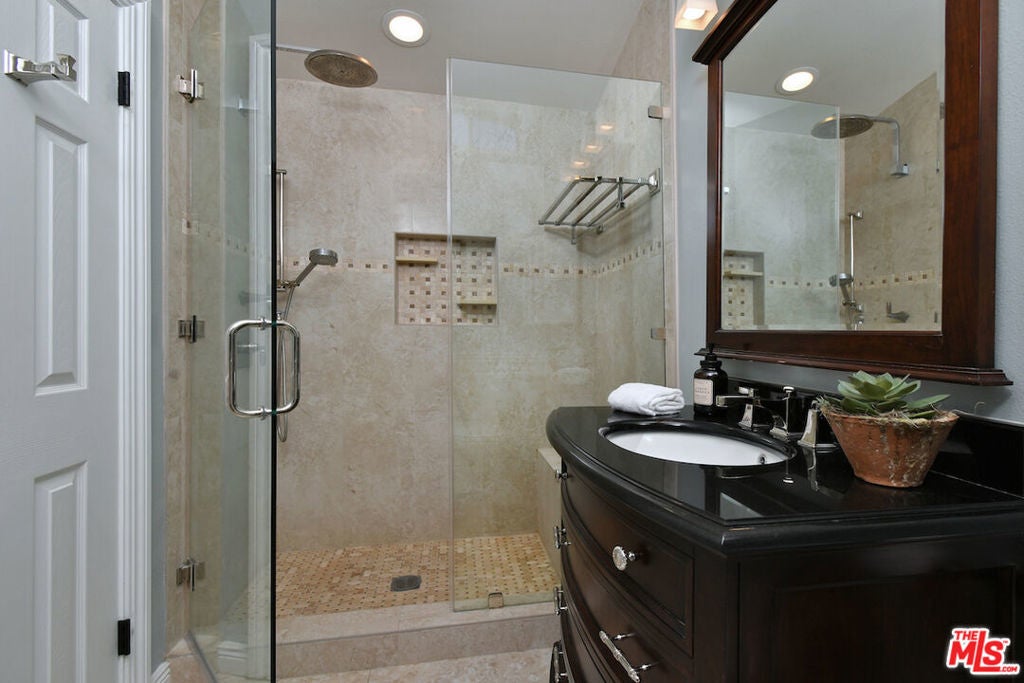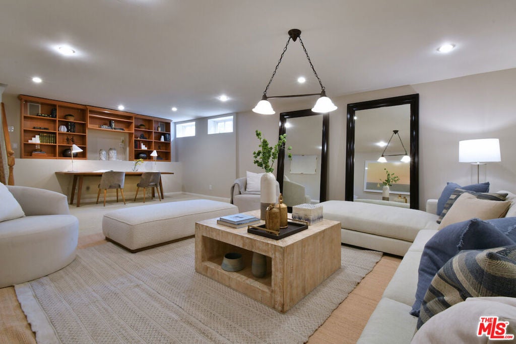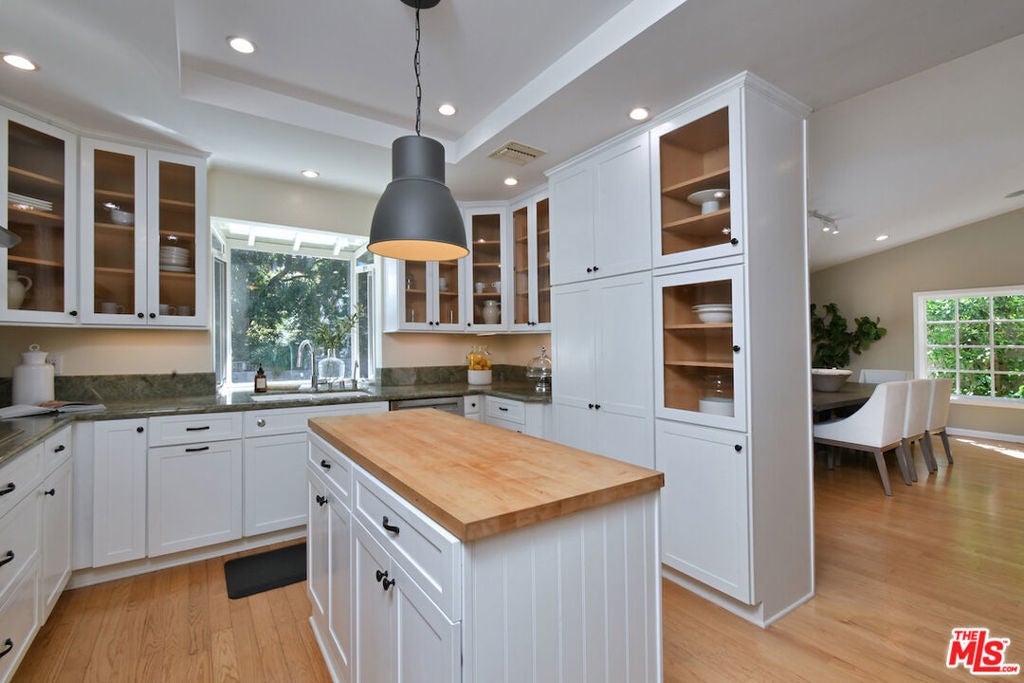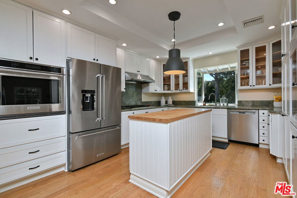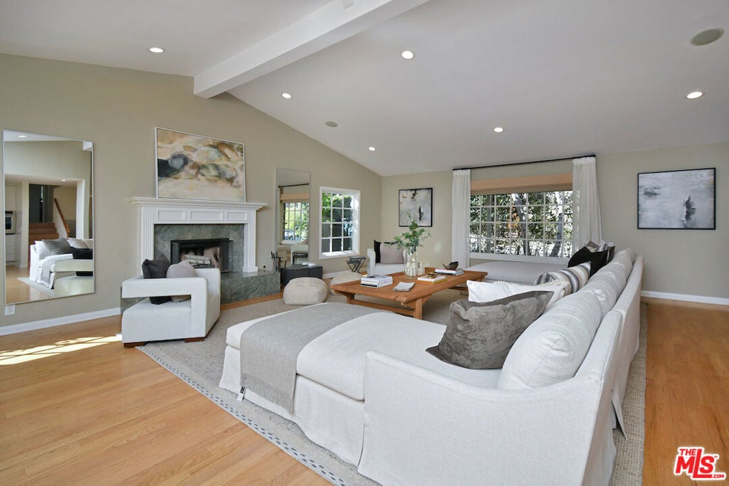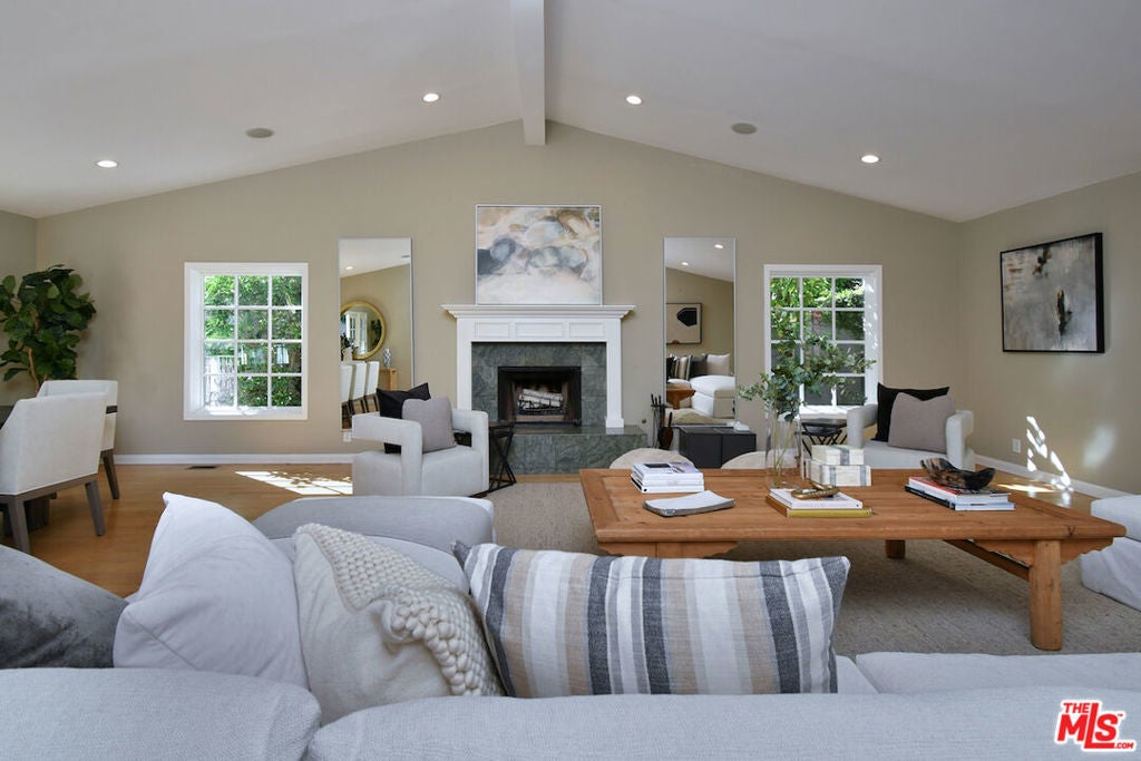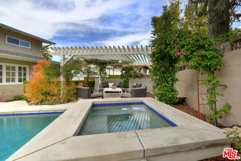 Spacious South of the Blvd. traditional home on a quiet street in the foothills of Sherman Oaks. A double-door entry opens to the main living spaces featuring high ceilings, hardwood floors, a mantled fireplace, and picture windows. The center island kitchen includes built-in appliances, glass-front cabinets, and a pantry. French doors from the dining room lead to a patio deck and BBQ area. There are four bedrooms, including a private bedroom suite with an adjacent kitchenette, built-in desk, bookshelves, dressing area, and en-suite bathroom. The primary bedroom includes a custom-designed walk-in closet and en-suite bathroom with a glass steam shower and soaking tub. A large family room offers flexible space for everyday lounging, a home theater, or game room. The backyard features gardens, a large swimmer's saltwater pool, jacuzzi and patios for entertaining and relaxing. Additional highlights include an indoor laundry room, a two-car attached garage with direct entry, solar panels, and an EV charger.