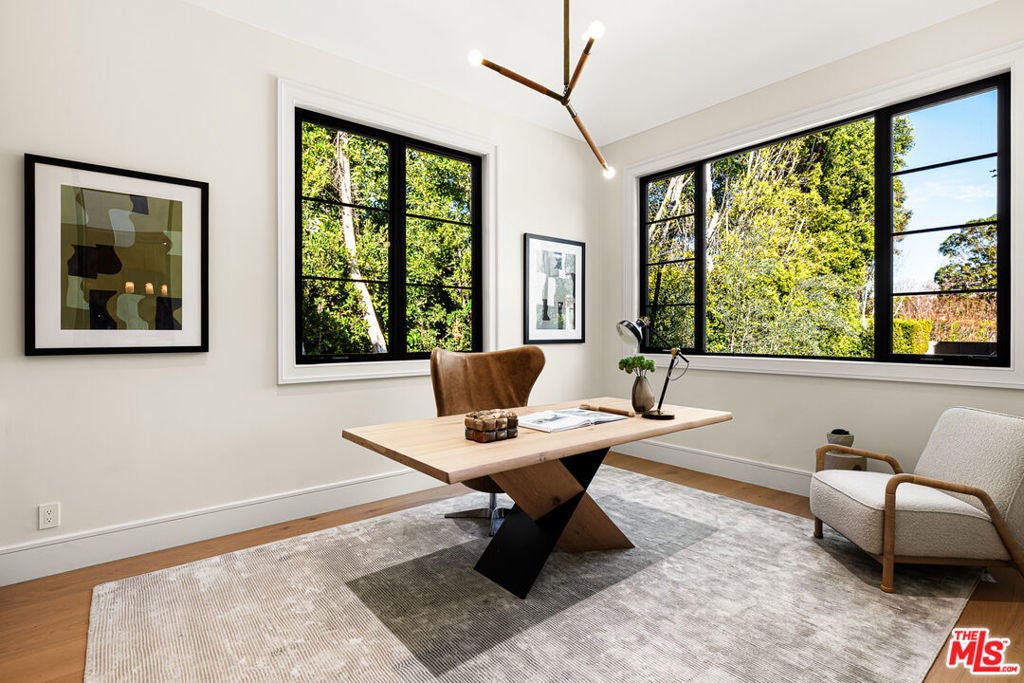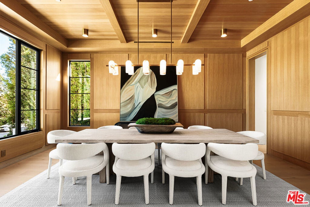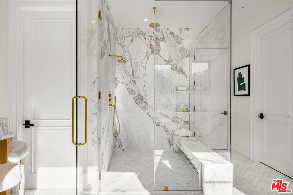 Situated in the prestigious enclave of Brentwood Park, this newly constructed Traditional estate by renowned architect Ken Ungar is a masterful expression of timeless design and modern luxury. Soaring ceilings and beautifully proportioned interiors create a refined yet welcoming atmosphere, thoughtfully designed for both grand-scale entertaining and comfortable everyday living. At the heart of the home, the gourmet chef's kitchen features marble countertops, a sunlit breakfast nook, and a built-in coffee bar, all enhanced by finely crafted custom details. The kitchen flows seamlessly into the living and family rooms, where dramatic retractable glass walls dissolve the boundary between indoors and out, opening to expansive grounds designed for effortless entertaining. The outdoor setting includes a spacious patio with an outdoor kitchen and BBQ, resort-style pool and spa, and a sweeping manicured lawn. A detached guest studio with kitchenette and private bath completes the grounds. The main level also features a beautifully wood-paneled formal dining room, a private office, and a guest bedroom suite. Upstairs, four ensuite bedrooms include a luxurious primary suite with a private balcony, fireplace, dual dressing rooms, and a striking book-matched marble bath. In total, the residence offers seven bedrooms and nine bathrooms. The lower level is designed for leisure and wellness, featuring a game room, bar, temperature-controlled wine room, gym, private cinema, and a dedicated wellness suite with sauna and steam shower, along with additional staff or guest accommodations. A rare offering of brand-new construction in one of Los Angeles' most sought-after neighborhoods.