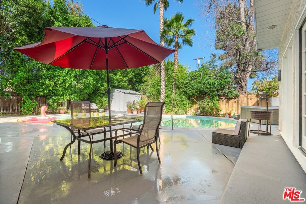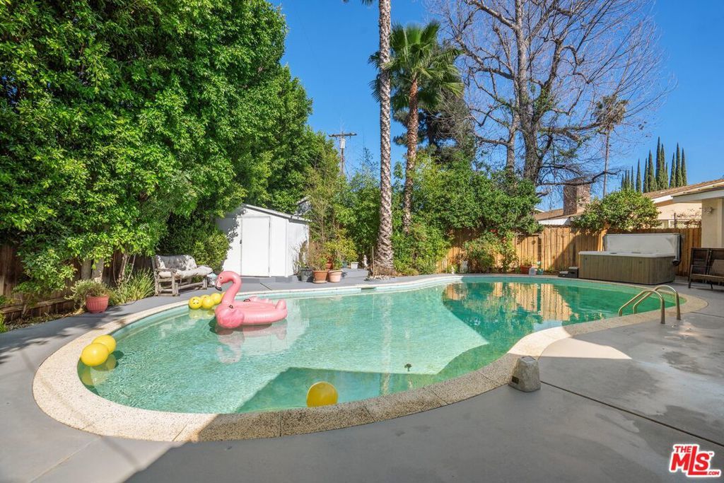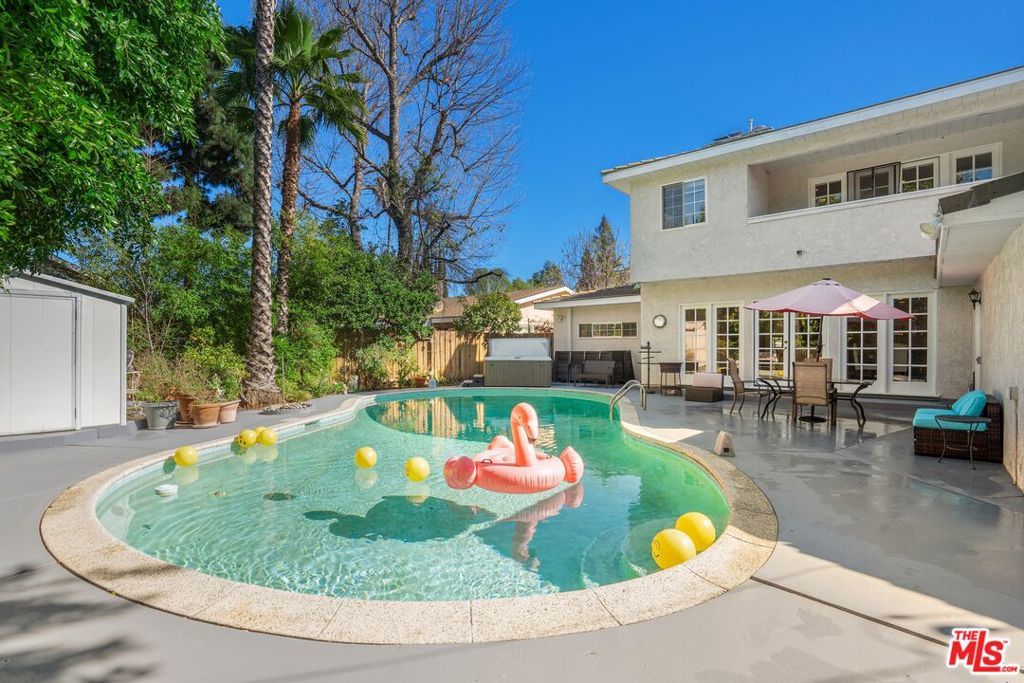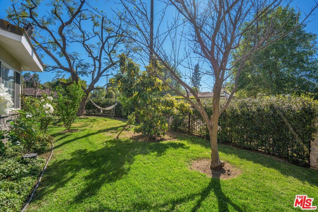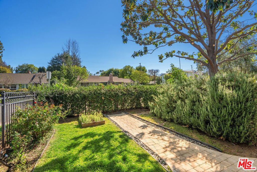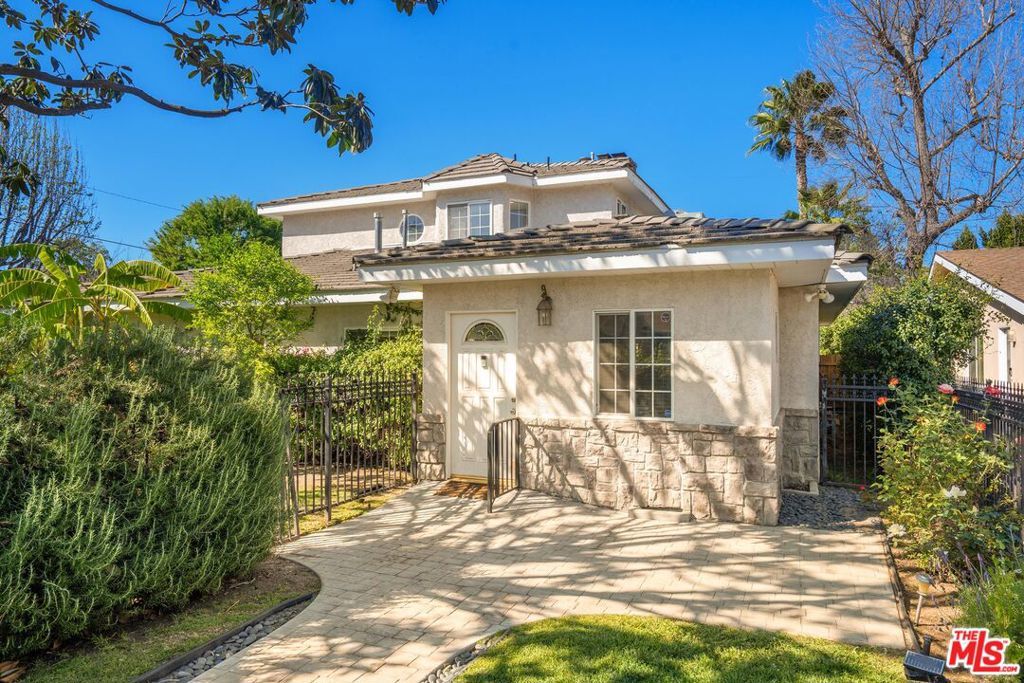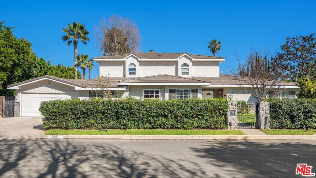Welcome to this beautifully updated and spacious 5BD/4BA home, ideally located in one of Encino's most desirable pockets. A gated, lushly landscaped front yard with mature fruit trees including bananas, avocados, peaches, and plums as well as a herb and rose garden, sets the tone as you arrive, leading to a grand double-door entry. Inside, the formal dining room flows seamlessly into the inviting living room, complete with a fireplace and French doors that open to the backyard, creating the perfect indoor-outdoor lifestyle. The eat-in chef's kitchen is designed for both function and style, featuring a large center island, granite countertops, and abundant cabinetry and prep space. The entire upper level is dedicated to an impressive primary suite, offering exceptional privacy and comfort. This retreat includes a cozy fireplace, private balcony, bonus lounge area with sink and storage, dual closets, and a spa-inspired bathroom with a separate tub and shower. Four additional generously sized bedrooms complete the home, including one with its own private entrance and yard, ideal for guests, extended family, or a home office. The resort-style backyard is perfect for entertaining, showcasing a sparkling pool, above-ground spa, and ample space to relax or host. Additional highlights include a brand new electrical panel and an attached two-car garage. Located within the highly acclaimed Hesby Oaks Charter School district and just moments from the dining and shopping along Ventura Boulevard, this is Encino living at its finest.
