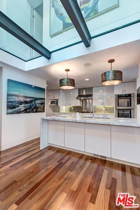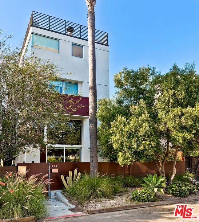Incredible architectural contemporary residence in prime Marina del Rey, filled with natural light from multiple skylights, soaring ceilings, and hardwood floors throughout. The home features Caesarstone countertops, a private elevator to the rooftop entertainment deck, and an elegant entry. Fireplaces in both the living room and the primary suite, which includes a sitting area, custom walk-in closet, and abundant storage. Multiple terraces on every level offer sweeping views of the ocean, city lights, and mountains, and view of the community garden. Located just a short walk to the water and a myriad of shops. A must see!