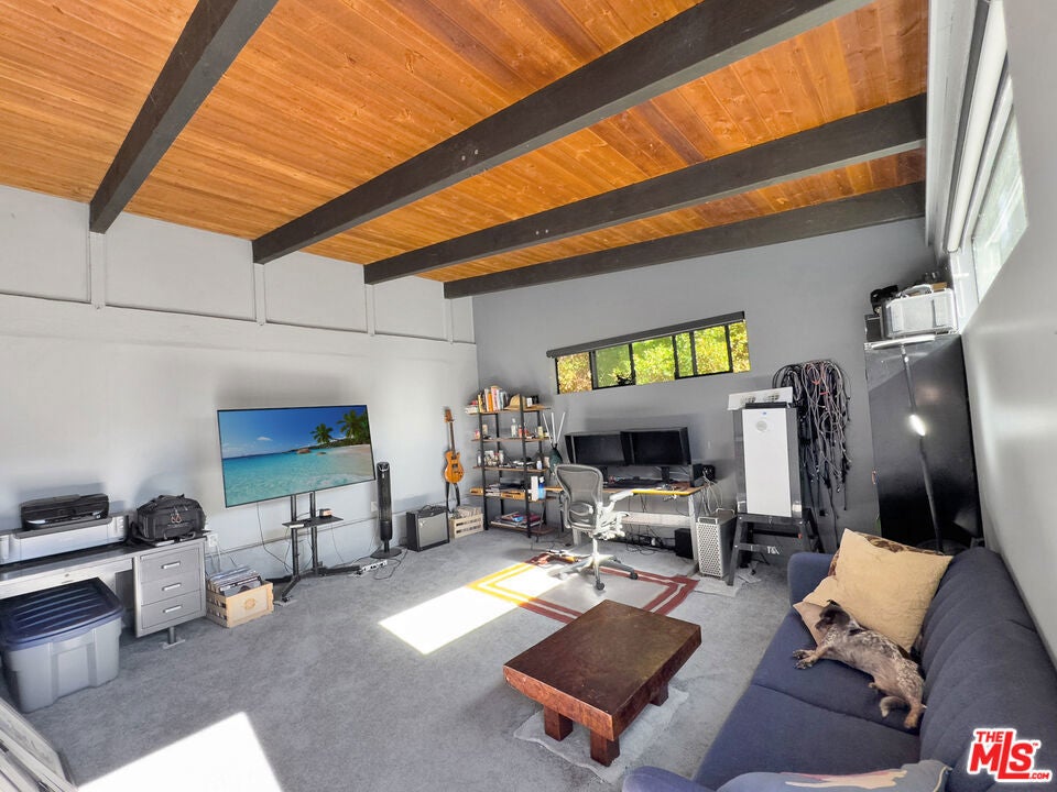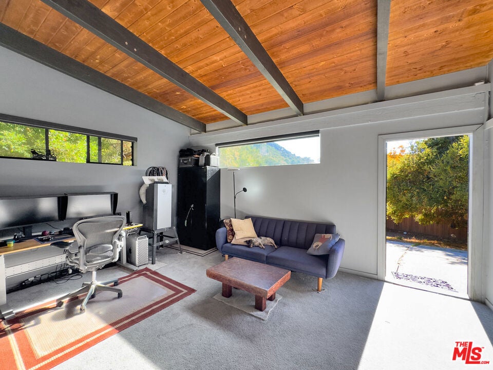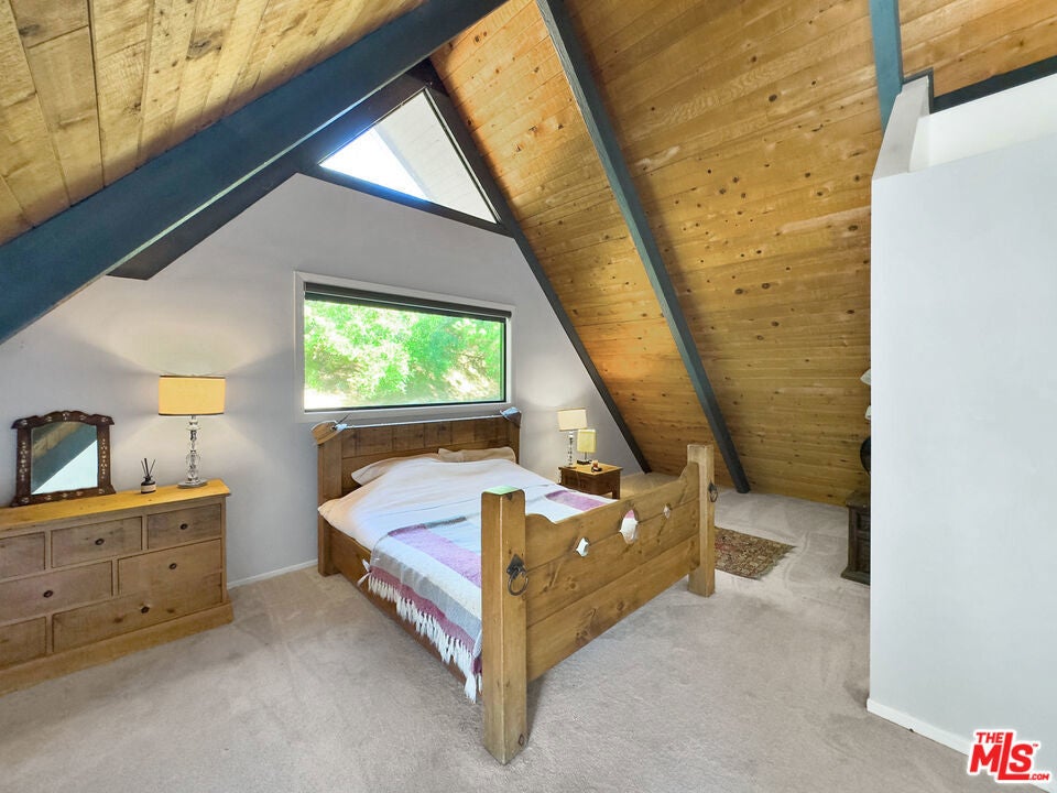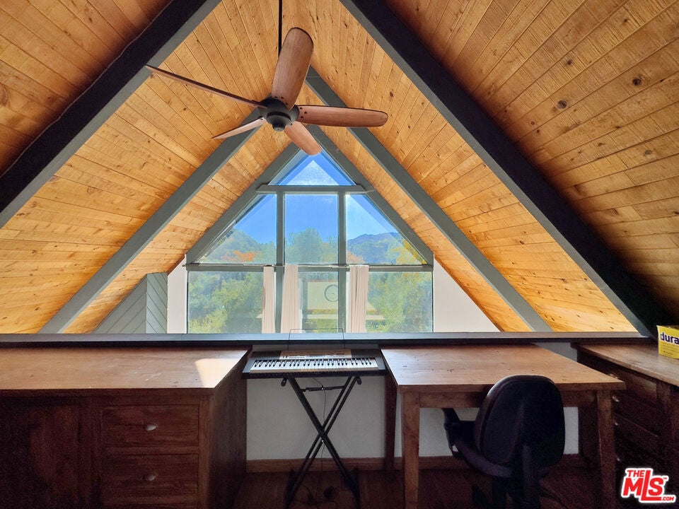 There's a particular kind of morning that only a home like this can offer. Light pouring through picture windows that span the full width of the main living area, canyon ridges catching the early sun, the day beginning quietly and entirely on your own terms. This is what it feels like to live here. Set on a fenced lot of nearly 30,000 square feet, this five-bedroom, three-bathroom A-frame offers 3,340 square feet of thoughtfully arranged living space that feels completely at ease in the landscape surrounding it. The architecture doesn't sit in the canyon so much as belong to it, its angles echoing the ridgelines, its windows turning the view into something you live with rather than simply look at. The main level is open, warm, and grounded. A wood-burning fireplace anchors the living room, casting the kind of warmth that makes evenings feel unhurried and full. The kitchen flows naturally from it, making the whole floor feel connected and effortless. Two bedrooms and a full bathroom complete this level, and wrap-around decks extend the living outward in every direction, blurring the line between inside and out in a way that feels natural through much of the year. Climb to the top level, and the home opens up entirely. The primary suite occupies the full floor, a loft-style retreat with a private bathroom, a dedicated office and library area, and a private patio sitting quietly above the tree line. The views from here carry across the canyon with a particular openness that comes from elevation and architecture working in rare agreement. This is a place for thinking, reading, and remembering why you chose this life. The lower level operates as a fully independent unit with its own two bedrooms, full bathroom, living and media room, and guest kitchen. Whether you're hosting extended family, accommodating a caregiver, or generating rental income, this level earns its place. The converted garage extends that versatility further as a studio, gym, or home office, making the property as flexible as it is beautiful. Outside, the location delivers on every front. A private gate opens onto a long driveway with parking on both sides, leading to Topanga School Road with Topanga Elementary just steps away and the Paul Revere Middle School bus stop is a short walk from the property. The canyon's library, market, shops, restaurants, and community gathering spots are all within easy walking distance, and Topanga Beach is approximately ten minutes by car. Recent updates include a new roof, refrigerator, cooktop, dishwasher, and water heater. Tucked between the Santa Monica Mountains and just minutes from Woodland Hills and the Pacific Coast Highway, Topanga has long drawn artists, naturalists, musicians, and free thinkers to a life rooted in nature, creativity, and genuine community. The Topanga Farmers Market, Topanga Days, outdoor concerts, and miles of trails through Topanga State Park and the Santa Monica Mountains National Recreation Area make this one of the most distinctive and sought-after communities in Los Angeles County. Some homes are simply addresses. This one is the beginning of a different kind of life.