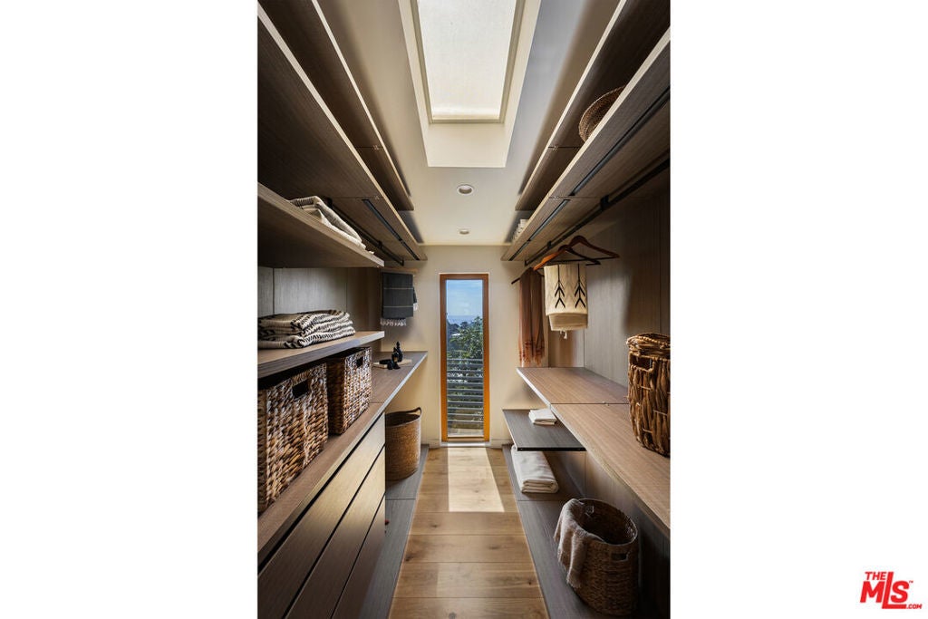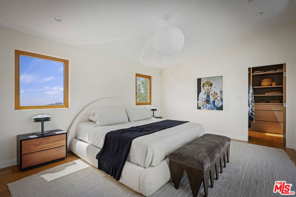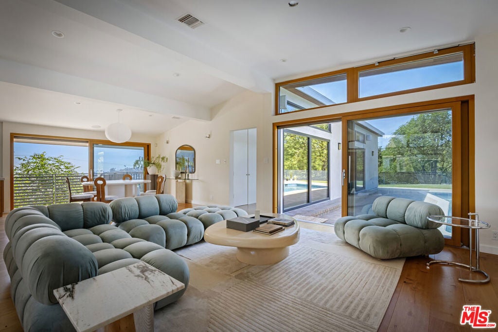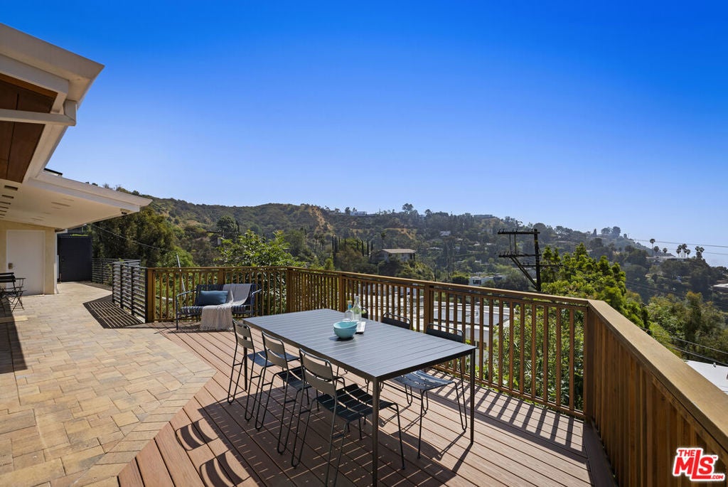 Single-story mid-century set on its own promontory, perched atop the hills of Nichols Canyon, offering privacy and sweeping unobstructed 360-degree views canyon ridgelines in every direction, city lights below, and on clear days, the ocean beyond. Renovated with a commitment to quality and environmental responsibility, the home features high-end, eco-conscious, and energy-efficient upgrades, including an owned solar energy system with battery backup. The architecture stays true to its mid-century modern origins designed for connection and visibility. Thoughtfully arranged, the primary suite sits on one side, with three additional bedrooms and two bathrooms on the other, all oriented around a heated pool and a flat grassy backyard. The primary suite features a walk-in closet and a spa-inspired ensuite with a soaking tub, all three spaces framed by breathtaking views. The kitchen has been updated with sustainably sourced wood cabinetry and Miele appliances. It opens onto the dining and living areas and extends to a south-facing deck with sunset views. Floor-to-ceiling Gaulhofer windows and sliding doors, crafted from premium Austrian wood, double-paned for energy efficiency and acoustic comfort, bring in natural light from sunrise to sunset while framing the surrounding landscape. Skylights soften and diffuse daylight throughout. Every detail, down to the finely finished closets, reflects a dedication to both form and function. Gated and secured by a Hikvision CCTV system and Turbolock digital entry, the property also includes a two-car garage and four additional parking spaces, with outdoor areas thoughtfully arranged for relaxing and entertaining. A rare oasis that balances architectural integrity, environmental mindfulness, and understated luxury, this residence is designed for those who value quality, privacy, and a thoughtful way of living.