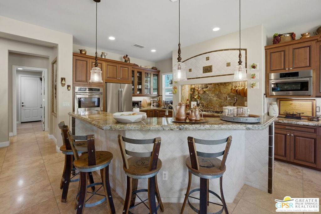 This spectacular executive residence is located within the prestigious gated enclave of Brenna at Capri and is sure to impress the most discerning person. Seller requests minimum of a 6 month or a 12 month lease for a furnished executive home. Offered furnished and with high-end designer pieces, this exceptional property sits on an expansive quarter-acre lot, showcasing a lushly landscaped backyard oasis with a private in-ground pool and spa in your own serene desert retreat. Additionally, one can enjoy a gas fire pit for those cool nights, and a new top of line DCS Bar-B-Q and stone surrounding outdoor kitchen area. A covered patio perfectly captures the essence of indoor-outdoor living, ideal for entertaining or relaxing under the desert sky. Spanning over 3,200 square feet, the home features five generously sized bedrooms, one o which is presently used as an office, and five well-appointed baths. A welcoming foyer opens to a grand living space and an open-concept layout designed for both comfort and sophistication. The chef's kitchen is a true centerpiece, complete with granite countertops, a spacious sit-at island, breakfast nook, and premium appliances perfect for culinary enthusiasts. The primary bedroom suite is a luxurious sanctuary, offering a spa-inspired bath with a soaking jacuzzi tub, expansive stone work and shower, dual vanities, and two large walk-in closets. Each additional bedroom is equally spacious and thoughtfully designed. A private detached casita off the courtyard provides an ideal space for guests, featuring its own bedroom and sitting area, closet and bath. Enjoy reduced electric bills as property has a solar system. An air conditioned two car garage with ample storage, and with direct access into the main house completes the package. Conveniently located near parks, top-rated schools, shopping, and easy I-10 Freeway access, this home seamlessly blends luxury, comfort, and prime location.
