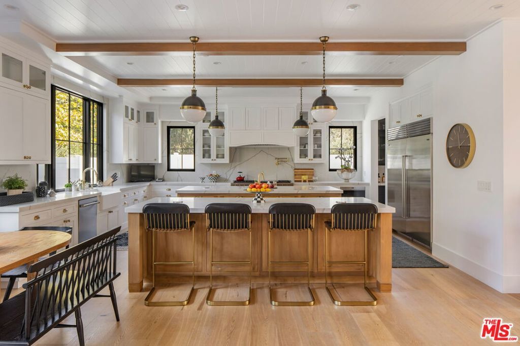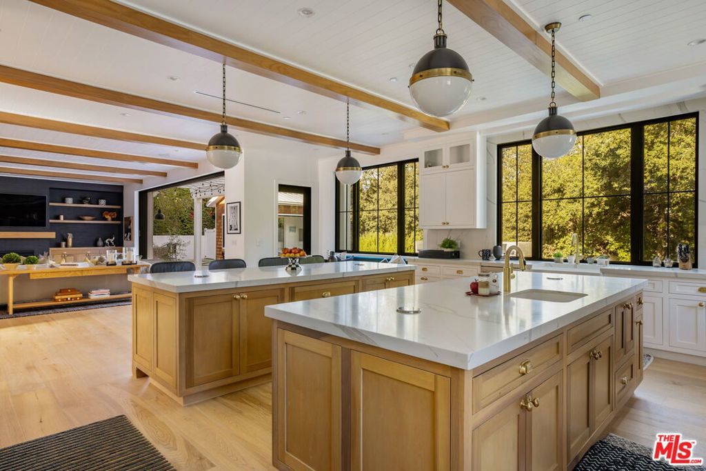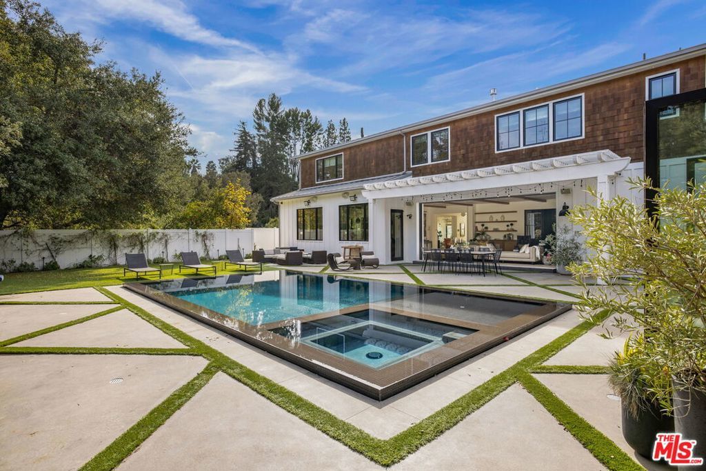 Set at the end of a quiet cul-de-sac on a coveted corner lot in Royal Oaks, this expansive newer-construction residence offers a rare combination of scale, privacy, and thoughtful design in one of Encino's most sought-after neighborhoods. From the moment you enter, the home feels open, elevated, and effortlessly livable. Soaring cathedral-height ceilings with exposed beams, oversized proportions, and abundant natural light define the main living spaces. Designed for both entertaining and everyday living, the two-level floor plan flows seamlessly from formal living and dining rooms into a generous great room with fireplace and sliding pocket glass doors that open to the backyard. The show-stopping chef's kitchen anchors the home with two substantial islands, a walk-in pantry, premium appliances, cozy eating area and ample space to gather with ease. Every living space feels intentionally oversized, including a dedicated home theater, library or study, private office, and a striking walk-in wine cellar. All five bedrooms are en suite, with three spacious secondary suites upstairseach offering walk-in closets and access to upper-level balconies. The primary suite is a true retreat, complete with a sitting room or office, a dramatic two-sided fireplace, and a spa-inspired bath finished in Carrera marble. Outdoors, the property transforms into a private, resort-style setting featuring an oversized turf lawn, expansive patio, fire pit, built-in BBQ, pool house, and a heated infinity-edge pool and spa ideal for year-round enjoyment. Additional highlights include dual-zone HVAC, security and alarm systems, and a three-car garage with glass doors. Ideally located within the Lanai Road Elementary School District and moments from studios, dining, shopping, canyon roads, and major freeways, this home delivers refined Encino living at an exceptional scale.