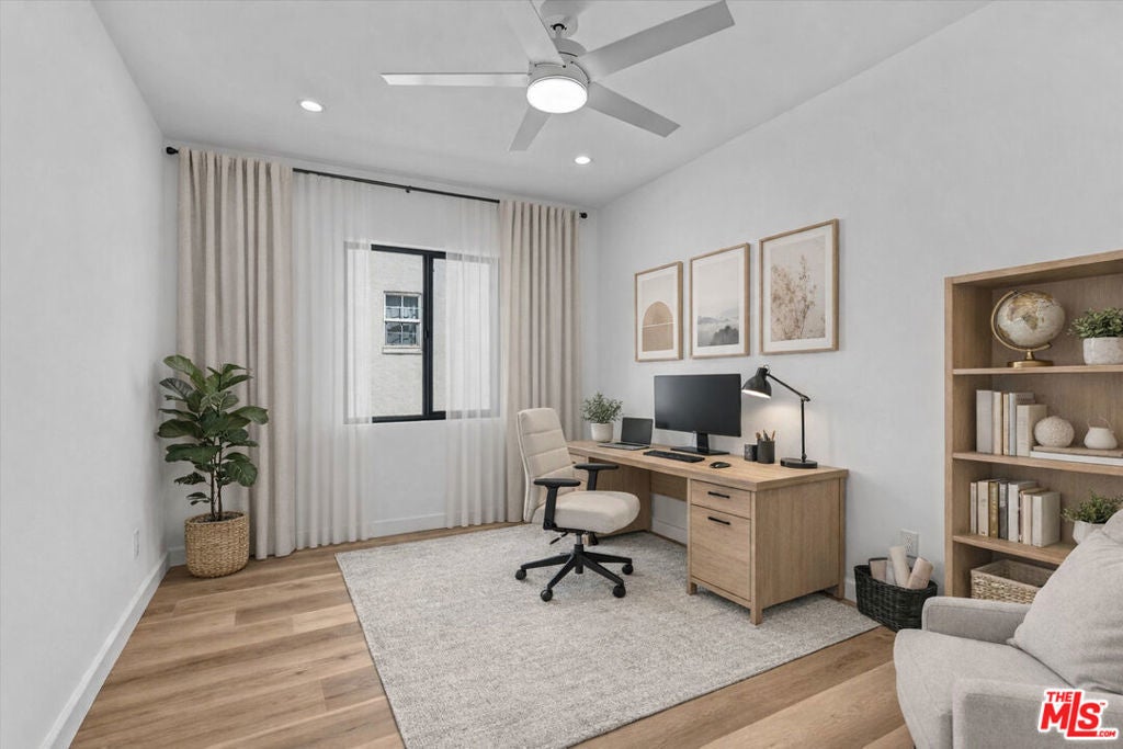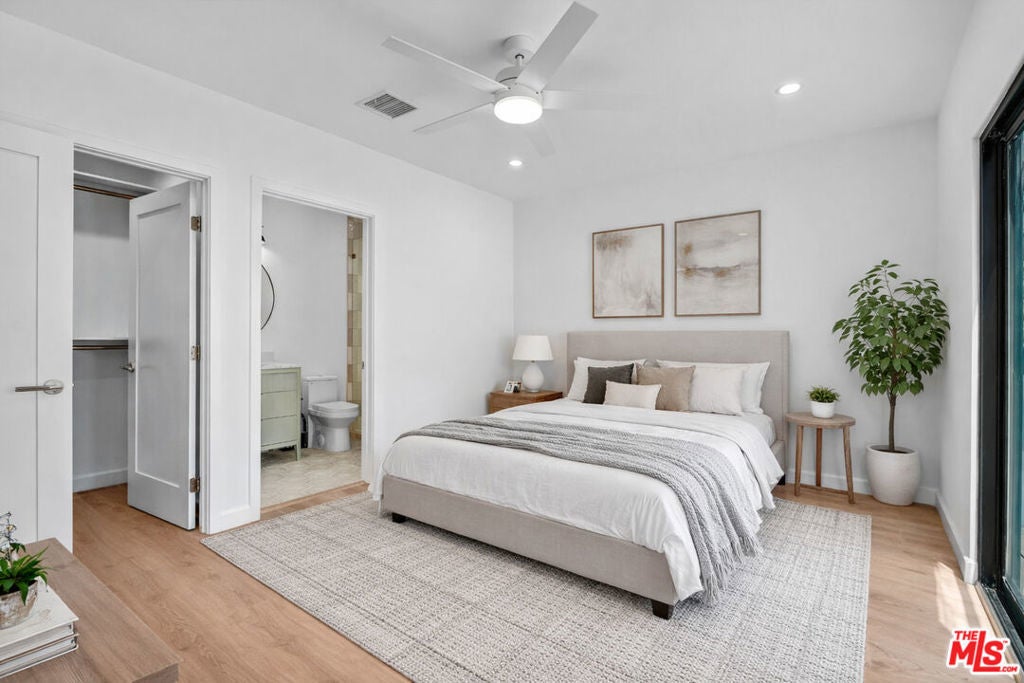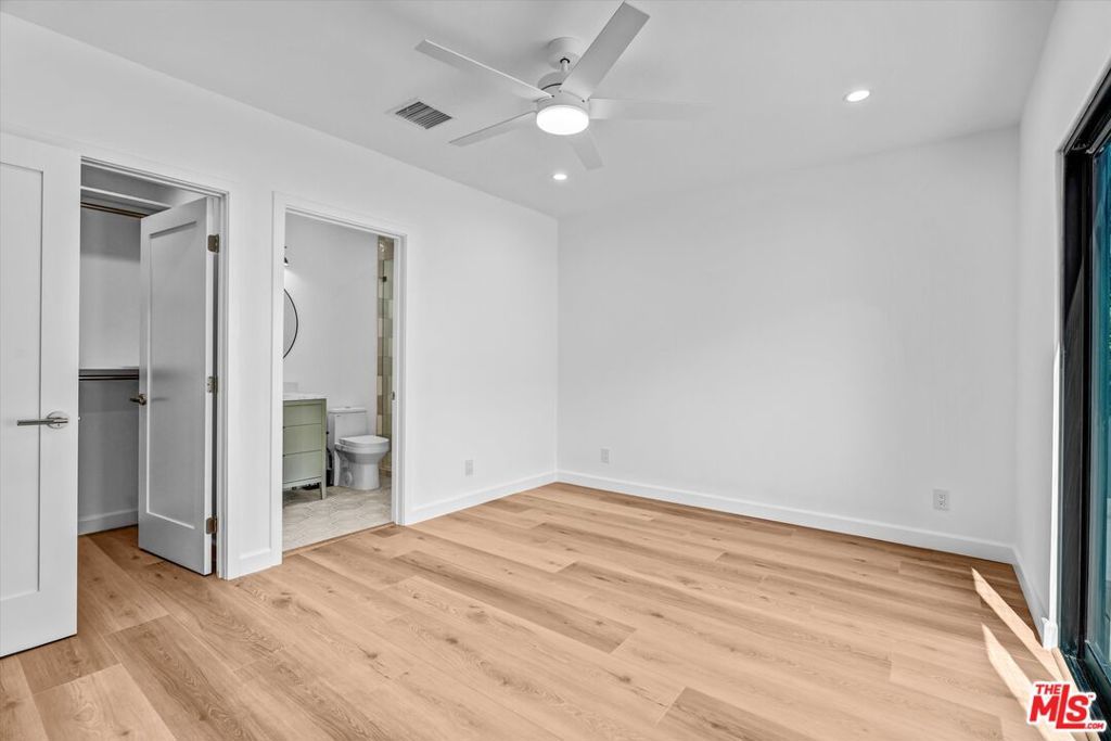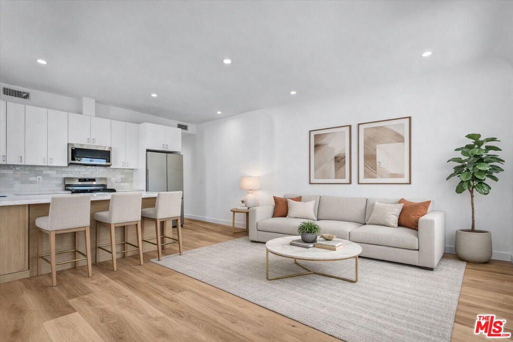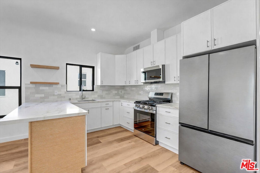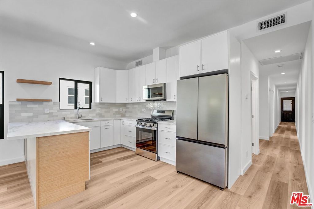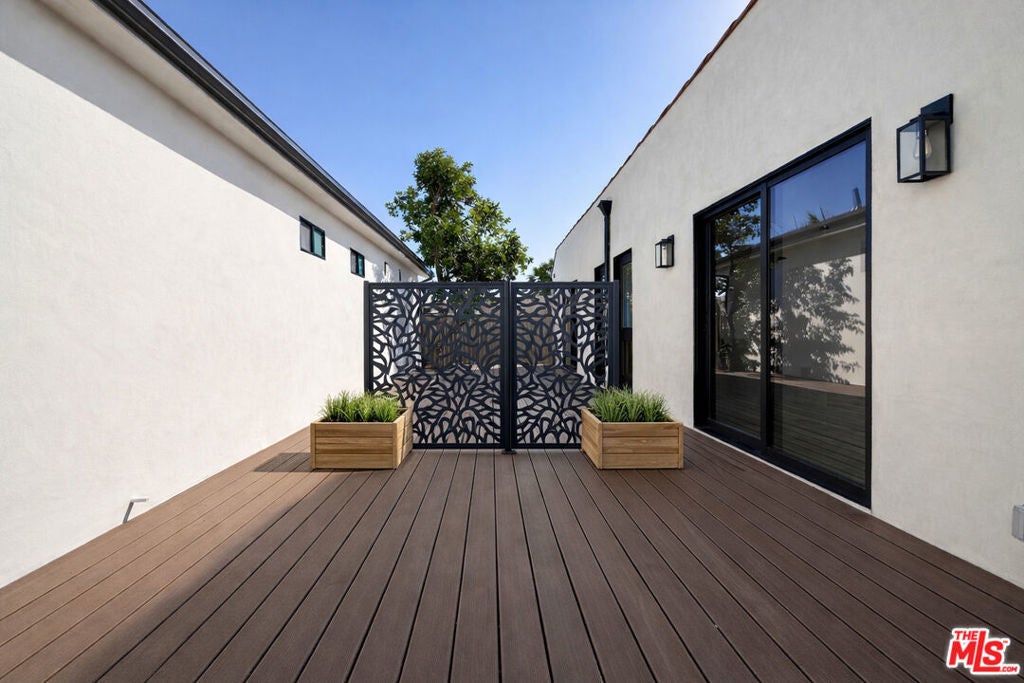 Welcome to this newly constructed, modern 3-bedroom, 2-bath residence in a side-by-side duplex. Thoughtfully designed to feel like a single-family home, this unit shares only a hallway wall - keeping bedrooms private, quiet and well-separated from the neighboring residence. Step inside to a bright, open-concept layout filled with natural light - perfect for both everyday living and effortless entertaining. The sleek, contemporary kitchen features quartz countertops, custom cabinetry and stainless steel appliances, blending style with functionality.The primary suite offers a serene retreat with a beautifully finished en-suite bathroom and walk-in closet. Two additional bedrooms provide flexibility for guests, a home office or a growing household. Both bathrooms are outfitted with designer fixtures and clean, modern finishes. Enjoy your own private outdoor deck - ideal for al fresco dining, relaxing or hosting. Additional highlights include in-unit laundry, energy-efficient systems and two car driveway parking. Ideally located in the heart of Los Angeles, just moments from premier shopping, dining and entertainment, this turnkey home delivers elevated, contemporary living in one of the city's most desirable neighborhoods.