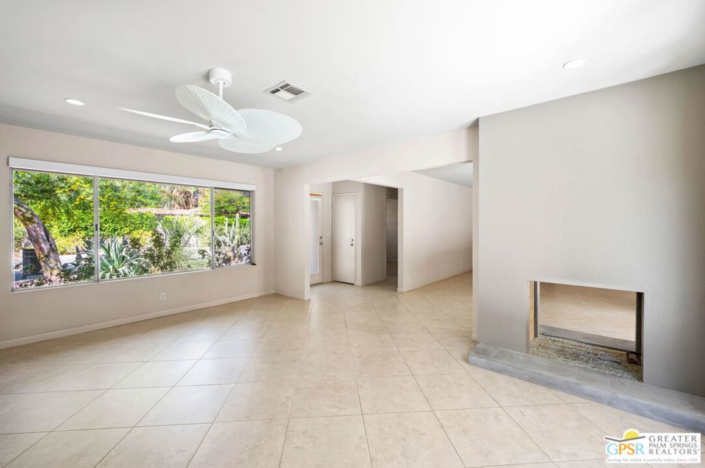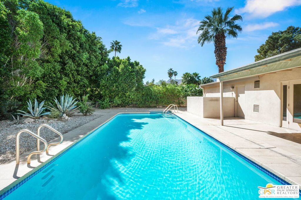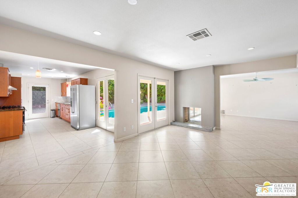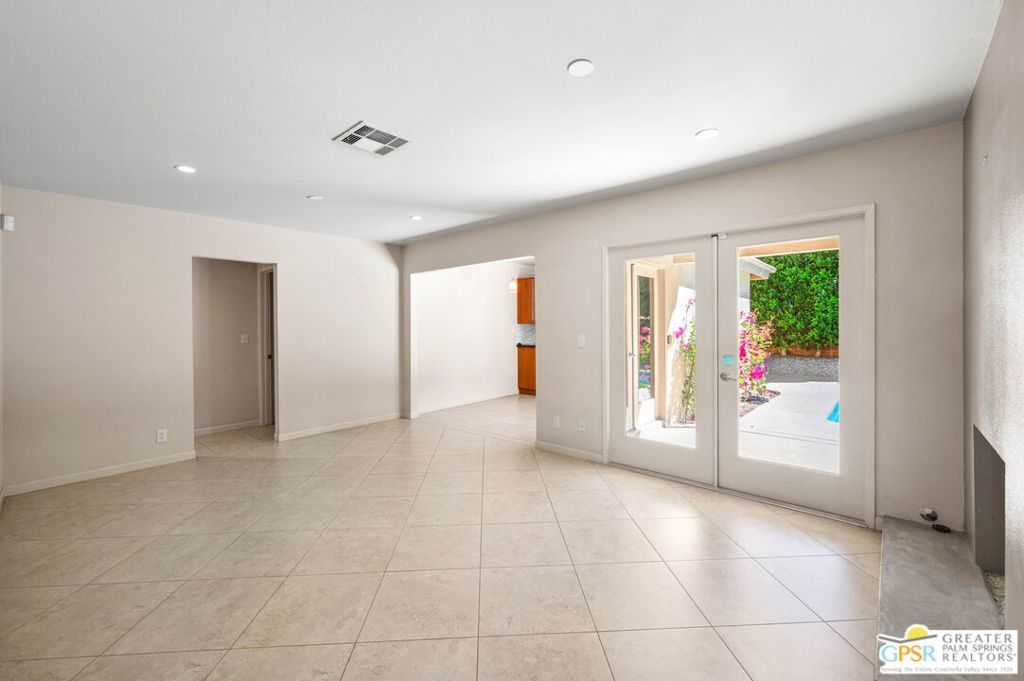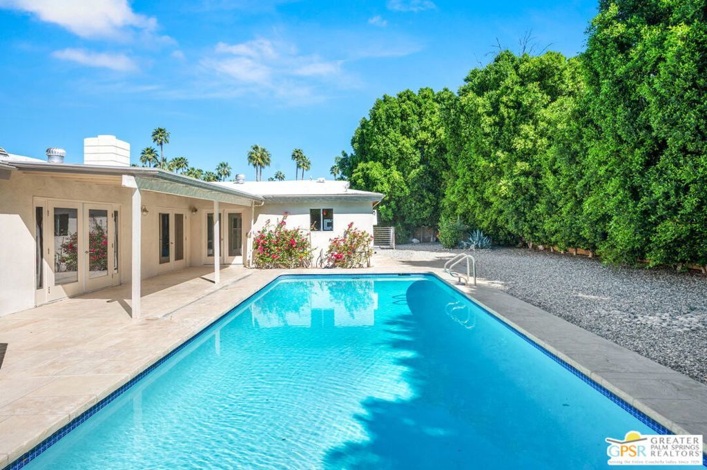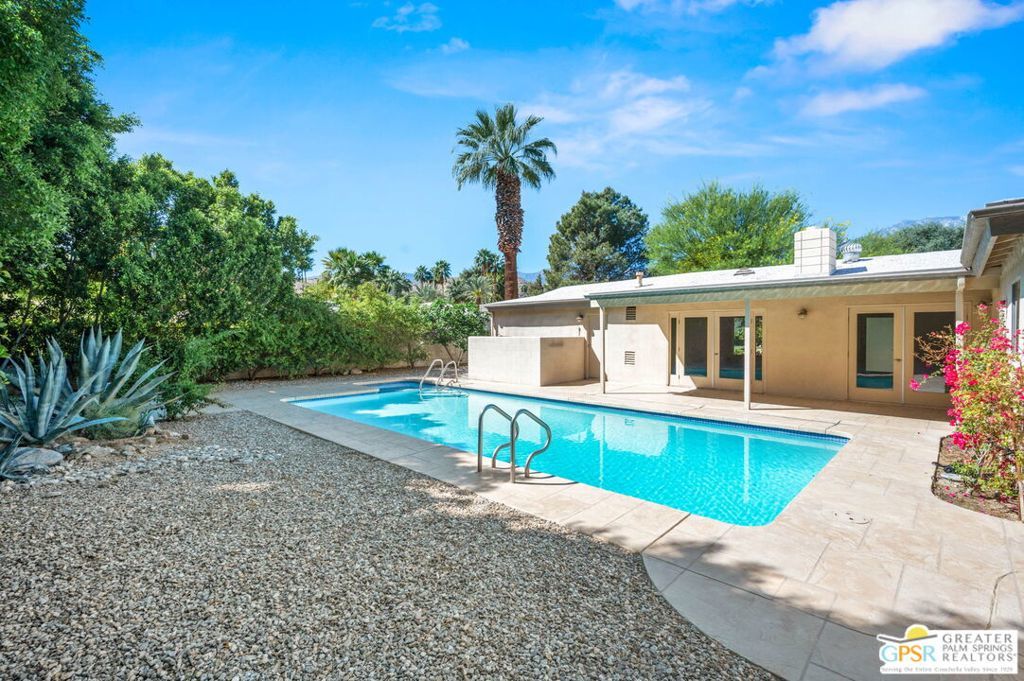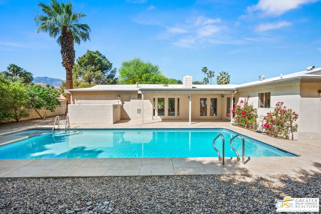 Set along the fairway on a generous, nearly quarter-acre lot, this 1965-built residence blends classic mid-century character with a fresh, modern edge. Clean lines and an open, airy layout set the tone, creating a light-filled environment that feels both relaxed and refined. French doors invite seamless indoor-outdoor living, opening to a private backyard retreat complete with pool and spa, perfect for enjoying desert sunshine and golf course views. Inside, tile flooring flows throughout, complemented by recessed lighting that enhances the home's bright, contemporary feel. The kitchen offers both style and function with stainless steel appliances, granite countertops, and a sleek glass tile backsplash. A dual-sided fireplace anchors the living and family rooms, adding warmth and architectural interest to the central gathering spaces. Thoughtful upgrades include a tankless water heater, indoor laundry, and dual sinks in the primary suite. The guest bath makes a bold statement with its eye-catching glossy red vanity and additional storage. Outside, the low-maintenance landscaping allows you to spend more time enjoying the setting and less time maintaining it. This home is ready for its next chapter, an ideal opportunity for a buyer to move in, personalize, and make it their own piece of Palm Springs living.