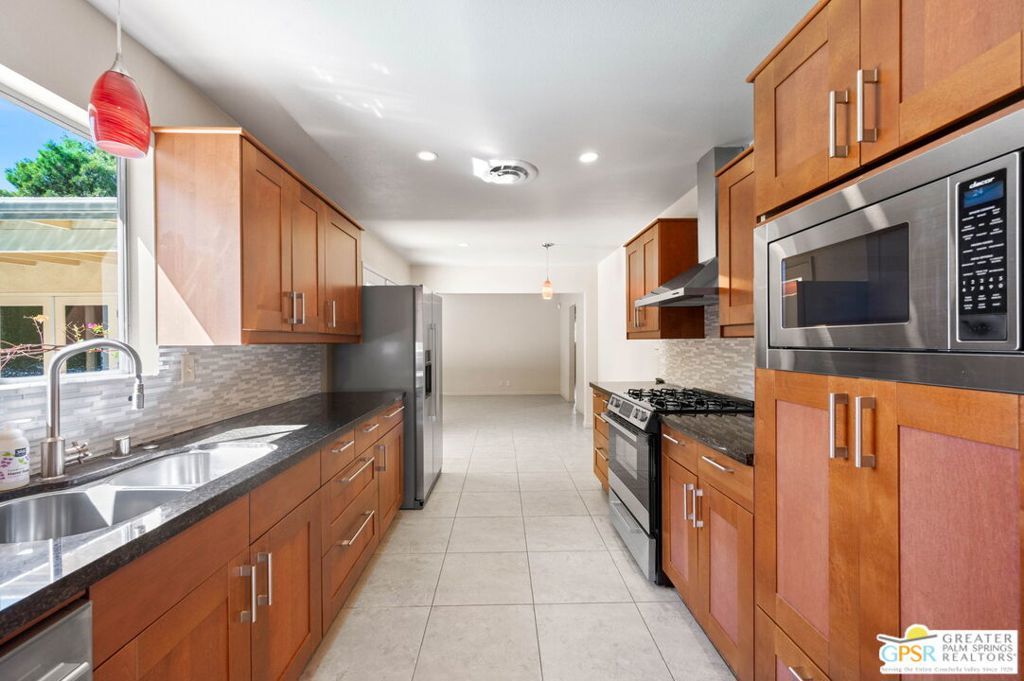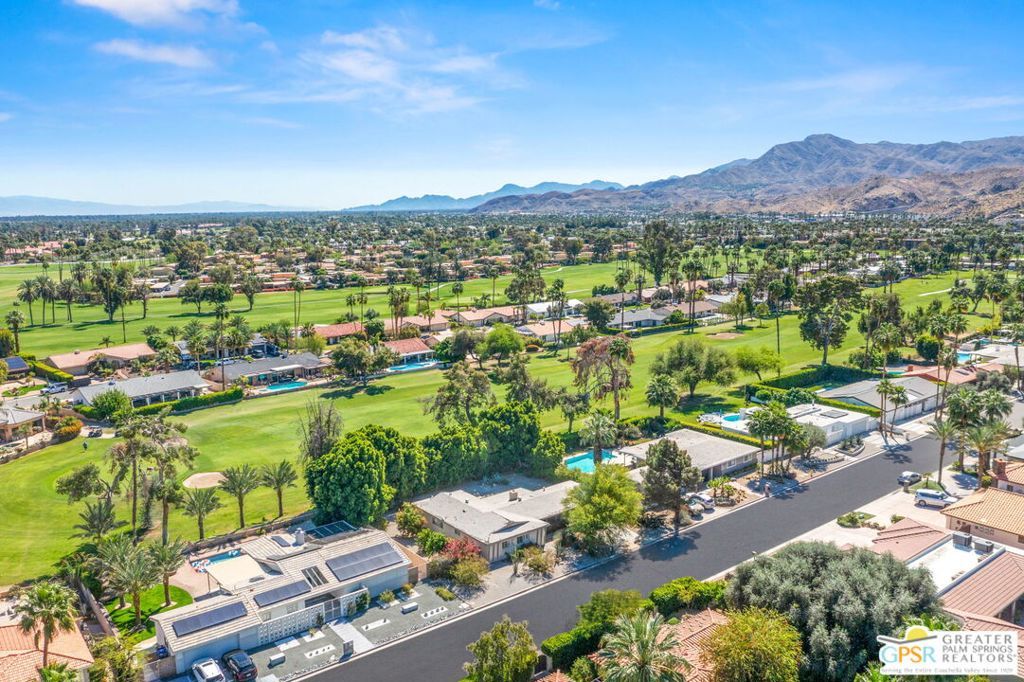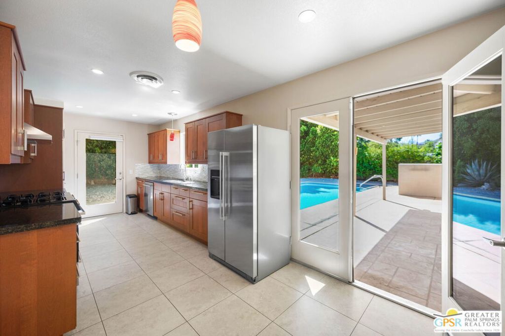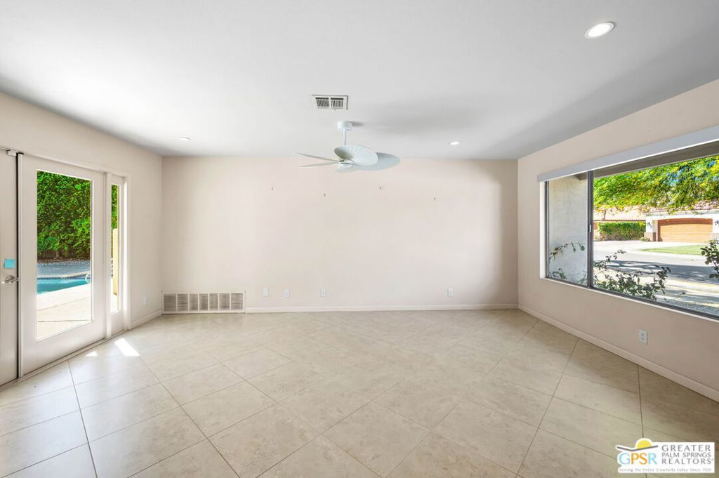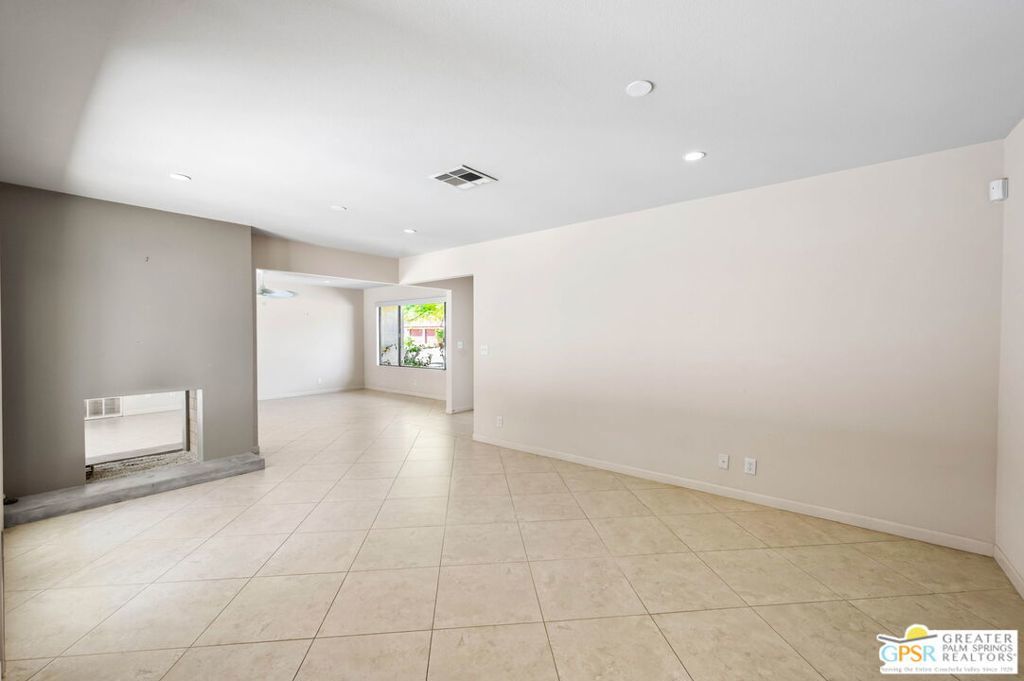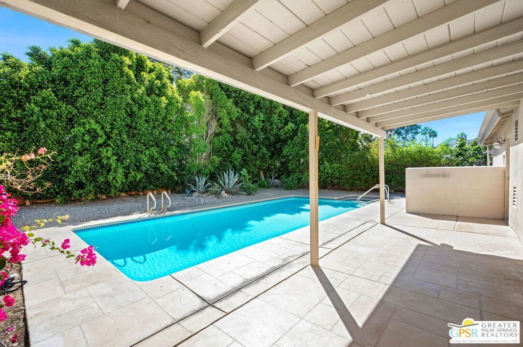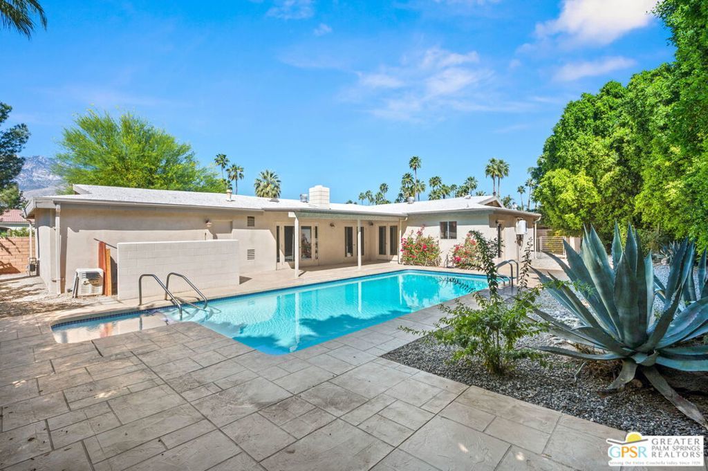 Set along the fairway on a generous, nearly quarter-acre lot, this 1965-built residence blends classic mid-century character with a fresh, modern edge. Clean lines and an open, airy layout set the tone, creating a light-filled environment that feels both relaxed and refined. French doors invite seamless indoor-outdoor living, opening to a private backyard retreat complete with pool and spa, perfect for enjoying desert sunshine and golf course views. Inside, tile flooring flows throughout, complemented by recessed lighting that enhances the home's bright, contemporary feel. The kitchen offers both style and function with stainless steel appliances, granite countertops, and a sleek glass tile backsplash. A dual-sided fireplace anchors the living and family rooms, adding warmth and architectural interest to the central gathering spaces. Thoughtful upgrades include a tankless water heater, indoor laundry, and dual sinks in the primary suite. The guest bath makes a bold statement with its eye-catching glossy red vanity and additional storage. Outside, the low-maintenance landscaping allows you to spend more time enjoying the setting and less time maintaining it. This home is ready for its next chapter, an ideal opportunity for a buyer to move in, personalize, and make it their own piece of Palm Springs living.