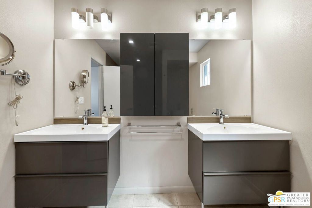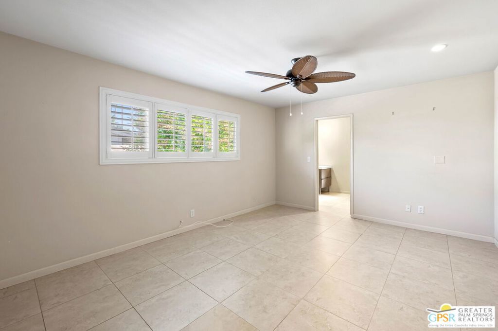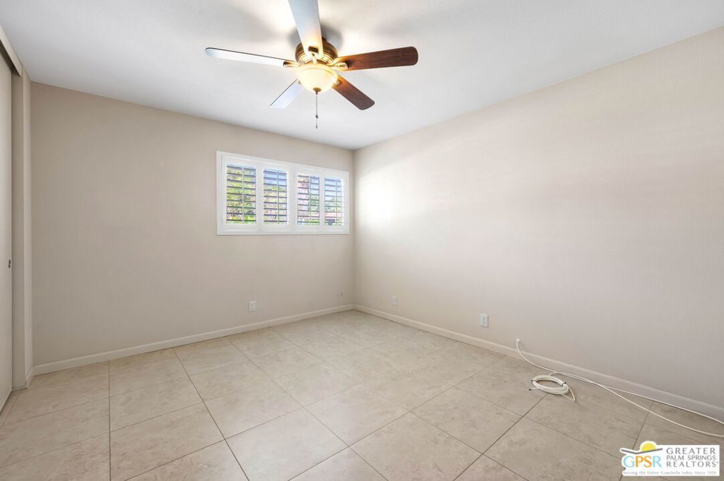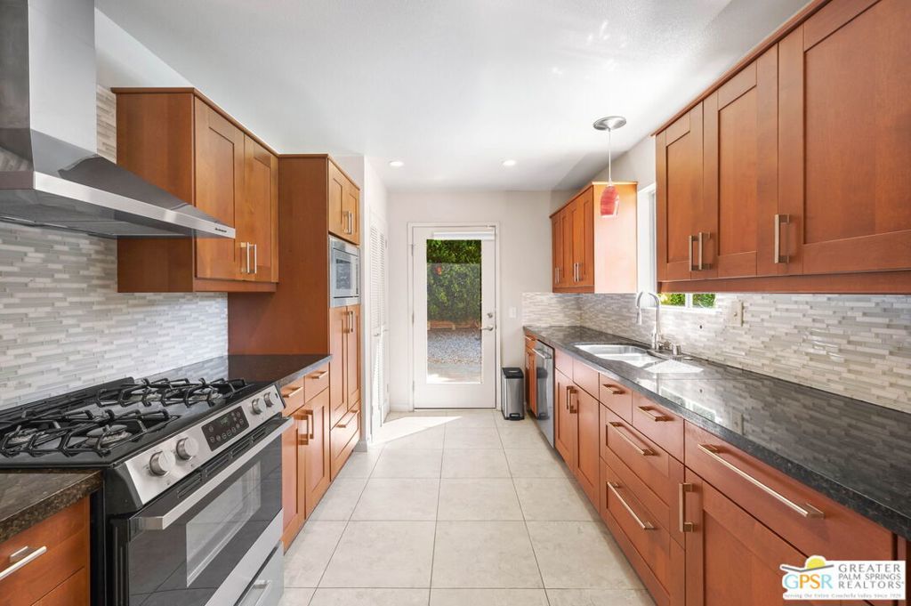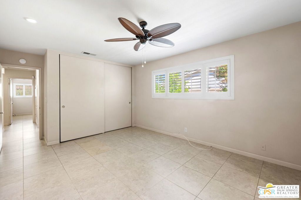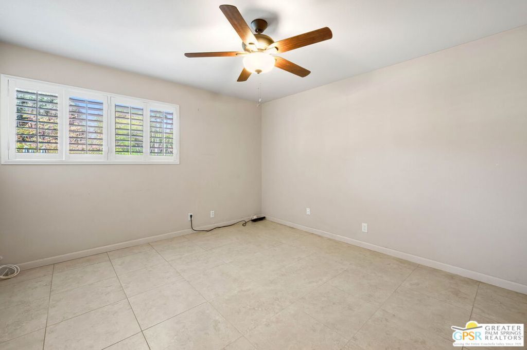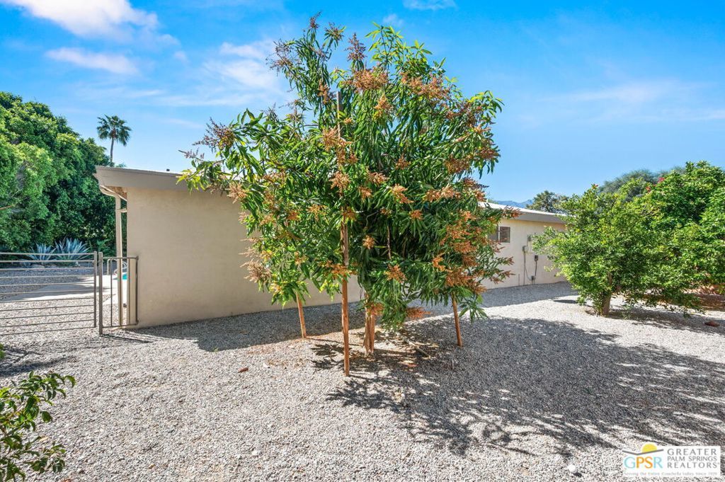 Set along the fairway on a generous, nearly quarter-acre lot, this 1965-built residence blends classic mid-century character with a fresh, modern edge. Clean lines and an open, airy layout set the tone, creating a light-filled environment that feels both relaxed and refined. French doors invite seamless indoor-outdoor living, opening to a private backyard retreat complete with pool and spa, perfect for enjoying desert sunshine and golf course views. Inside, tile flooring flows throughout, complemented by recessed lighting that enhances the home's bright, contemporary feel. The kitchen offers both style and function with stainless steel appliances, granite countertops, and a sleek glass tile backsplash. A dual-sided fireplace anchors the living and family rooms, adding warmth and architectural interest to the central gathering spaces. Thoughtful upgrades include a tankless water heater, indoor laundry, and dual sinks in the primary suite. The guest bath makes a bold statement with its eye-catching glossy red vanity and additional storage. Outside, the low-maintenance landscaping allows you to spend more time enjoying the setting and less time maintaining it. This home is ready for its next chapter, an ideal opportunity for a buyer to move in, personalize, and make it their own piece of Palm Springs living.