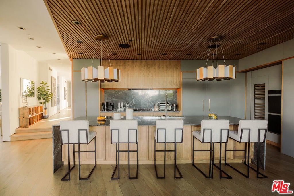 An unparalleled retreat offering complete privacy along Mulholland Drive. A private driveway leads into the secure, one-of-a-kind, gated compound with breathtaking 220-degree views, ensuring seclusion, splendor, and exclusivity. The home features 6 bedrooms, 6 bathrooms, and timeless sophistication. Upon arrival at the gated motor court, a striking waterfall greets you, accompanied by a double and single garage and additional parking. Entering through a pivot door, every room opens into expansive views. The main floor is designed for entertaining, offering formal and casual living spaces, a dining room, and an en-suite bedroom with European oak floors throughout. The kitchen embodies refined elegance, featuring bleached walnut and elephant grey paneling, a 36-inch sink, Thermador and Wolf appliances, two dishwashers, a dual-zone wine fridge, and a spacious hidden walk-in pantry. The upper floor, accessible from east and west wing staircases, includes the spacious primary suite, 3 additional en-suite bedrooms, an office, and a laundry room. The primary suite boasts two expansive walnut-clad walk-in closets, a luxurious bathroom with leathered marble finishes, and a private living area with wrap-around balconies. The outdoor spaces are highlighted by an infinity pool, a large grassy al fresco dining area, and mature oak trees that frame the panoramic views, harmonizing the home with its natural surroundings. This residence epitomizes privacy, natural beauty, and impeccable design.