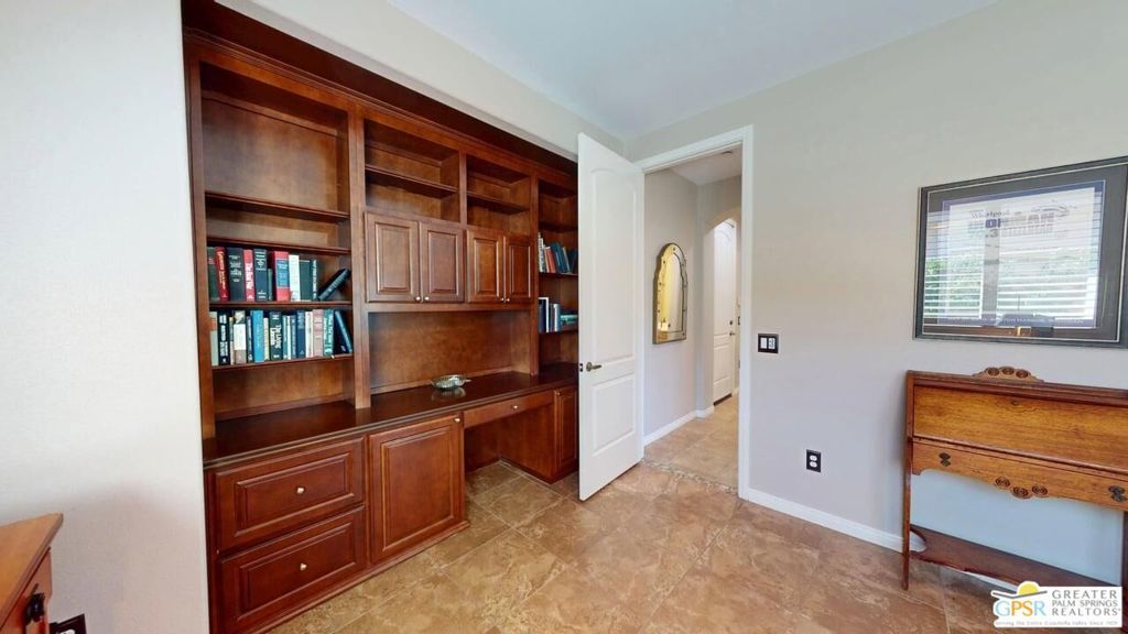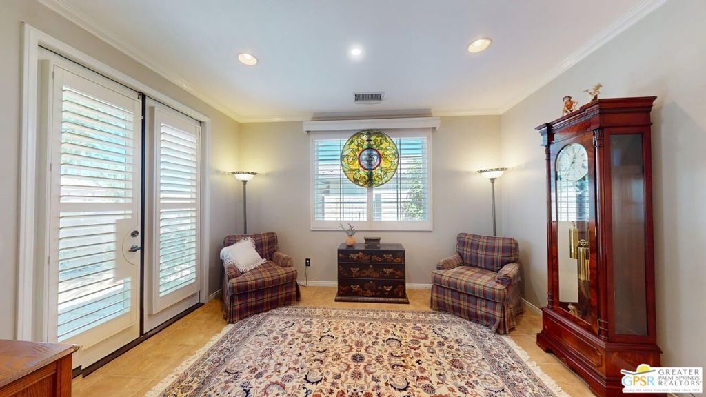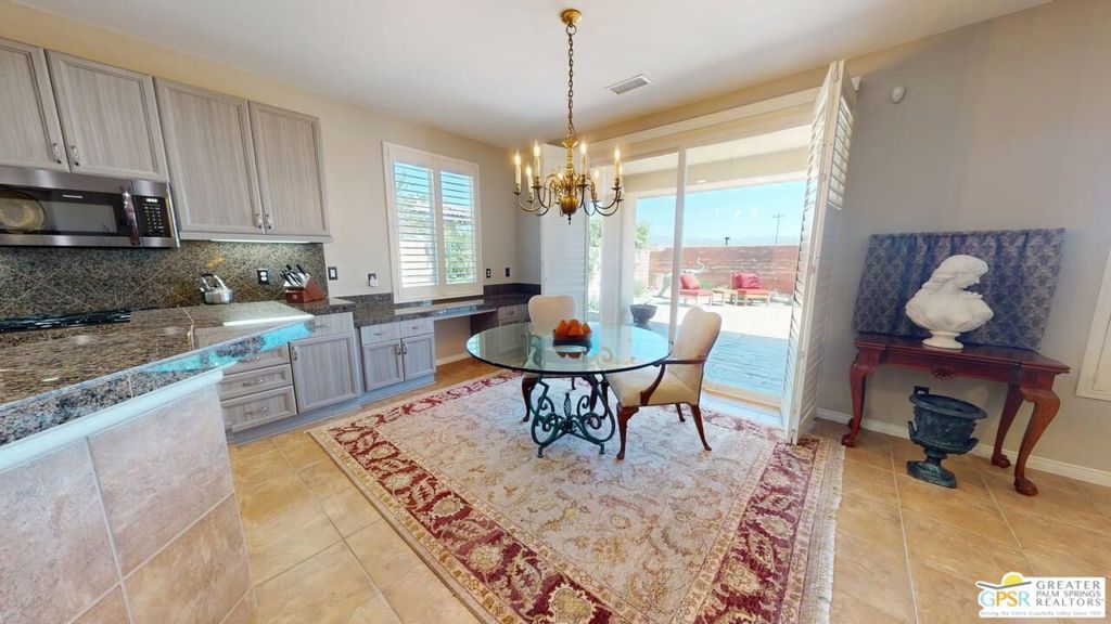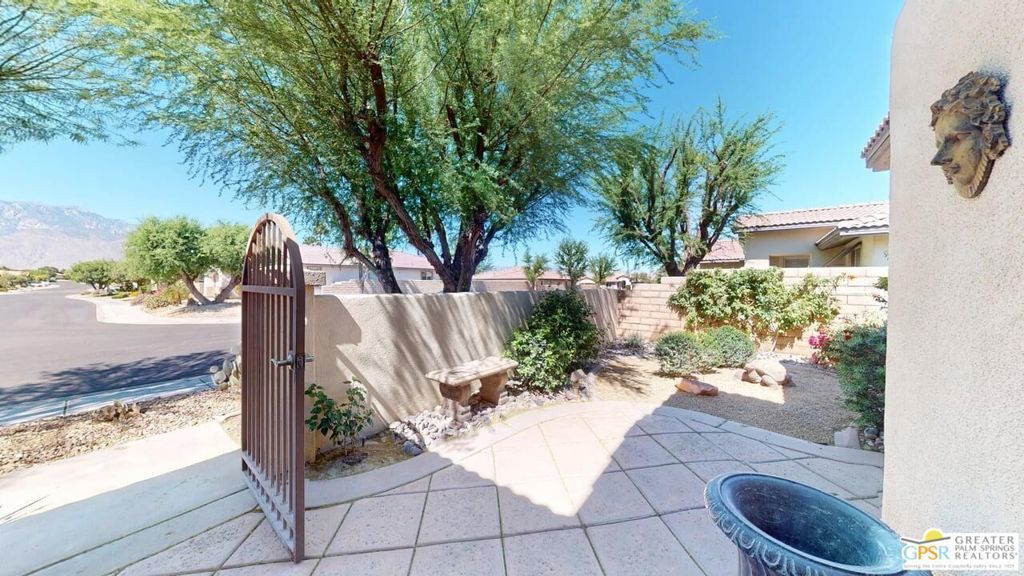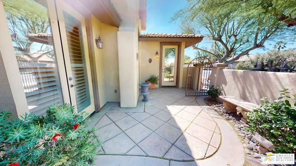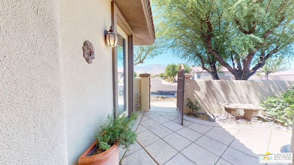 OWNED SOLAR! Beautifully maintained and tastefully updated for comfort and energy efficiency. This 3 Bedroom and 3 Bath, 2184sf, single level home is located in the gated community of Tuscany at Rancho Mirage. This home features 9' ceilings and custom tile floors throughout. The solar tubes in the 3 bathrooms, hallway, laundry room and garage bring in an abundance of natural light. The plantation shutters and Low E glass are both stylish and energy efficient. The updated Chef's Kitchen features custom stainless steel appliances and granite counters and double oven with convection. The cabinet doors and drawers throughout the home are all soft close. The Great Room features a fireplace with tiled surround and hearth and a custom built-in TV cabinet. 5 closets have custom organizers as well as the garage. The Casita, with its updated bath, has its own private entrance from the front patio. The hall bath has been updated as well. This home has a stunning unobstructed view of Mt. San Jacinto from the Casita, the Den and the very private walled and gated front patio. At the rear of the home is an in-ground saltwater Pebble Tec pool and spa with waterfall and both are heated with their own solar thermal collectors and a backup gas heater. There are three majestic 30 foot tall Palms near the pool as well as four other trees on the property. The third bedroom is currently being used as an office with custom built desk and cabinetry. The ceiling fans throughout have all been upgraded. The primary suite has access to the pool and quartzite tiled patio. The primary bath includes the stall shower, the soaking tub, double vanity, water closet and a spacious closet. The HOA is a very reasonable $235.00 per month that includes cable and internet. Tuscany also includes a park, the community pool and spa and dog park!