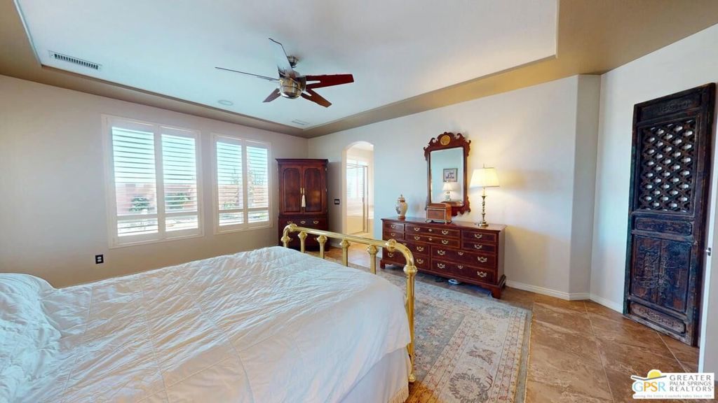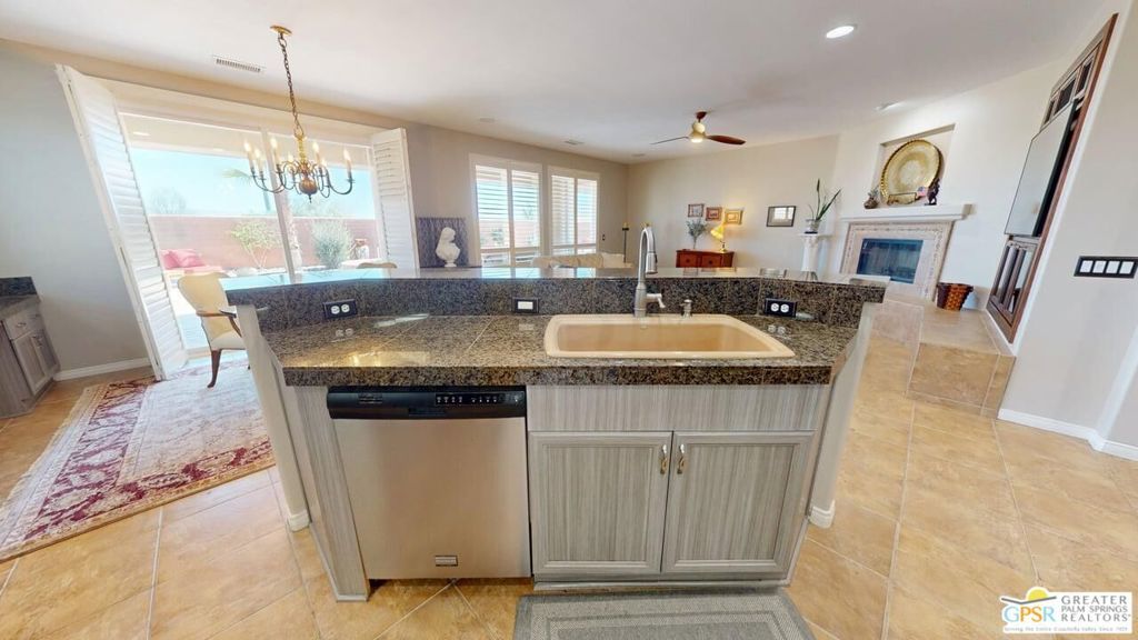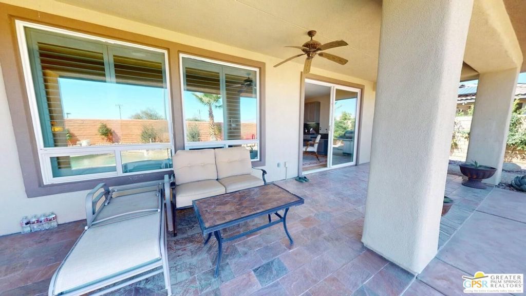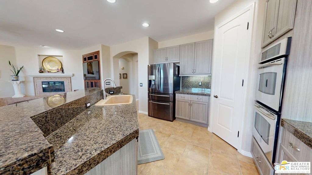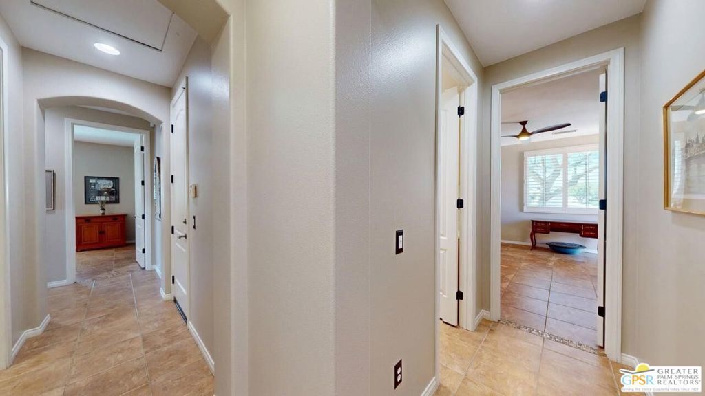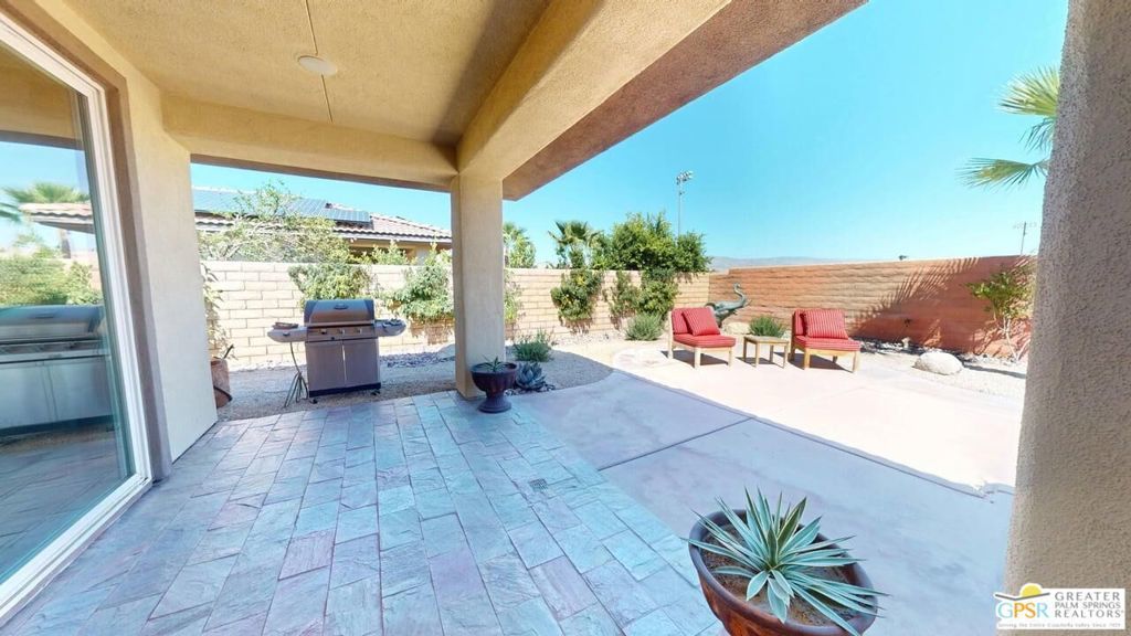 OWNED SOLAR! Beautifully maintained and tastefully updated for comfort and energy efficiency. This 3 Bedroom and 3 Bath, 2184sf, single level home is located in the gated community of Tuscany at Rancho Mirage. This home features 9' ceilings and custom tile floors throughout. The solar tubes in the 3 bathrooms, hallway, laundry room and garage bring in an abundance of natural light. The plantation shutters and Low E glass are both stylish and energy efficient. The updated Chef's Kitchen features custom stainless steel appliances and granite counters and double oven with convection. The cabinet doors and drawers throughout the home are all soft close. The Great Room features a fireplace with tiled surround and hearth and a custom built-in TV cabinet. 5 closets have custom organizers as well as the garage. The Casita, with its updated bath, has its own private entrance from the front patio. The hall bath has been updated as well. This home has a stunning unobstructed view of Mt. San Jacinto from the Casita, the Den and the very private walled and gated front patio. At the rear of the home is an in-ground saltwater Pebble Tec pool and spa with waterfall and both are heated with their own solar thermal collectors and a backup gas heater. There are three majestic 30 foot tall Palms near the pool as well as four other trees on the property. The third bedroom is currently being used as an office with custom built desk and cabinetry. The ceiling fans throughout have all been upgraded. The primary suite has access to the pool and quartzite tiled patio. The primary bath includes the stall shower, the soaking tub, double vanity, water closet and a spacious closet. The HOA is a very reasonable $235.00 per month that includes cable and internet. Tuscany also includes a park, the community pool and spa and dog park!