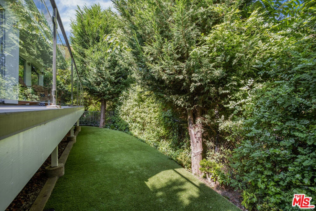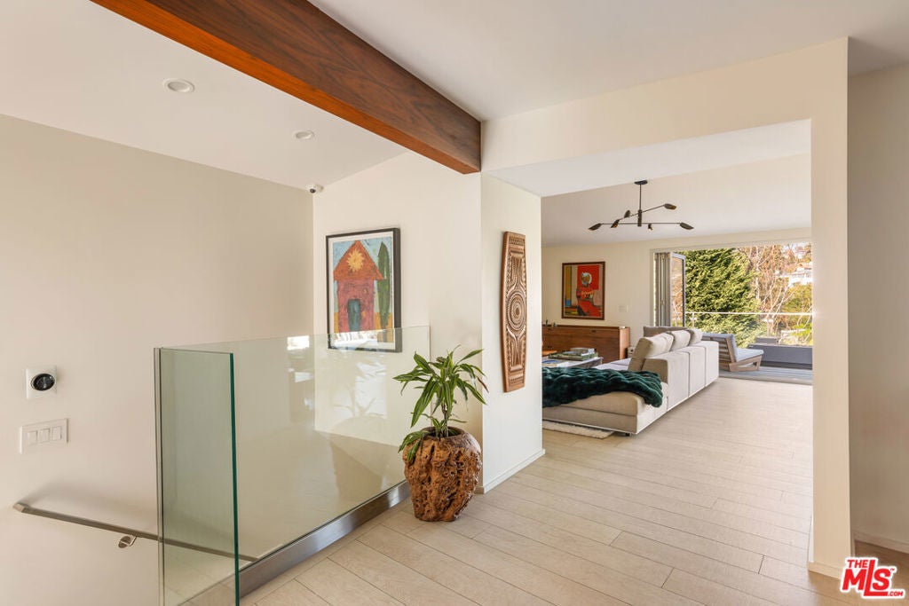Located in the coveted Santa Monica Canyon, this reimagined coastal contemporary blends mid century character with sleek modern design in one of the Westside's most prestigious enclaves. Designed for seamless indoor outdoor living, it's a home that delivers both everyday comfort and year round entertaining in equal measure. The main level features a dramatic living room with soaring ceilings, a fireplace, custom built cabinetry, a statement fireplace, and walls of glass framing serene treetop and canyon views. Accordion glass doors fold open to create a fluid connection to the outdoors, where expansive decks invite relaxation in the coastal breeze. The open concept kitchen and dining area feature bespoke walnut cabinetry, skylights, built in bar shelving, and top tier stainless steel appliances, skylights, with direct access to an outdoor lounge deck. A full bedroom and bathroom, currently styled as a home office, complete this level. The lower level offers three spacious en suite bedrooms, including a serene primary suite with a private balcony overlooking the grassy yard. The spa inspired bath is appointed with a freestanding tub, walk in shower, and a brand new custom vanity. Two additional suites provide generous accommodations for family or guests. Features & Upgrades include a Whole House Filtration System for pure, clean water throughout, a Battery Backup Power Supply ensuring seamless comfort and security, an EV Charger for effortless electric vehicle convenience, and a two car garage with ample storage. Unmatched access to the best of coastal living: moments to the beach, Ocean Avenue bluffs, and Santa Monica Stairs. Stroll to Montana Avenue boutiques, artisan coffee shops, and award winning dining or head minutes north to Palisades Village and Malibu. The home sits within the highly acclaimed Canyon Charter Elementary School district, in a leafy enclave prized for its walkability, privacy, and sea salt air.