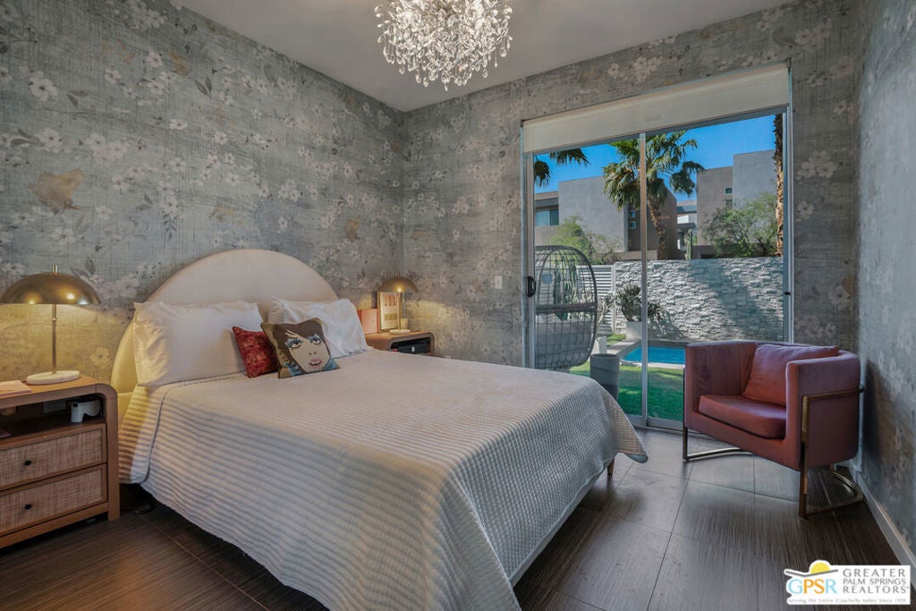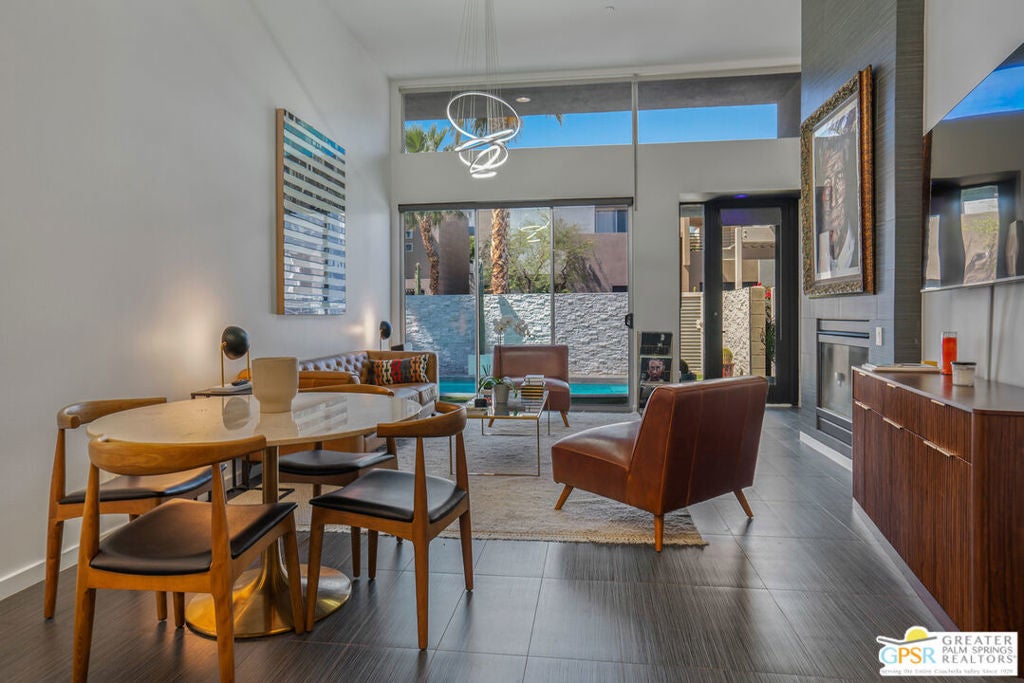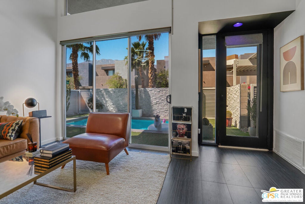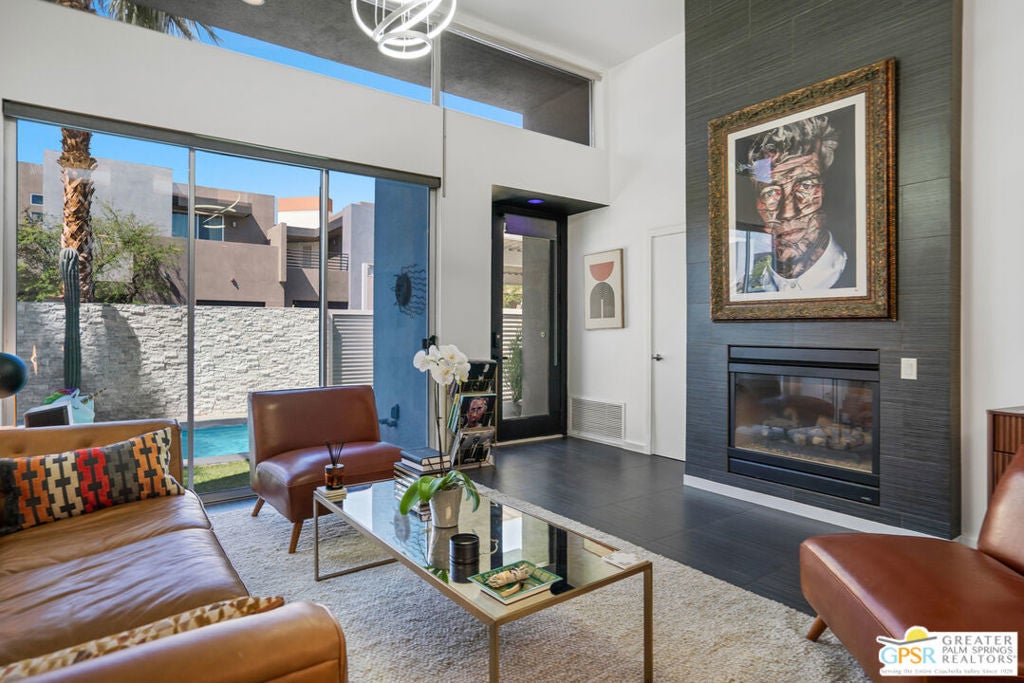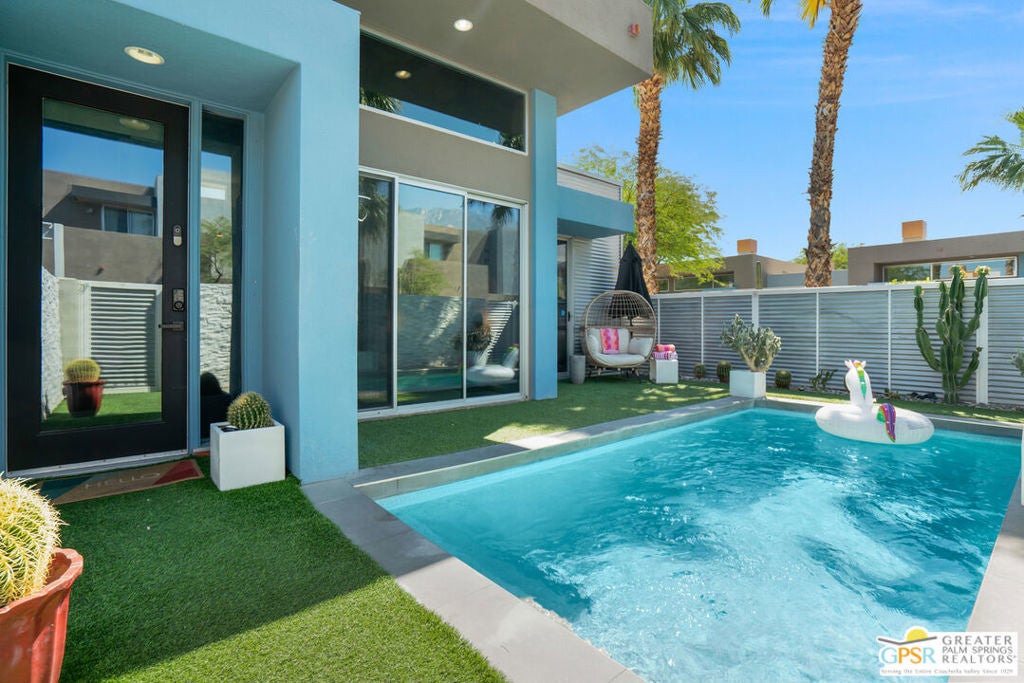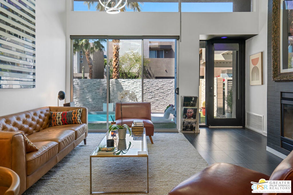 Welcome home to your Pied--terre in Palm Springs! This lovely, private, single story, 2 beds, 2 baths, with saltwater pool-- is ready to move right in. Tasteful finishes and perfect flow. Bedrooms on either side of common area, again, fantastic privacy. On a corner lot, one of 6 of it's kind. Wonderful double-sided fireplace. New HVAC, newer pool equipment. Laundry in unit. Community amenities include 2 pools, 2 spas, gym, and clubhouse. Gated and secure. Great for full-time occupancy, long-term rental, or just a week-ender getaway.