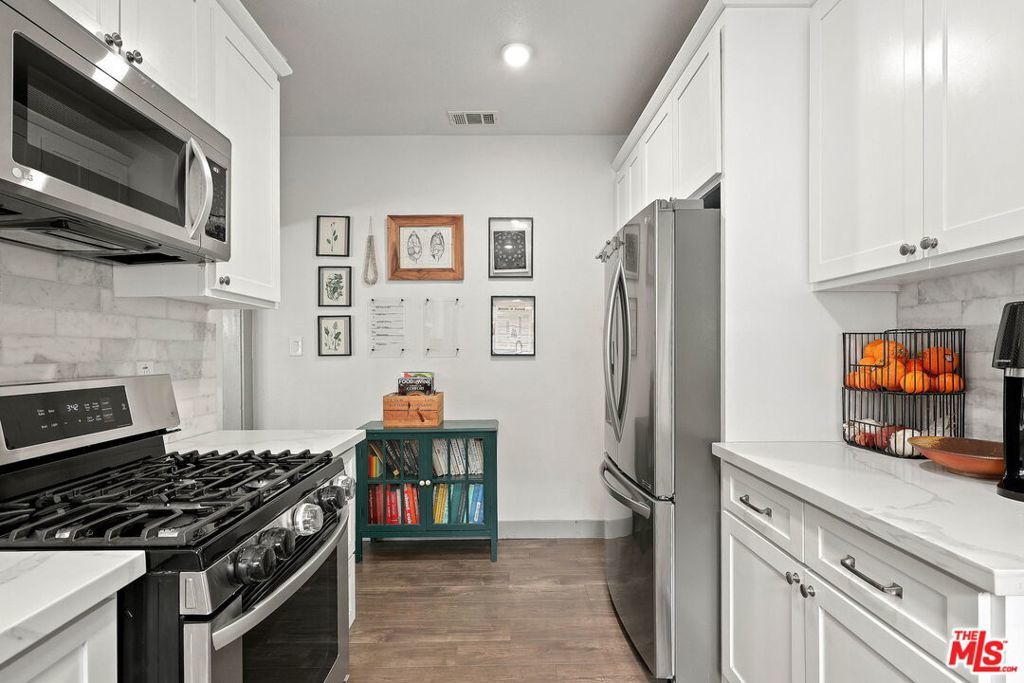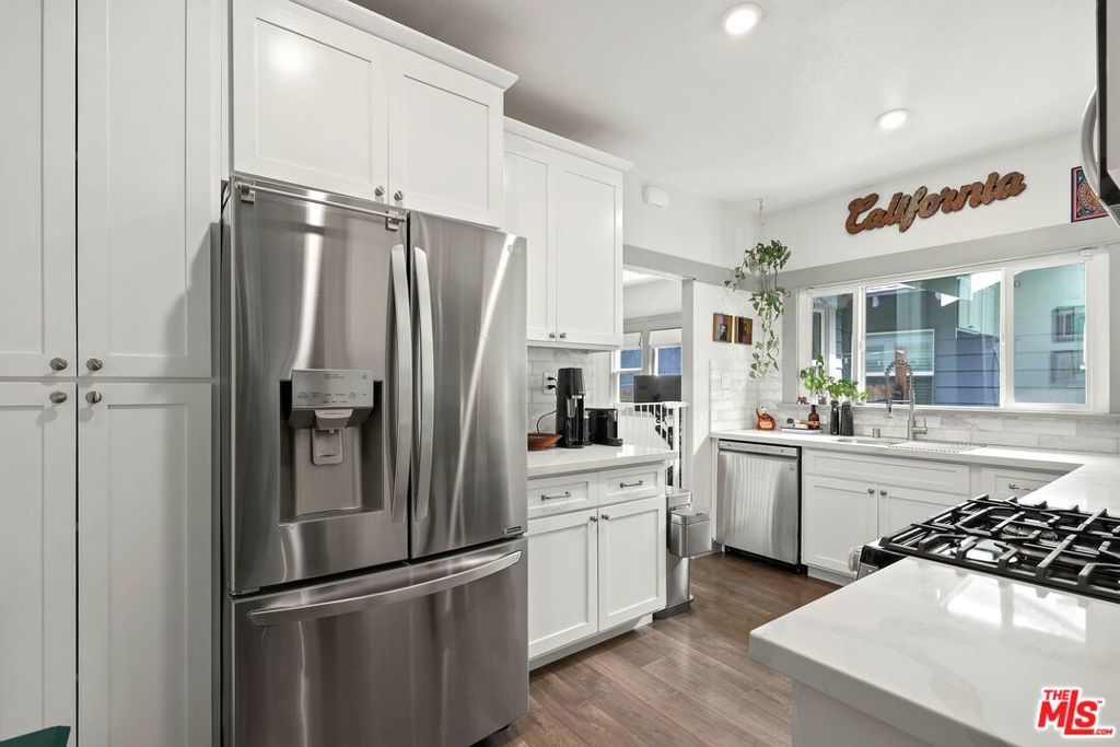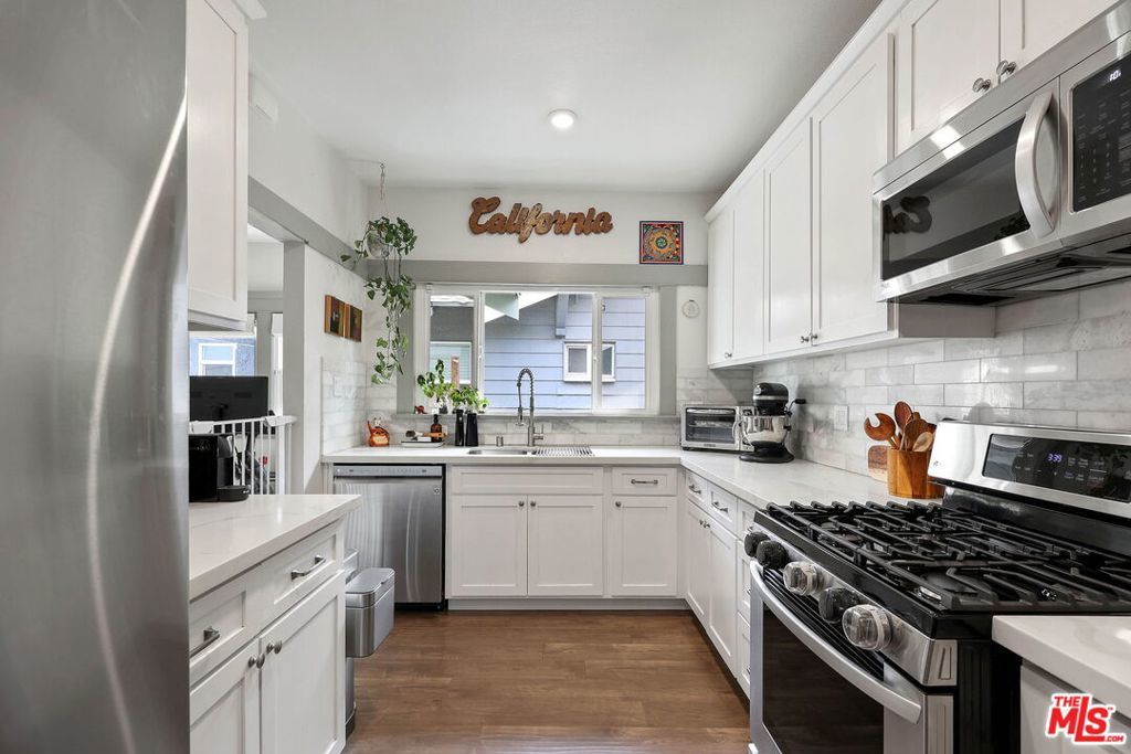 Nestled among a row of classic Craftsman homes, 3878 S Harvard offers a beautifully updated take on this timeless architectural style. Fully remodeled in 2019, the home preserves its original charm with hallmark details including a spacious front porch, substantial entry door, coffered ceilings, wainscoting, built-ins, and ornate wood-framed windows. Off the living room is the front bedroom or office, with great afternoon light from the West facing window. Two more bedrooms are steps from the dining room, one with an en suite bathroom. The hall bath has dual sinks and separates the bedrooms so they are even more private. The kitchen has plenty of storage, updated stainless steel appliances, and a window over the sink. An office/bonus room stands between the kitchen and the private back bedroom, also with an en-suite bathroom. The laundry is down the hall before you get to the attached garage. There is even a basement for additional storage and SOLAR for a padded electric bill! There is a gate off the back alley to get to the garage and the grassy backyard. Close to BMO Stadium, USC, the Expo Line, DTLA, and central to nearly the whole city, 3878 S Harvard is a tremendous find.