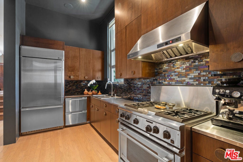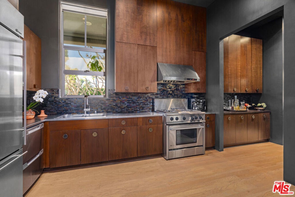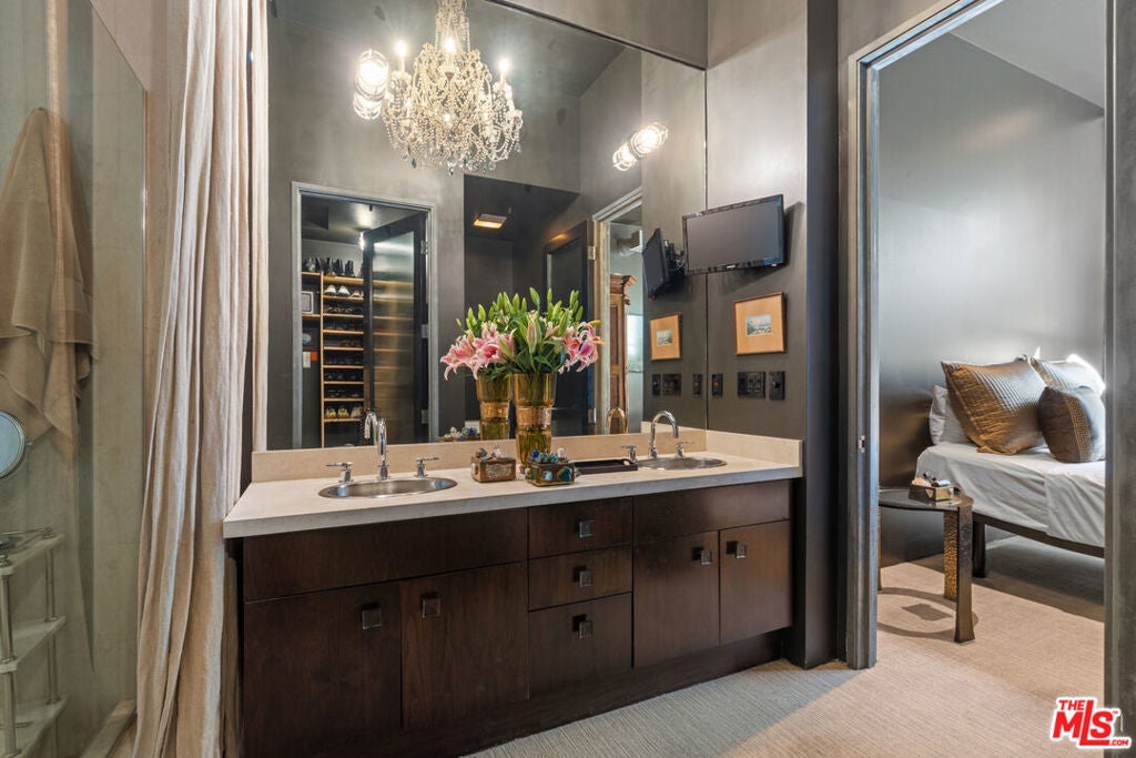 The Lofts at Melrose Place. Discretely located off of West Hollywood's most iconic street, this previously published designer-owned residence places you moments from world-renowned Melrose Place boutiques, cafes, shopping, acclaimed dining and the recognizable Sunday Farmers Market. The setting is a walker's paradise. Located in a prestigious private-ownership building, the property is known for its discretion, strong management and notably low HOA dues. Loft 101 is considered one of the building's most desirable units. Soaring 11.5-foot ceilings create dramatic volume, balanced by a layout that feels both open and refined. It is an entertainer's dream. The interiors have been professionally curated, featuring custom cabinetry, hand-made glass tilework and elegant travertine finishes in the primary bath. Newly refinished white oak floors bring warmth and architectural continuity. Two en-suite bedrooms anchor the floor plan, one styled as a sophisticated home office, while a reimagined service area introduces a pantry, bar and separate laundry room. The spacious primary suite is a perfect sexy retreat. Beyond the interiors, a private terrace overlooks a beautifully landscaped garden. Abundant garage storage and two side-by-side parking spaces complete this polished West Hollywood offering.