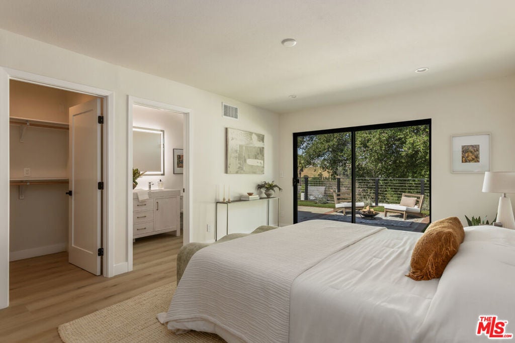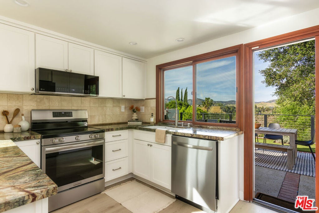 OFFERS DUE MONDAY 3/30 BY 5PM. Located on one of the most coveted streets in Agoura Hills' Hillrise neighborhood, this beautifully reimagined one story Spanish-style residence offers sweeping west-facing views and unforgettable sunset moments. Located on prestigious Deep Shadow Drive, the home captures the essence of California living, where rolling hills meet golden-hour skies. Fully remodeled from top to bottom, this 4BD, 2BA residence spans approximately 1,650SF and showcases thoughtful upgrades throughout, including a new kitchen, new bathrooms, updated roof, 200-amp electrical, central HVAC, new flooring, fresh paint, and refined finishes at every turn. A spacious living room with vaulted ceilings and a statement fireplace welcomes you in, seamlessly flowing into a stunning chef's kitchen open to the dining, designed for both everyday living and entertaining. Outfitted with custom cabinetry, expansive counter space, and top-of-the-line appliances, the kitchen is anchored by a picturesque window framing serene hillside views, bringing the outdoors in with beautiful natural light. The indoor-outdoor connection continues as the kitchen opens directly to your private backyard retreat. Here, you'll find drought-conscious landscaping featuring bougainvillea, lavender, podocarpus and brand new fencing for privacy, complemented by premium AstroTurf and ample space to add a pool. Whether dining al fresco or unwinding at sunset, this backyard is designed for effortless California living. The primary suite showcases a double-door entry, walk in closet, and an ensuite bath featuring a dual-sink vanity and beautiful shower with luxury finishes. Three additional generously sized bedrooms are filled with natural light and greenery, accompanied by a spacious secondary bathroom with dual sinks and a soaking tub. Additional highlights a two-car garage, abundant storage, washer and dryer, recessed lighting, plantation shutters, new doors, updated molding, and newly installed hardscape and landscaping. Ideally positioned between Calabasas and Westlake Village, Agoura Hills offers top-rated schools, amazing hikes, scenic surroundings, and a lifestyle of convenience at an exceptional value.