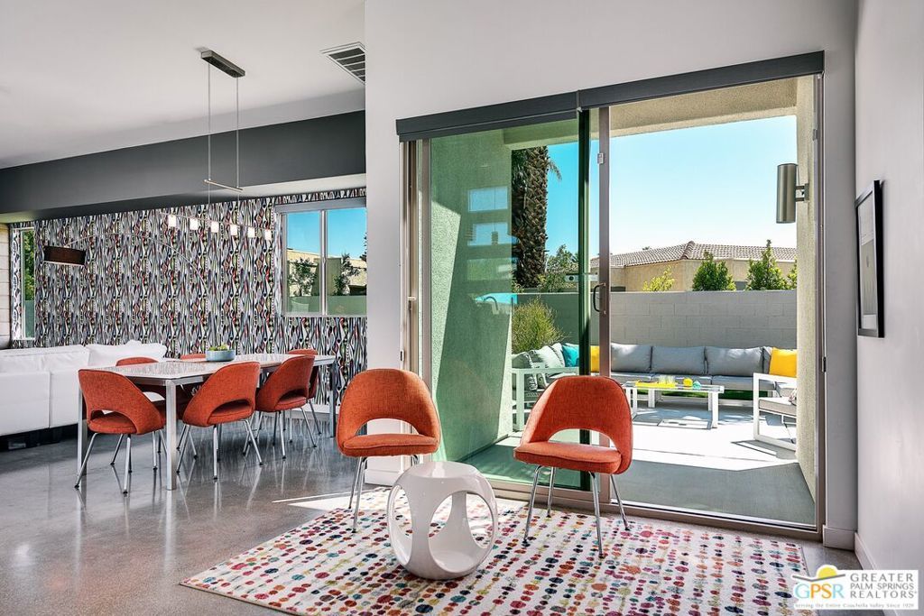 Panoramic mountain views, exceptional privacy, and one of the largest lots in Murano define this stunning modern 3-bedroom, 3-bath residence designed by renowned architect James Cioffi, AIA. Positioned on a premier private corner lot, this home captures sweeping, unobstructed views while offering a rare combination of space, design, and lifestyle with no HOA fees, an owned solar system, and energy-efficient construction resulting in impressively low utility costs. The outdoor experience is truly next level and a standout even within Murano. Fully turfed for low maintenance and year round enjoyment, the expansive grounds are designed for both entertaining and relaxation. Enjoy a resort style pool and spa with custom fire feature, a dedicated bocce court, private putting green, generous side yard for games and gatherings, and an oversized backyard with room to further enhance. Multiple outdoor living areas take full advantage of the views, creating a true desert retreat. Inside, the open concept floor plan is enhanced by vaulted ceilings, clerestory windows, concrete flooring, and walls of glass that flood the home with natural light while seamlessly blending indoor and outdoor living. The primary suite serves as a private retreat featuring direct access to the pool, stunning views, and a spacious bath with dual vanities, walk in shower, soaking tub, and walk in closet. Two additional bedrooms are thoughtfully separated for privacy, including a junior ensuite and a third bedroom with an adjacent full bath. Additional features include a dedicated laundry room with sink and an attached two car garage. Currently operating as a stable and profitable rental, this property also presents a compelling investment opportunity. Whether you're seeking a full time residence, seasonal escape, or income producing asset, this exceptional Murano home delivers on every level with design, privacy, outdoor living, and long term value. Offered Turn Key Fully Furnished.
