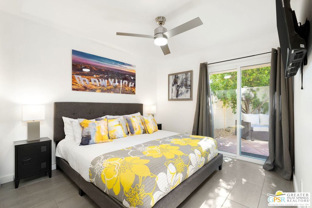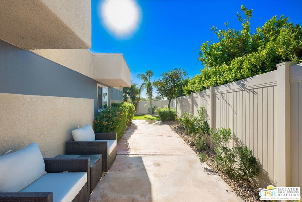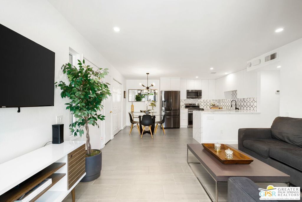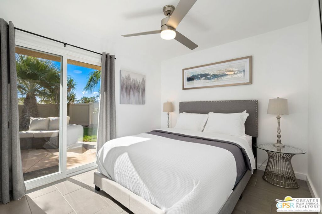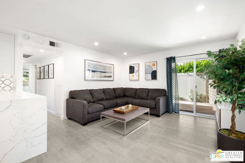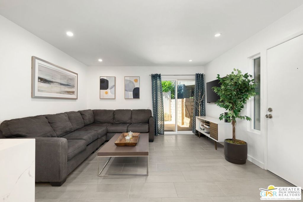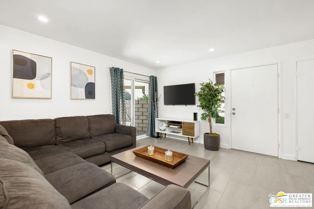 Recently remodeled and move-in ready, this stylish 3-bedroom, 1-bath condo is located in the sought-after gated community of Sunrise Palms in North Palm Springs. Set on 57 lush acres just minutes from downtown, this single-story, duplex-style home offers privacy, modern design, and access to an impressive list of amenities. Step inside to discover an open-concept living space with new flooring throughout, custom kitchen cabinetry, quartz countertops, new stainless appliances, and recessed lighting. The spa-like bathroom features a walk-in tiled shower and dual vanity, and all three bedrooms are well-sized with thoughtful finishes. Enjoy seamless indoor-outdoor living with a fully gated and landscaped private yard complete with orange trees, desert plants, and a large patio perfect for relaxing or entertaining. The home also includes a one-car garage, in-unit washer and dryer, and a brand-new HVAC system. Community amenities include 8 sparkling pools and spas, tennis, basketball and pickleball courts, and acres of green space. Sunrise Palms is centrally located near top dining, shopping, golf, and galleries, offering the ultimate Palm Springs lifestyle. Bonus: Currently operating as a successful vacation rental with seasonal bookings from October 2025 through April 2026 at $4,000 per month. New owner may choose to honor this income stream. A new solar system has been designed and is currently going through the planning stages. Combined with the new HVAC system, this home is well-positioned to be energy-efficient and cost-effective for years to come. The home is offered fully furnished and turn-key just bring your suitcase.