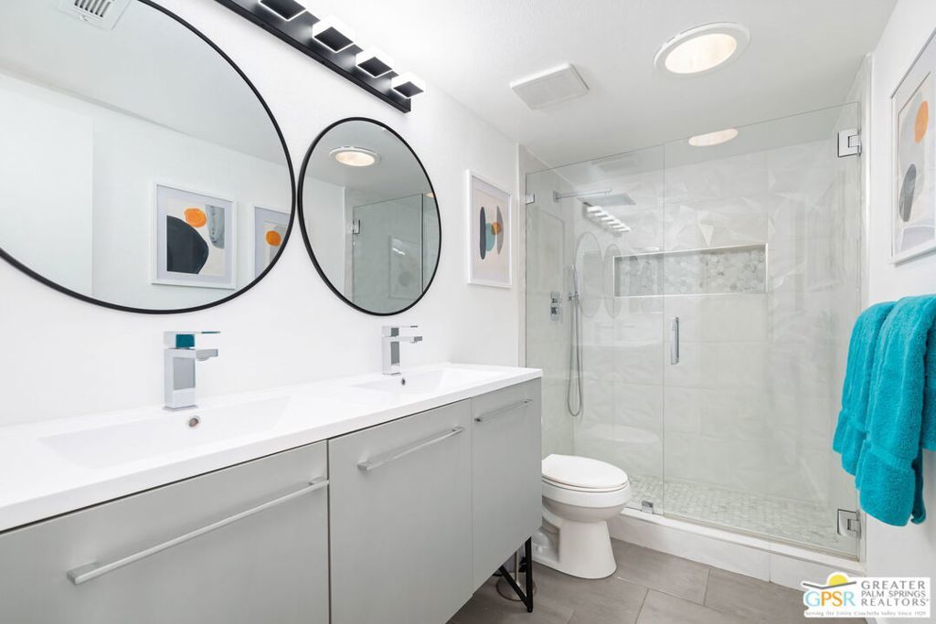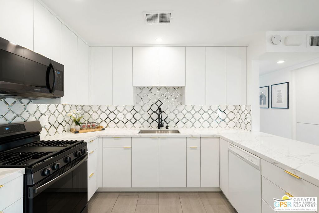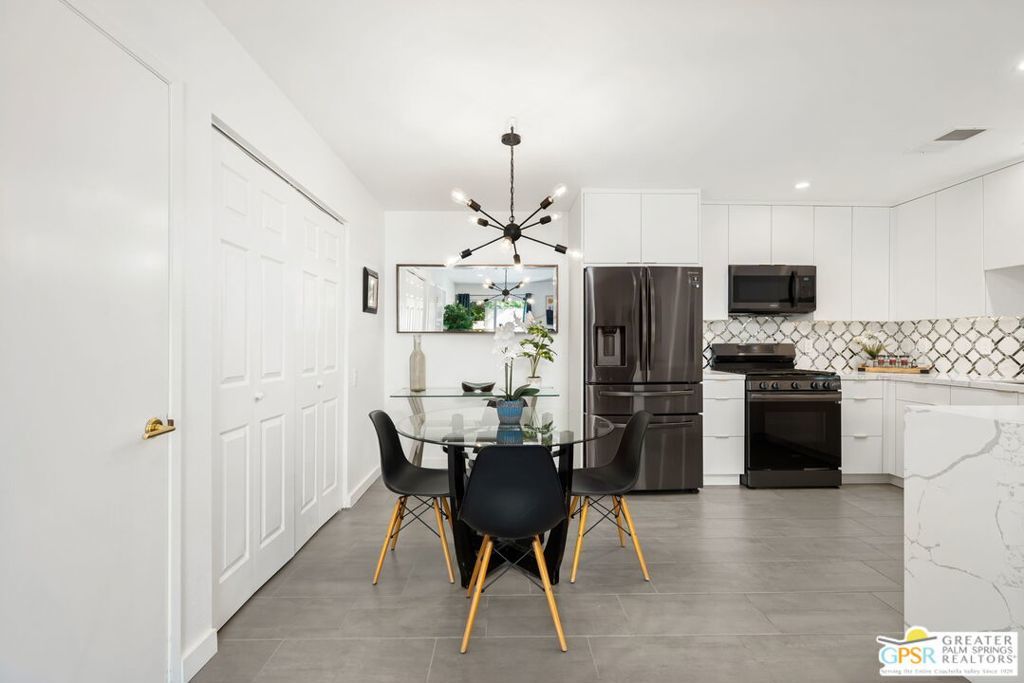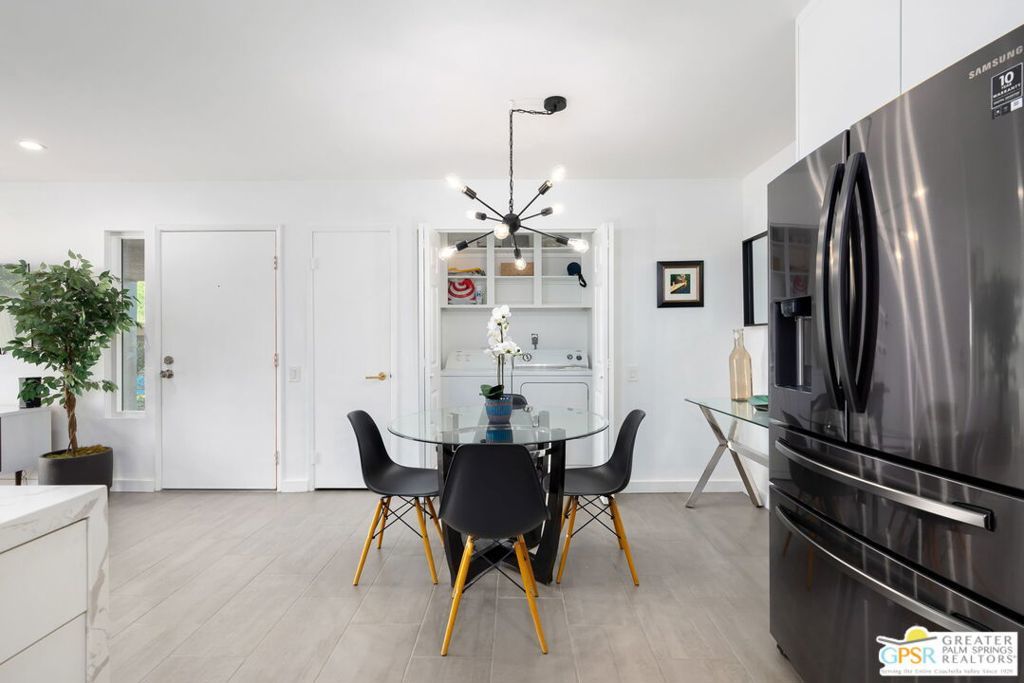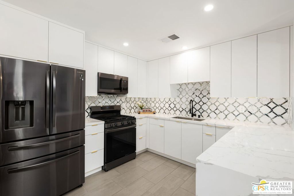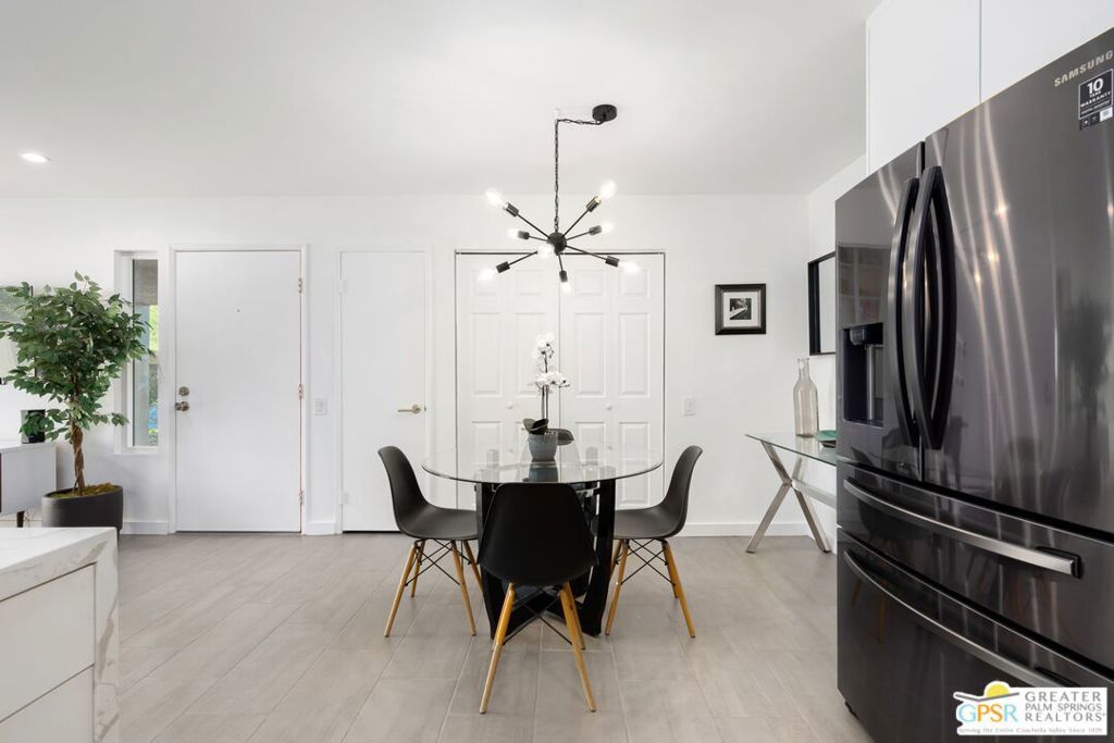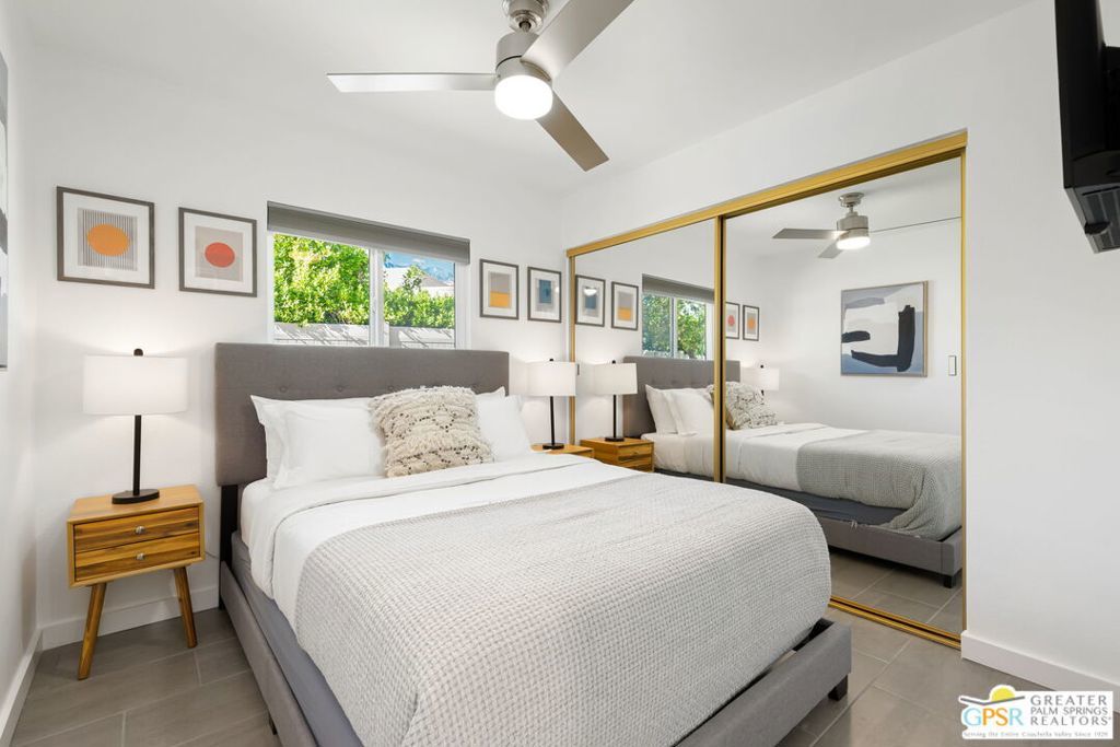 Recently remodeled and move-in ready, this stylish 3-bedroom, 1-bath condo is located in the sought-after gated community of Sunrise Palms in North Palm Springs. Set on 57 lush acres just minutes from downtown, this single-story, duplex-style home offers privacy, modern design, and access to an impressive list of amenities. Step inside to discover an open-concept living space with new flooring throughout, custom kitchen cabinetry, quartz countertops, new stainless appliances, and recessed lighting. The spa-like bathroom features a walk-in tiled shower and dual vanity, and all three bedrooms are well-sized with thoughtful finishes. Enjoy seamless indoor-outdoor living with a fully gated and landscaped private yard complete with orange trees, desert plants, and a large patio perfect for relaxing or entertaining. The home also includes a one-car garage, in-unit washer and dryer, and a brand-new HVAC system. Community amenities include 8 sparkling pools and spas, tennis, basketball and pickleball courts, and acres of green space. Sunrise Palms is centrally located near top dining, shopping, golf, and galleries, offering the ultimate Palm Springs lifestyle. Bonus: Currently operating as a successful vacation rental with seasonal bookings from October 2025 through April 2026 at $4,000 per month. New owner may choose to honor this income stream. A new solar system has been designed and is currently going through the planning stages. Combined with the new HVAC system, this home is well-positioned to be energy-efficient and cost-effective for years to come. The home is offered fully furnished and turn-key just bring your suitcase.