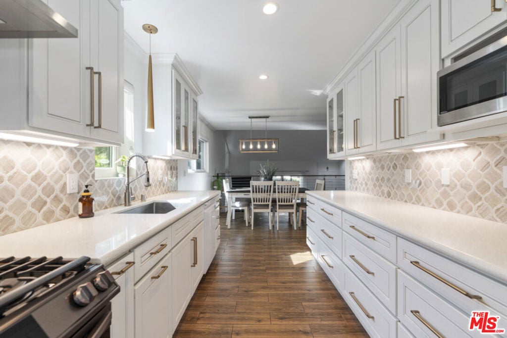 Welcome to this beautifully updated end-unit townhome in the highly desirable Oak Pointe community of Sherman Oaks. Offering 3 bedrooms, 3 remodeled bathrooms, and 1,666 square feet of thoughtfully designed living space, this home perfectly blends style, comfort, and functionality, complete with a direct-access 2-car garage. From the moment you enter, you're greeted by soaring lofted ceilings and a bright, open-concept split-level layout. The living room, centered around a cozy fireplace, flows effortlessly to a private outdoor patio ideal for both everyday living and entertaining. Throughout the home, you'll find tasteful upgrades including oak wood stairs with sleek stainless steel cable railing, tile flooring and triple paned premium windows throughout. The fully reimagined chef's kitchen is a standout, featuring new cabinetry, quartz countertops, a mosaic marble tile backsplash, stainless steel sink with commercial pull-down faucet, and a stainless gas range with air-fry functionality and a 30" hood. A guest bedroom and remodeled bath with shower are conveniently located on the main level. Upstairs, two additional spacious bedrooms include a stunning primary suite with a large walk-in closet and a spa-inspired en suite bath with dual vanities. Beyond its beauty, this home has been meticulously maintained with high-quality upgrades, including new Anlin triple-pane windows and sliding patio door, a newer American Standard heat pump and A/C system, and custom Levolor banded roller shades. The Oak Pointe community offers resort-style amenities, including access to two pools and spas, three tennis courts, pickleball courts, and two pet-friendly park areas connected by scenic walking paths. HOA fees cover Spectrum tv and internet, water and trash! Ideally situated with easy access to the 405 and 101 freeways, this home delivers both convenience and an exceptional lifestyle.