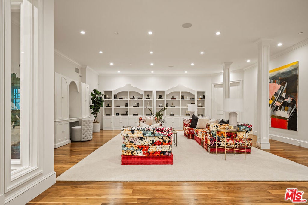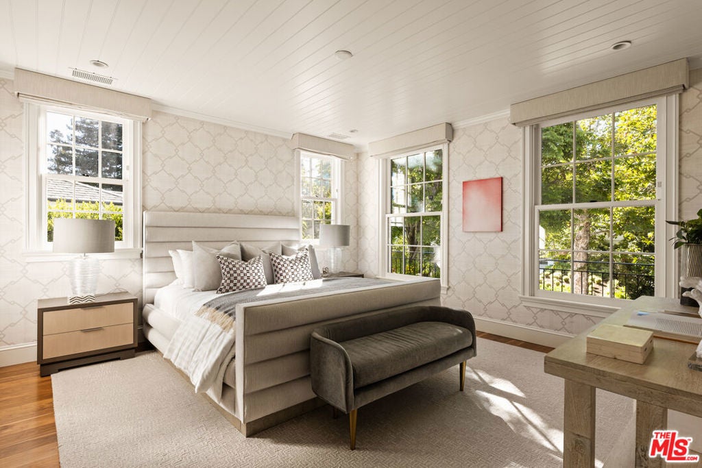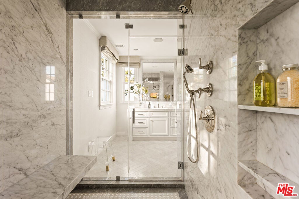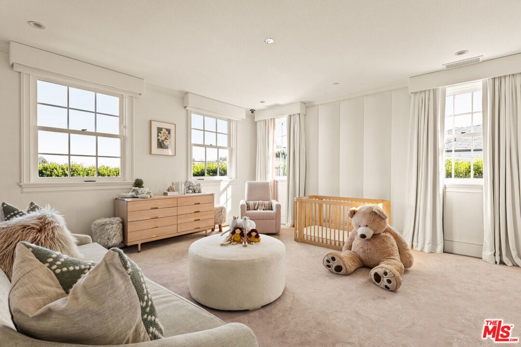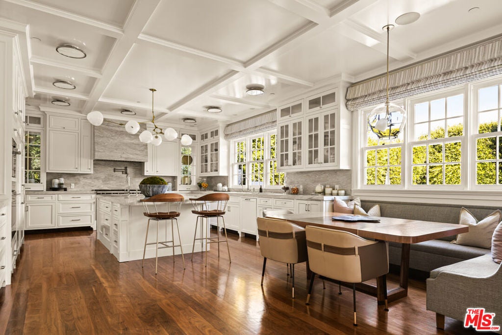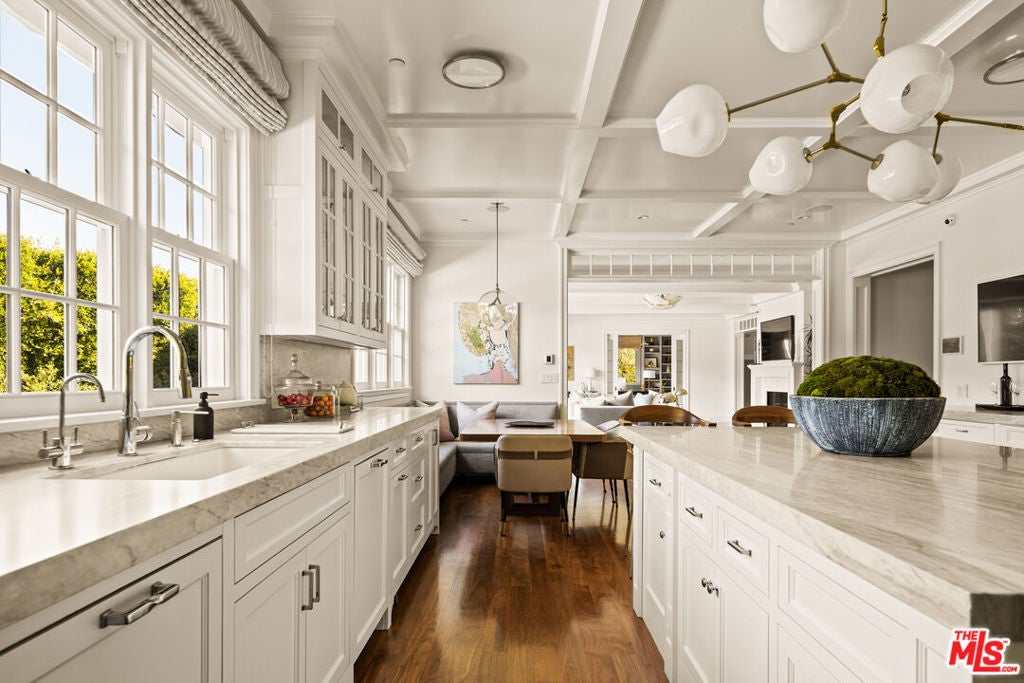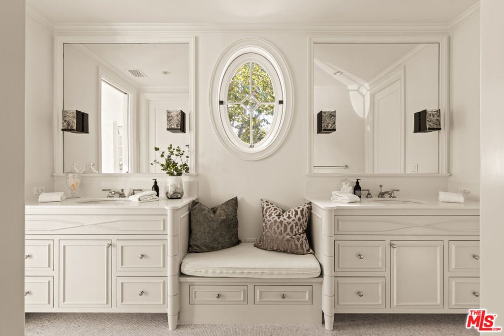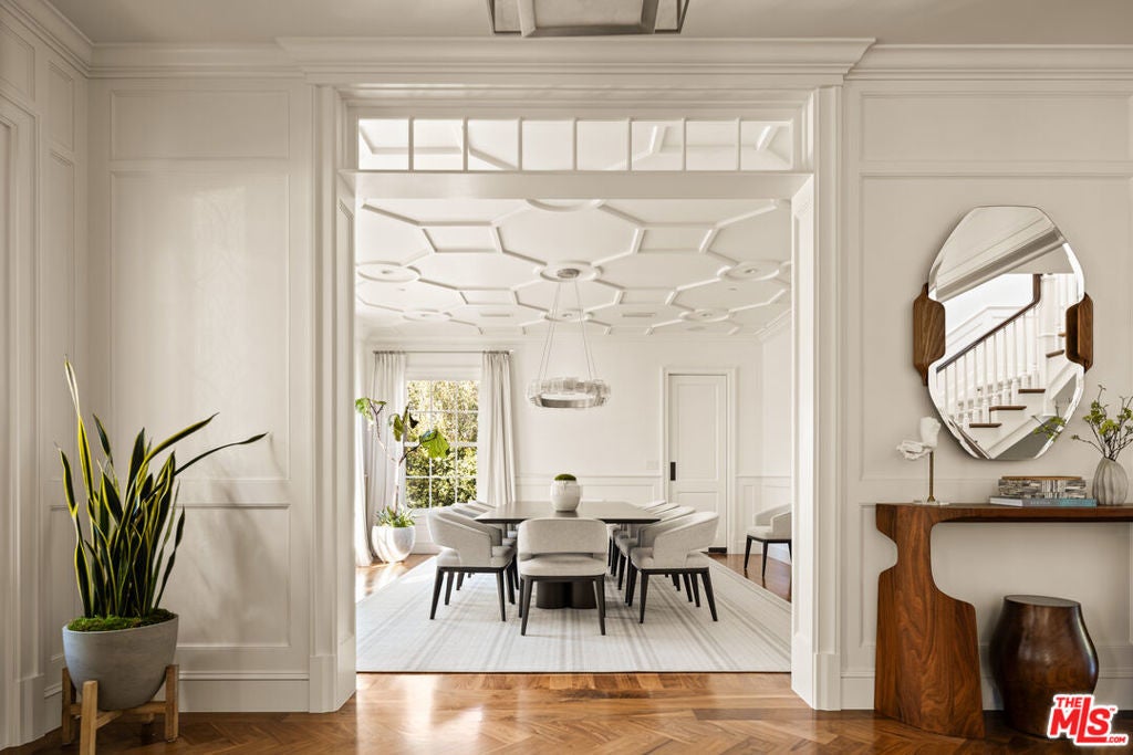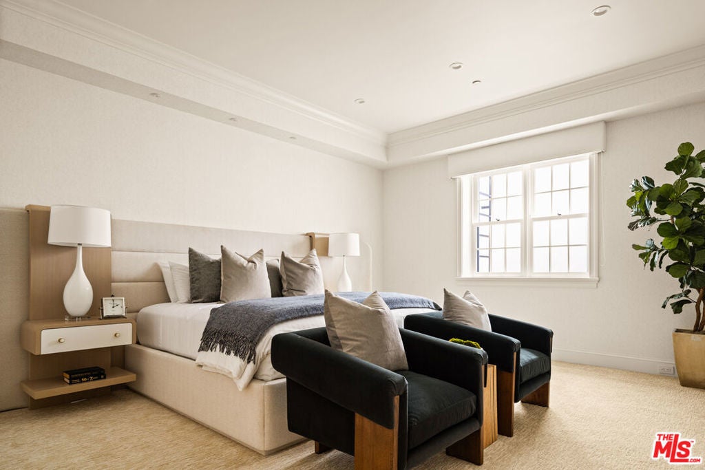 Tucked away in the highly sought-after Lower Riviera of Pacific Palisades, this exceptional traditional estate captures the spirit of understated luxury through impeccable craftsmanship, refined details, and a calm, sophisticated atmosphere. From timeless finishes to thoughtfully executed upgrades and distinctive architectural windows, the home has been designed with both beauty and livability in mind. Spanning three expansive levels, the residence offers a natural sense of flow and balance. On the main floor, bathrooms accented with amethyst and rose quartz bring a subtle, tranquil elegance. Formal spaces include a richly detailed study and a graceful dining room, complemented by a hidden butler's pantry and separate wet bar ideal for both intimate dinners and larger gatherings. At the center of the home, the chef's kitchen stands out with its honed marble hood, top-tier appliances, and a welcoming breakfast nook. Just beyond, the family room opens effortlessly to a secluded outdoor setting featuring a bluestone terrace, pool and spa with automated cover, built-in BBQ, wood-fired pizza oven, and mature hedging for privacy. Natural light pours into the upper level through skylights, where two ensuite bedrooms and a versatile bonus room complete with custom wallpaper and whiteboard walls offer flexibility for work, study, or play. The primary suite is a true retreat, highlighted by vaulted ceilings, linen-upholstered walls, a statement fireplace, motorized blackout shades, and a private balcony with subtle ocean glimpses. Its spa-like bath features hand-laid Michael Aram floral marble, heated floors, dual walk-in closets, and a dual-suite configuration with individual Japanese toilets. The lower level is designed for both relaxation and recreation, showcasing a cutting-edge home theater with a full-scale screen, cinema-quality projection, custom seating, and rich black mohair walls. This floor also includes a generous flex space, an additional bedroom, a custom wine cellar, and a fully equipped gym with mirrored walls and a ballet barre. Additional features include a comprehensive security system, Crestron whole-home audio and video integration, three retractable outdoor awnings, a vegetable garden, and completed post-fire inspection with air-quality remediation for added reassurance. Blending classic elegance with modern comfort, this home presents a rare opportunity to live in one of Los Angeles' premier neighborhoods, just moments from the renowned Riviera Country Club. Offered partially furnished, it includes a thoughtfully curated selection of designer and custom furnishings throughout.