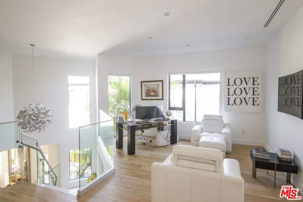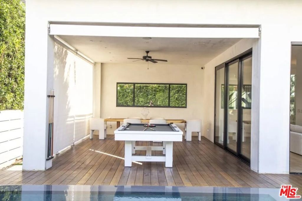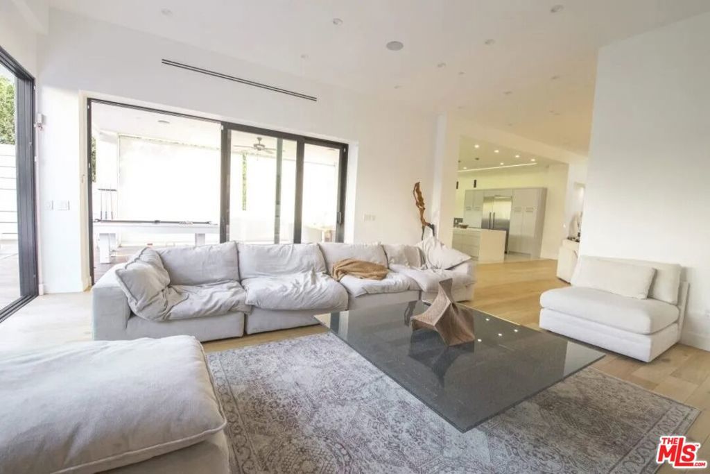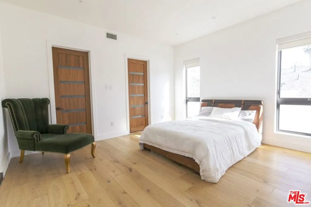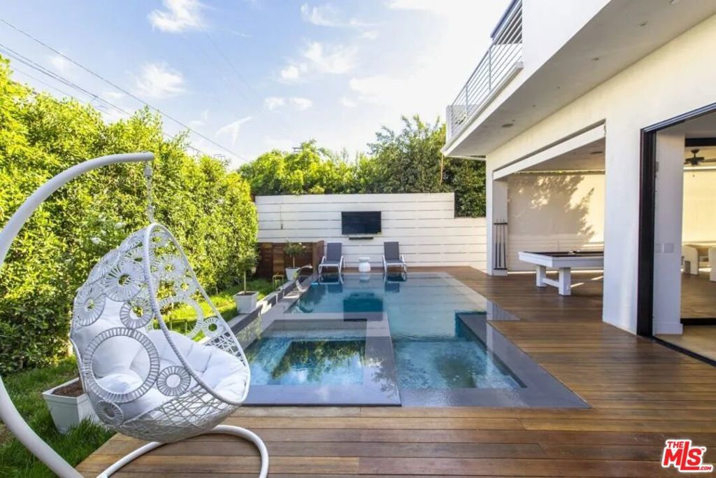 Fully furnished and turnkey, two-story modern residence located in the Melrose Village area. Recently remodeled, this home features high ceilings, a staircase entry, and an open floor plan designed for functional living. The kitchen is equipped with Thermador stainless steel appliances, including a six-burner range, center island with sink, built-in microwave, and ample counter space. The main level includes an en-suite bedroom suitable for guests, office, or additional use. The living room opens to a covered patio through sliding glass doors, providing indoor-outdoor access. The backyard includes a pool, spa, built-in BBQ, cabana, and seating area. Upstairs, the primary suite features high ceilings, two walk-in closets, and a private terrace overlooking the backyard. The primary bathroom includes a soaking tub, glass-enclosed shower, and dual sinks. Three additional en-suite bedrooms and a den area complete the second level. Additional features include a home automation system, security system, and integrated audio.