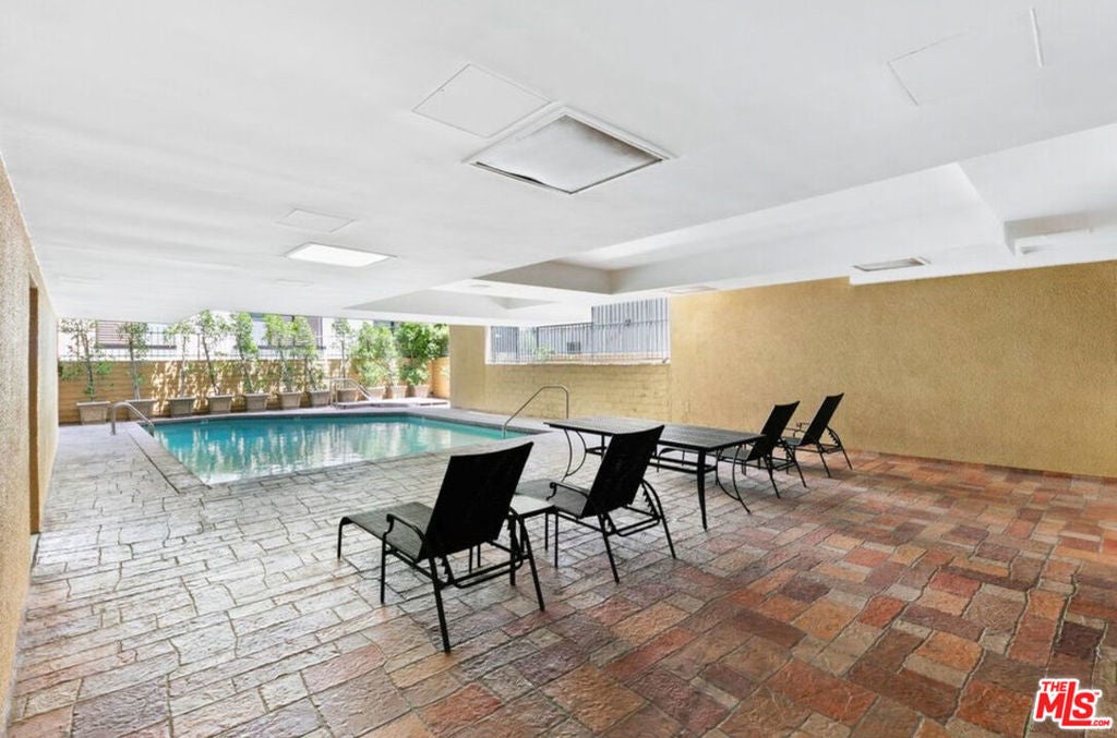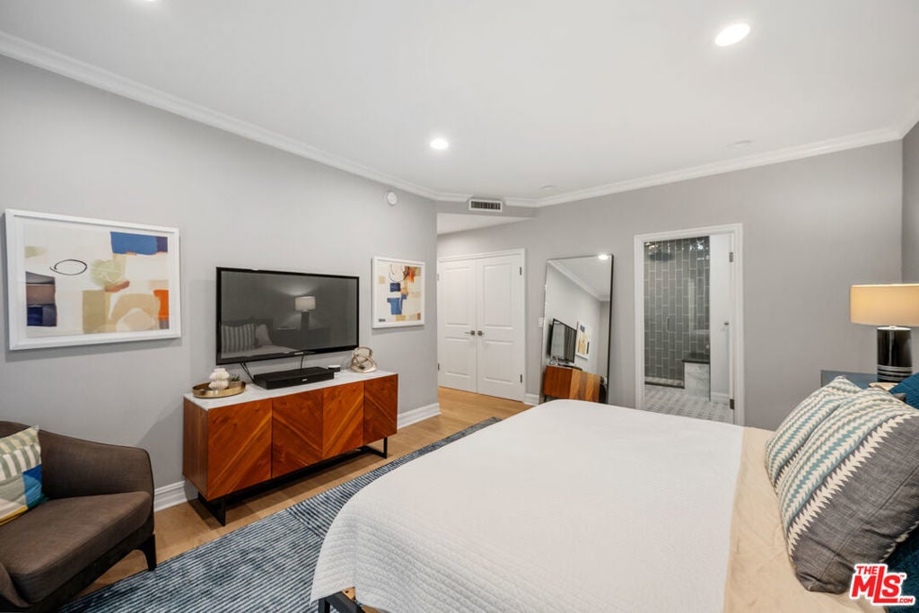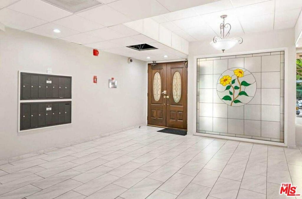 BEAUTIFULLY RENOVATED CORNER CONDOMINIUM JUST STEPS FROM BEVERLY HILLS. You arrive on a quiet, tree lined street just one block east of Robertson Boulevard, where cafes, fine dining, and boutique shopping are immediately accessible. A secure Mediterranean style boutique building with a spacious lobby and just twelve residences creates a rare sense of privacy and calm. Step inside this corner two-bedroom, two-bathroom luxury condominium and natural light fills the space, showcasing a thoughtfully designed 1,250 square foot floor plan. The living room is both refined and inviting, anchored by a gas fireplace framed in Italian marble and custom built-in bookshelves. A built-in desk offers a seamless work from home space without compromising elegance. The dining room opens to a private balcony through expansive eight-foot sliding glass doors, surrounded by lush greenery for a rare sense of seclusion. It feels like an extension of the living space, perfect for morning coffee or evening wine. The cook's kitchen is stylish and functional, featuring white lacquer cabinetry, solid surface counters with marble backsplashes, stainless steel KitchenAid appliances, a tray ceiling, and an over sink bay window ideal for growing fresh herbs. The primary suite provides a serene retreat with an oversized walk-in closet and a beautifully finished bathroom with dual vanities and marble tile. The guest bedroom features dual closets and a guest bathroom finished to the same high standard. An in-unit washer and dryer add convenience, while custom blinds, drapes, window treatments, and crown molding reflect attention to detail throughout. Building amenities include a pool, recreation room, inviting lobby, and two assigned parking spaces. All are within walking distance to Beverly Hills luxury boutiques, fine dining, The Grove, the Beverly Center and Cedars Sinai. Can you imagine living this close to everything, yet feeling completely at home?