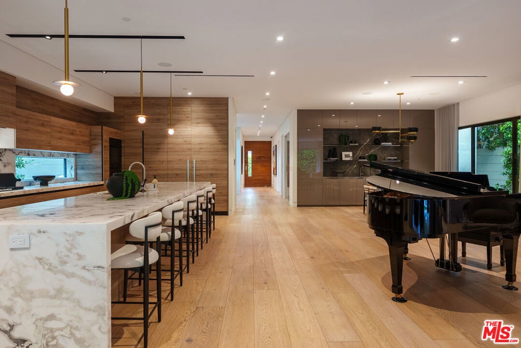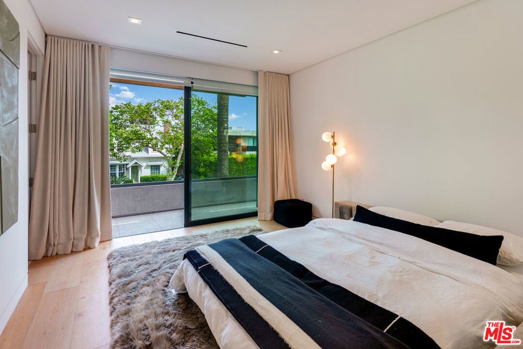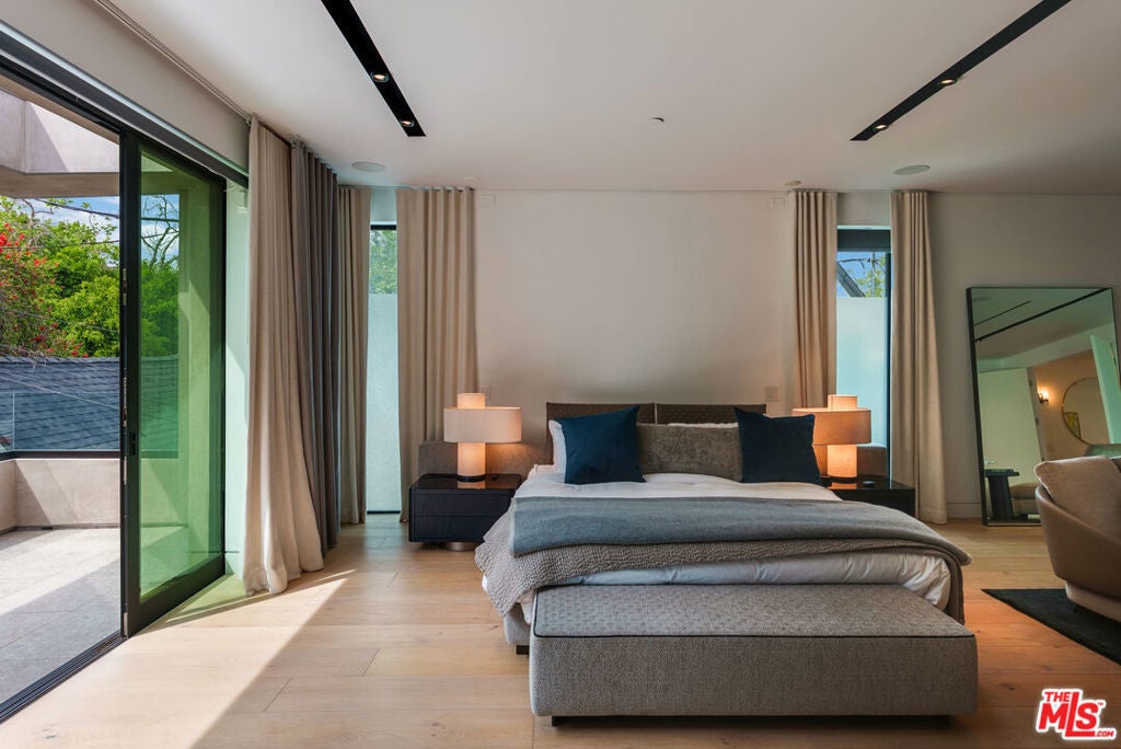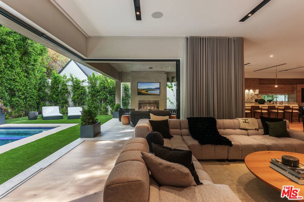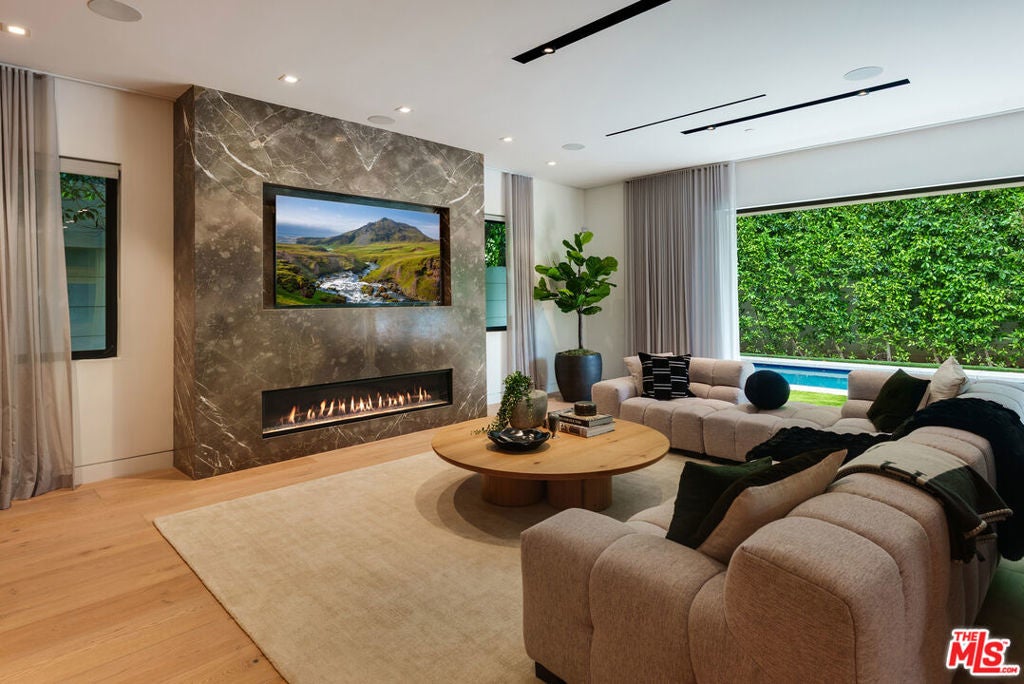 A standout offering in one of LA's most coveted neighborhoods, this exceptional residence showcases elevated craftsmanship, striking architectural detail, and an expansive rooftop retreat with sweeping 360-degree city views. Designed to rival the area's finest new builds, the home opens with a dramatic walnut pivot entry into a light-filled floor plan tailored for seamless indoor-outdoor living. The main level is thoughtfully curated for both everyday living and entertaining, featuring a wine room, a bonus room (theater/exercise/recording studio), formal dining space with wet bar, and a custom Italian kitchen outfitted with premium finishes. Designer stone and tile, European oak floors, Fleetwood walls of glass, and multiple fireplaces all frame views of the illuminated pool, creating a true resort-style ambiance. A sculptural floating staircase leads to four generous en-suite bedrooms, including a sophisticated primary suite with a lounge area, dual custom LED-lit walk-in closets, a private terrace, and a striking stone fireplace. Additional highlights include a gated circular motor court, advanced smart home integration with top-tier media and security systems, and dual-zone climate control. The rooftop level, complete with its own powder room, is designed for elevated entertaining against a panoramic city backdrop. Originally designed by internationally acclaimed Chimera Interiors and set on a celebrity-favored block, this home offers a rare blend of privacy, scale, and design in the heart of Beverly Grove.
