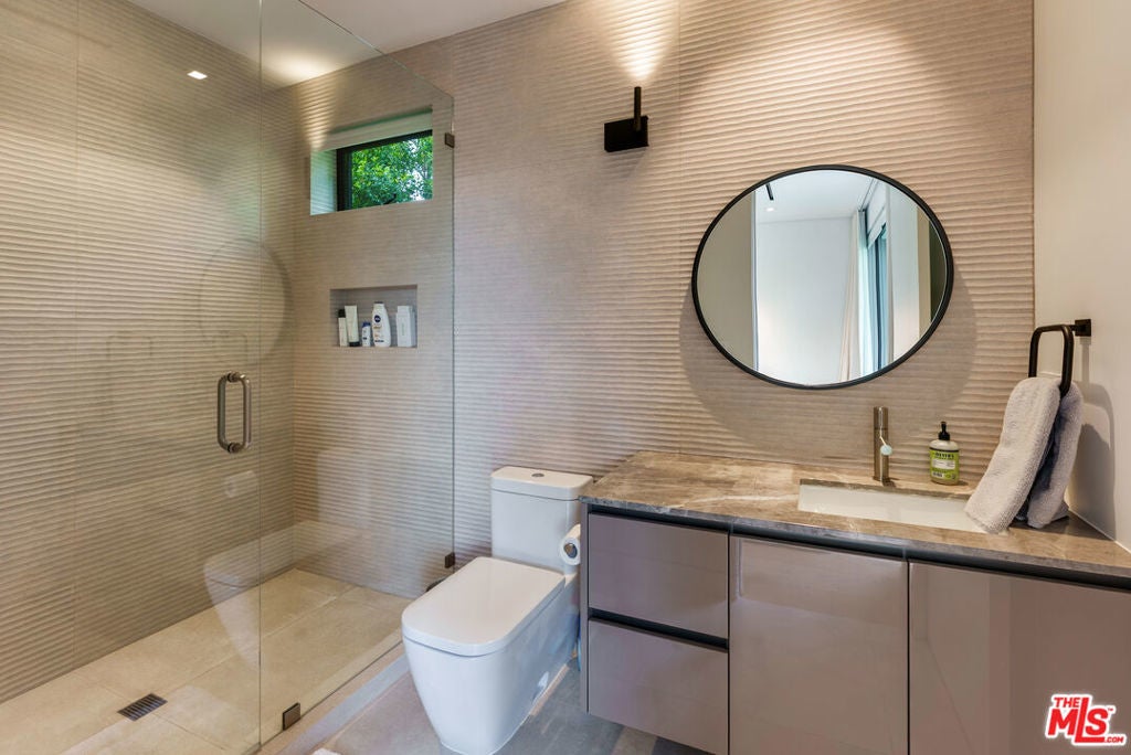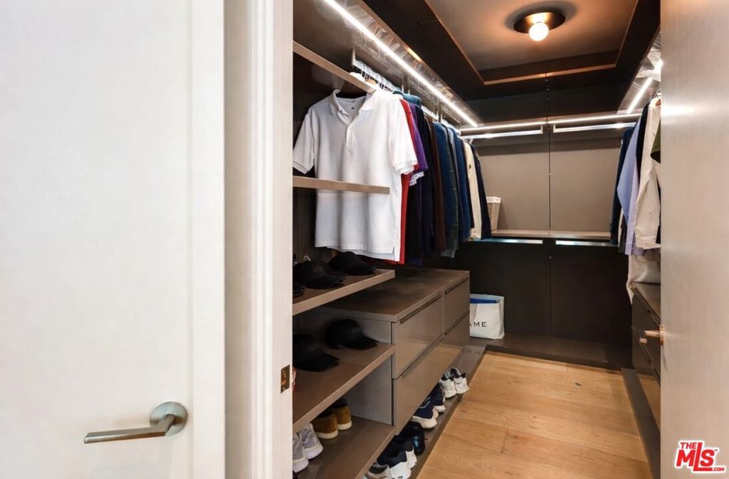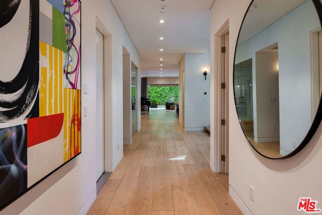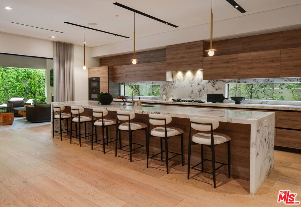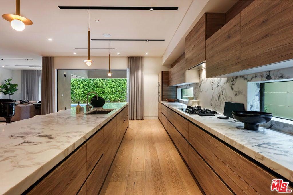 A standout offering in one of LA's most coveted neighborhoods, this exceptional residence showcases elevated craftsmanship, striking architectural detail, and an expansive rooftop retreat with sweeping 360-degree city views. Designed to rival the area's finest new builds, the home opens with a dramatic walnut pivot entry into a light-filled floor plan tailored for seamless indoor-outdoor living. The main level is thoughtfully curated for both everyday living and entertaining, featuring a wine room, a bonus room (theater/exercise/recording studio), formal dining space with wet bar, and a custom Italian kitchen outfitted with premium finishes. Designer stone and tile, European oak floors, Fleetwood walls of glass, and multiple fireplaces all frame views of the illuminated pool, creating a true resort-style ambiance. A sculptural floating staircase leads to four generous en-suite bedrooms, including a sophisticated primary suite with a lounge area, dual custom LED-lit walk-in closets, a private terrace, and a striking stone fireplace. Additional highlights include a gated circular motor court, advanced smart home integration with top-tier media and security systems, and dual-zone climate control. The rooftop level, complete with its own powder room, is designed for elevated entertaining against a panoramic city backdrop. Originally designed by internationally acclaimed Chimera Interiors and set on a celebrity-favored block, this home offers a rare blend of privacy, scale, and design in the heart of Beverly Grove.