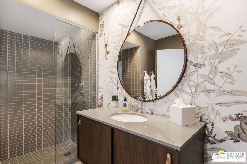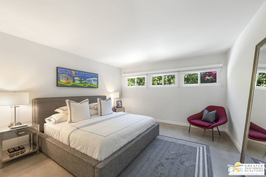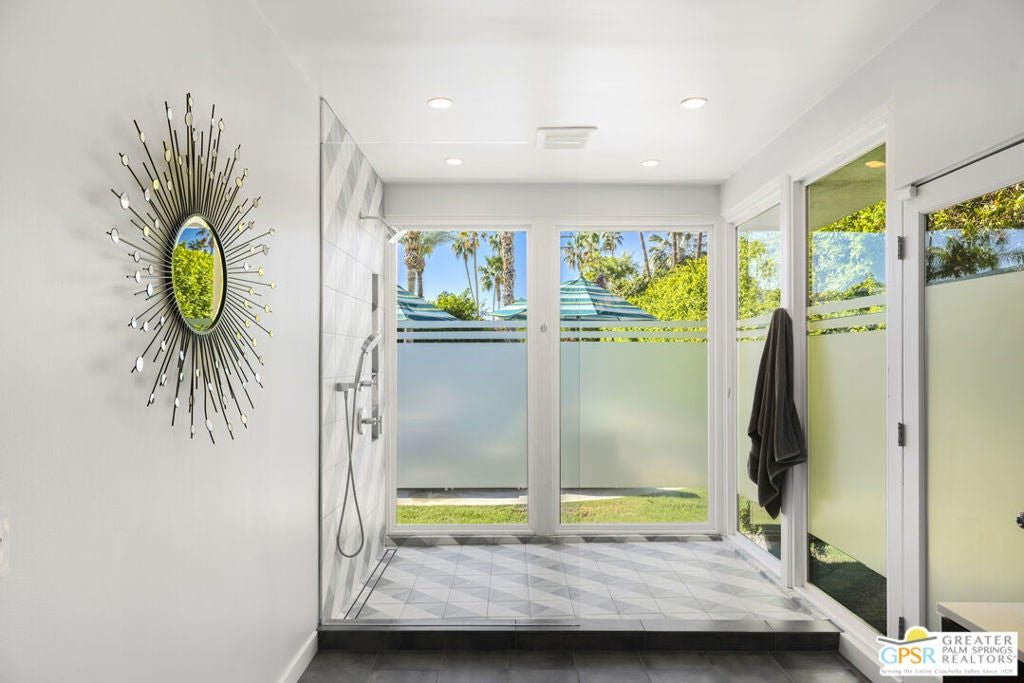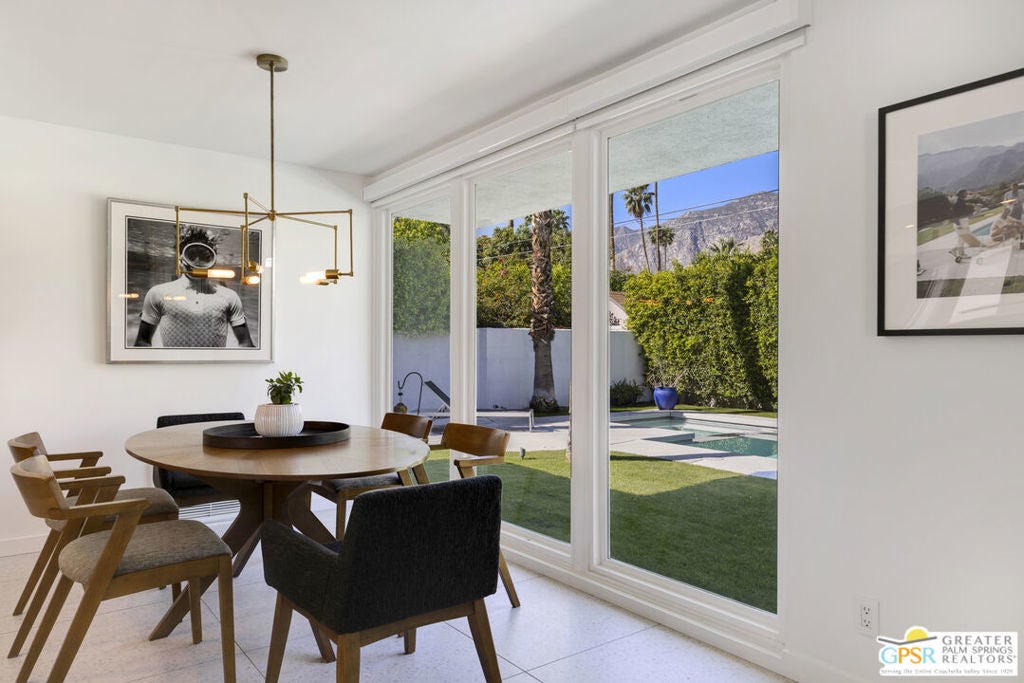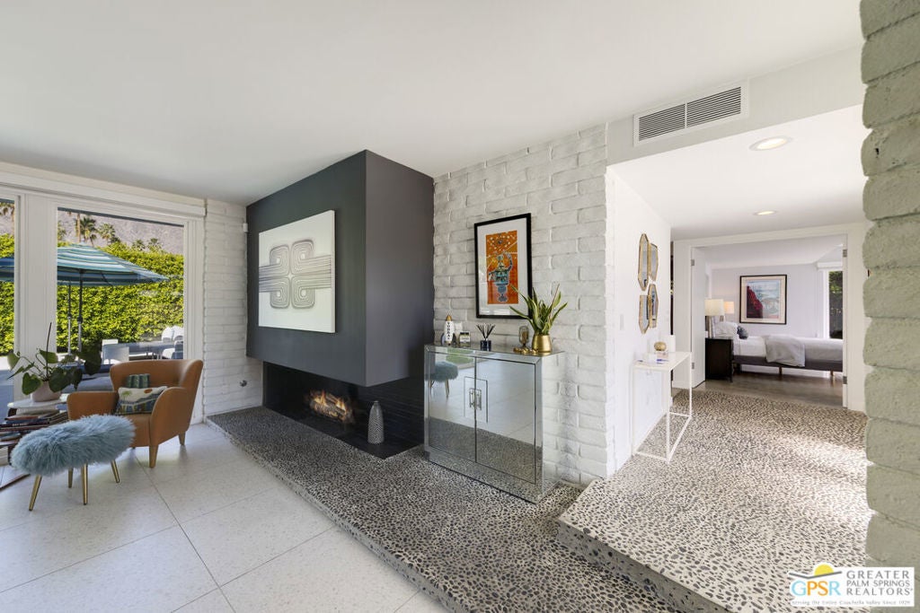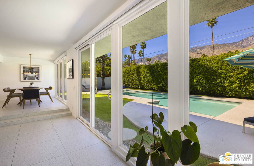 Located in the heart of Palm Springs' coveted Deepwell neighborhood, this quintessential 1961 mid-century modern home blends architectural character with thoughtful modern upgrades. Framed by a dramatic circular driveway and surrounded by gorgeous mountain views from both the front and back, the setting is as iconic as the home itself. Inside, a dramatic rounded wall and statement fireplace anchor the living room, creating a true architectural moment, while walls of glass and an effortless layout open to the outdoors, delivering the indoor-outdoor lifestyle Palm Springs is known for. The home has been updated with new terrazzo-style flooring, fresh interior paint, and new double-pane windows throughout, while preserving its original Italian stone and rock entryway an ideal balance of authenticity and refinement. The remodeled kitchen is both striking and functional, featuring gorgeous quartz countertops, premium Italian appliances, and a new gas line, all designed to connect seamlessly to the main living spaces and outdoor areas. Anchored by a dining area with beautiful mountain views, this space is ideal for both everyday living and entertaining. All three bedrooms are generously sized, offering comfort and flexibility, while the fully remodeled bathrooms showcase elevated finishes, including designer wallpaper. The primary suite is a true retreat, featuring a large walk-in closet, a massive walk-in shower, enhanced ventilation, and direct access to a private outdoor shower, perfectly embracing the indoor-outdoor lifestyle. An additional bonus office/den/guest area, complete with its own bath and direct access to the backyard, adds versatility and function. Step outside to a private backyard retreat featuring a pool and spa, new landscaping and outdoor lighting, multiple areas to relax and entertain, and stunning mountain views that create a true desert backdrop. Additional upgrades include owned solar with a Tesla Powerwall, two new A/C units, two new hot water heaters, a brand new roof (approximately 5 months old), and two new sewer lines connected to the city, offering both efficiency and peace of mind. With 3 bedrooms and 3 bathrooms, this is a rare opportunity to own a true architectural mid-century home in one of Palm Springs' most iconic neighborhoods, where timeless design meets modern comfort.