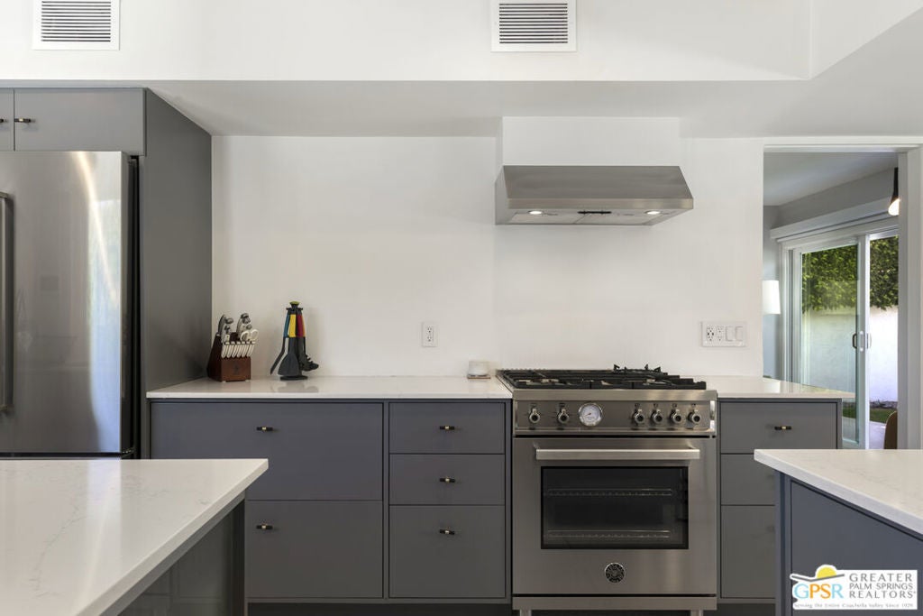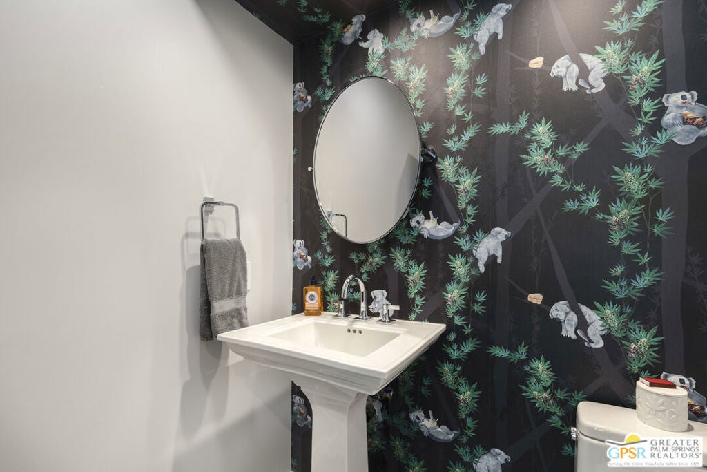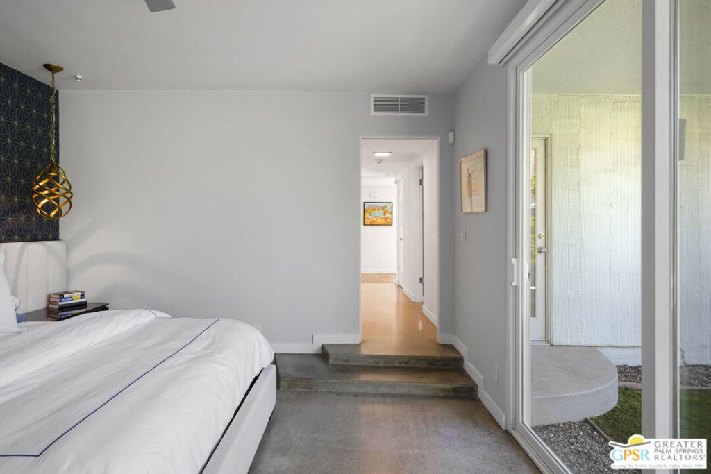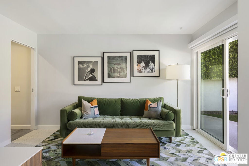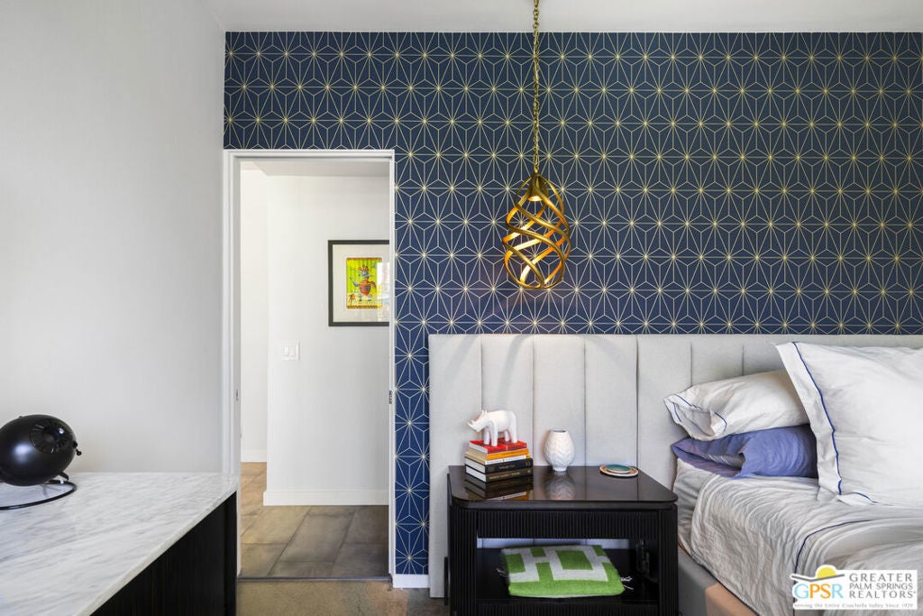 Located in the heart of Palm Springs' coveted Deepwell neighborhood, this quintessential 1961 mid-century modern home blends architectural character with thoughtful modern upgrades. Framed by a dramatic circular driveway and surrounded by gorgeous mountain views from both the front and back, the setting is as iconic as the home itself. Inside, a dramatic rounded wall and statement fireplace anchor the living room, creating a true architectural moment, while walls of glass and an effortless layout open to the outdoors, delivering the indoor-outdoor lifestyle Palm Springs is known for. The home has been updated with new terrazzo-style flooring, fresh interior paint, and new double-pane windows throughout, while preserving its original Italian stone and rock entryway an ideal balance of authenticity and refinement. The remodeled kitchen is both striking and functional, featuring gorgeous quartz countertops, premium Italian appliances, and a new gas line, all designed to connect seamlessly to the main living spaces and outdoor areas. Anchored by a dining area with beautiful mountain views, this space is ideal for both everyday living and entertaining. All three bedrooms are generously sized, offering comfort and flexibility, while the fully remodeled bathrooms showcase elevated finishes, including designer wallpaper. The primary suite is a true retreat, featuring a large walk-in closet, a massive walk-in shower, enhanced ventilation, and direct access to a private outdoor shower, perfectly embracing the indoor-outdoor lifestyle. An additional bonus office/den/guest area, complete with its own bath and direct access to the backyard, adds versatility and function. Step outside to a private backyard retreat featuring a pool and spa, new landscaping and outdoor lighting, multiple areas to relax and entertain, and stunning mountain views that create a true desert backdrop. Additional upgrades include owned solar with a Tesla Powerwall, two new A/C units, two new hot water heaters, a brand new roof (approximately 5 months old), and two new sewer lines connected to the city, offering both efficiency and peace of mind. With 3 bedrooms and 3 bathrooms, this is a rare opportunity to own a true architectural mid-century home in one of Palm Springs' most iconic neighborhoods, where timeless design meets modern comfort.
