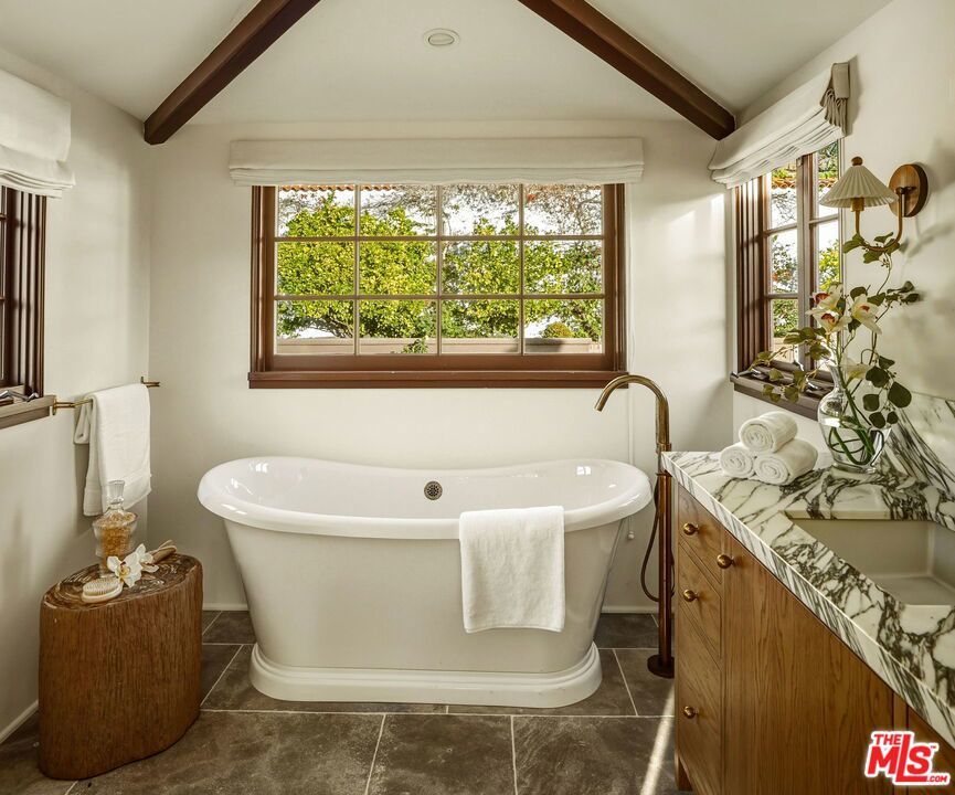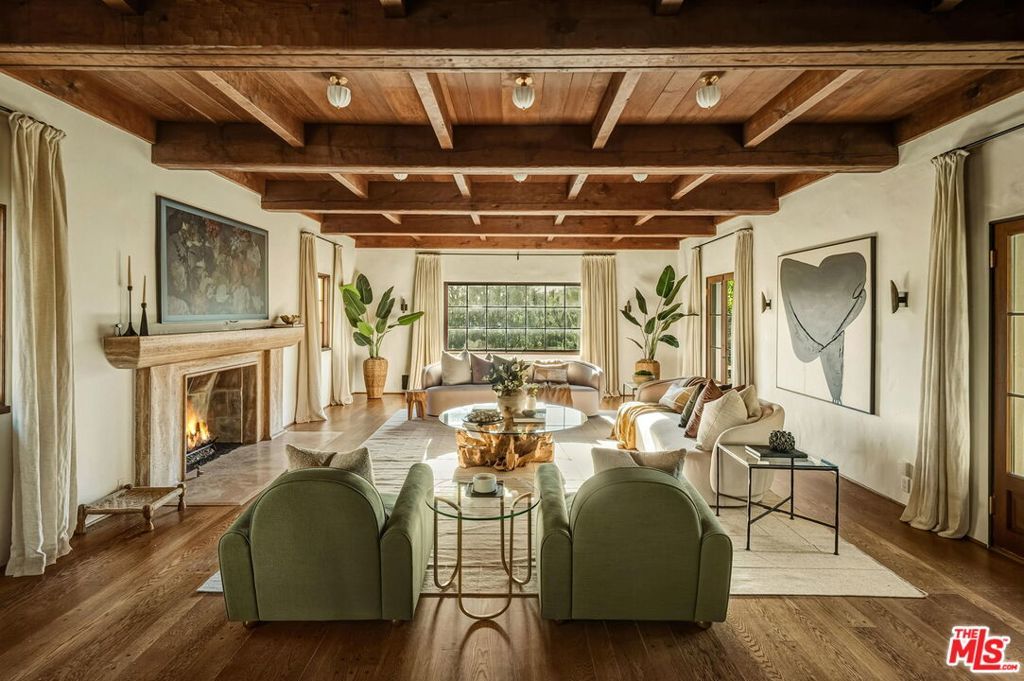 Nestled at the end of a long gated drive in Lower Mandeville Canyon, La Casa De Flores is a Spanish Revival estate of rare provenance and timeless beauty. Designed in 1929 by acclaimed architect John Byers and thoughtfully reimagined for modern living, the home sits on nearly an acre of lush, secluded grounds, offering an atmosphere that feels both grand and deeply inviting. Inside, the craftsmanship of the original era remains intact -- with wood-beamed and coffered ceilings, rich hardwood floors, graceful French doors, and hand-crafted casement windows. Sculptural designer lighting fixtures punctuate the interiors, enhancing the interplay of light and texture throughout. The formal living room, framed by garden views, is anchored by a stone fireplace and crowned by thick, solid wood beams. The formal dining room opens to verandas on both sides, creating effortless flow for gatherings, while the warm, inviting family room is wrapped in custom built-ins. The fully remodeled gourmet kitchen blends elegance and function with stone countertops, custom cabinetry, and an expansive dual-surface marble and butcher block island. A Lacanche range sits within a bespoke alcove, complemented by a walk-in pantry. Adjacent, the glass-topped atrium breakfast room dazzles with direct access to the outdoor kitchen and al fresco dining patio outfitted in vibrant Spanish tile and an original fountain. The primary wing offers a serene retreat with a private covered balcony, far-reaching canyon vistas, a corner fireplace, and a designer walk-in dressing room. Its en suite bath, bathed in natural light, features dual marble vanities and a custom-tiled shower. Four additional guest suites, including two joined by a Jack-and-Jill bath, provide comfort and flexibility. A detached office with a tranquil handpainted mural and expansive windows offers an inspiring workspace, while a coved wine cellar adds an indulgent touch. The grounds are a true sanctuary -- mature fruit trees, flowering gardens, peaceful fountains, and sweeping lush views frame a 55-foot swimmer's pool, brick patios, and a pergola lounge with firepit. Accessory structures and a three-car garage complete this rare and private compound, just moments from Brentwood's finest restaurants, boutiques, and top-rated schools. Blending architectural pedigree with modern comfort, La Casa De Flores is not merely a home -- it's a priceless work of art in one of Los Angeles' most coveted neighborhoods.