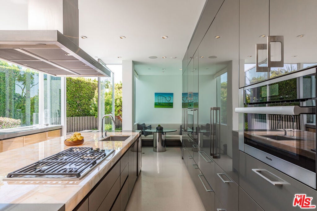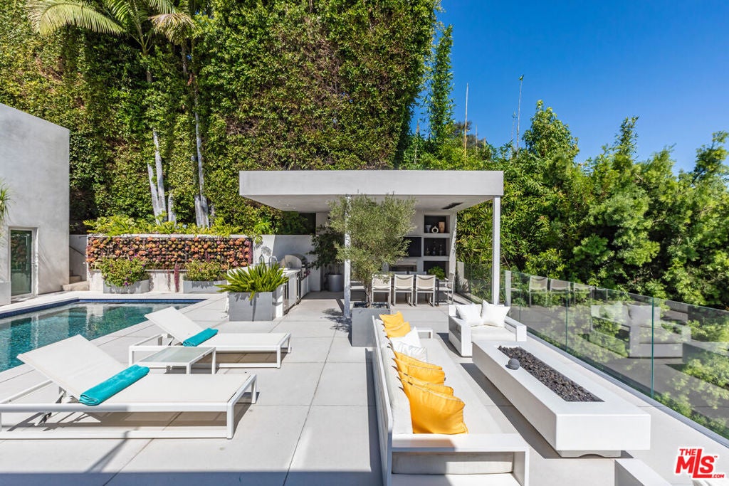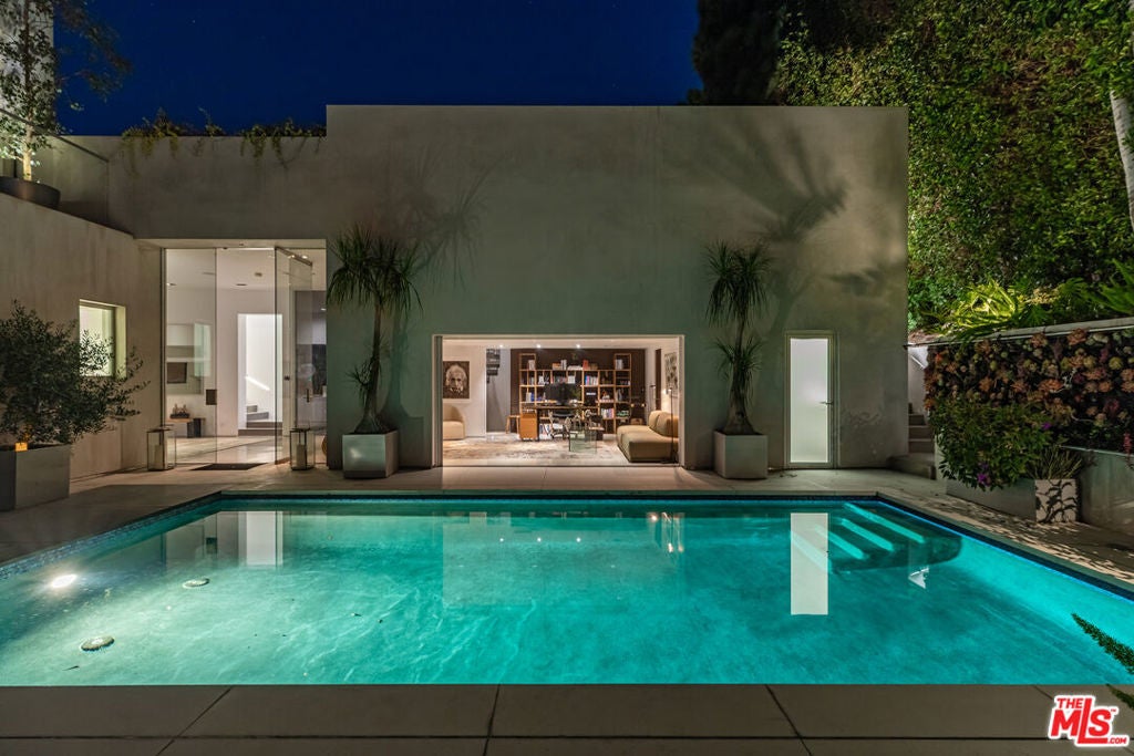 Perched to capture sweeping city lights and sunset ocean views, the Full Moon House is a masterclass in refined modern luxury and bespoke international craftsmanship. With interiors thoughtfully curated by Max Amirsole, featuring artful pieces from Italy, France, and beyond, the home exudes inviting warmth and worldly elegance. His design seamlessly complements James Magni's architectural vision, where bold lines and open-concept spaces meet light, texture, and panoramic city-to-ocean views. Floor-to-ceiling glass walls connect seamless indoor-outdoor spaces, leading to expansive terraces and newly landscaped grounds featuring a stone water feature and a sculpture installation. The main level features a dramatic living area with disappearing glass walls, a sleek chef's kitchen centered around a backlit onyx island, and a formal dining space ideal for entertaining. Designer bedrooms include imported pieces from Spain and Italy, Toto toilets, and flexible use options such as a pre-wired theater suite. The primary suite spans the entire upper level with motorized shades, lime-washed walls, dual spa baths, a soaking tub set on stone, two walk-in closets, and a private outdoor gym terrace. Additional features include terrazzo flooring throughout, Control4 smart home automation, Lutron lighting, solar panels, and a redesigned cabana with smooth stucco and custom shelving. This residence offers an unparalleled blend of modern sophistication, curated design, and indoor-outdoor serenity in the hills above Los Angeles. Furnishings thoughtfully curated from Cantoni, Poliform, BoConcept, and bespoke designer pieces.