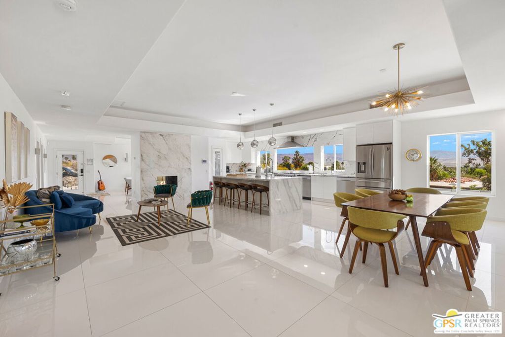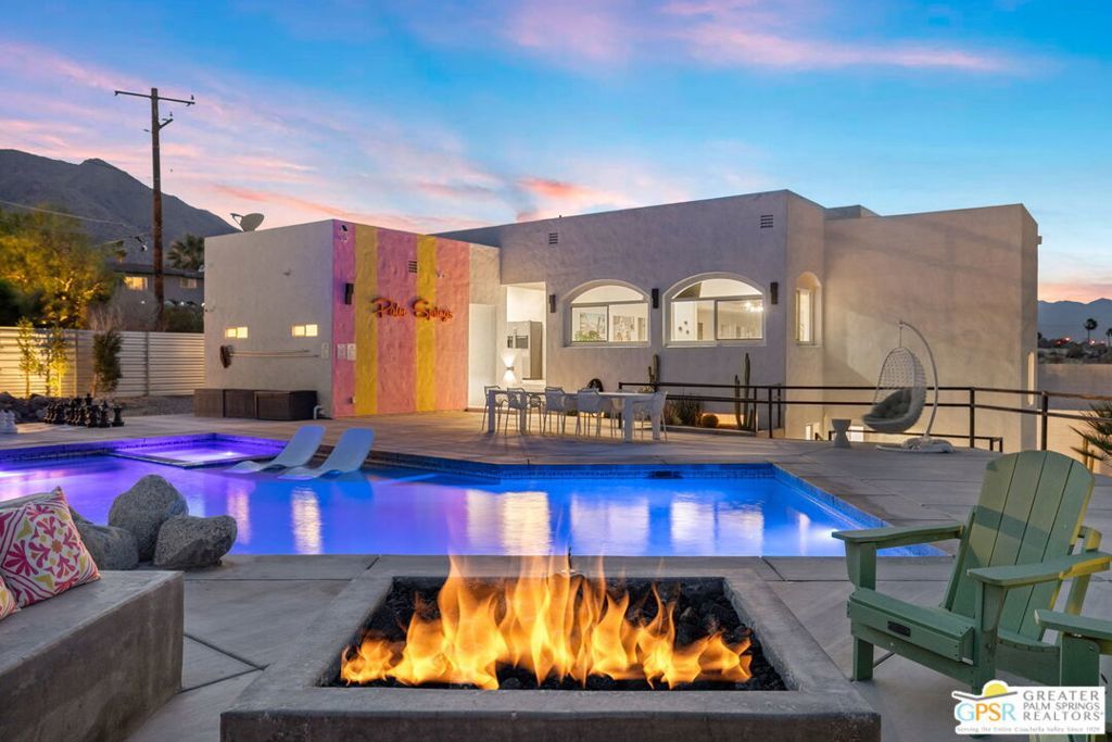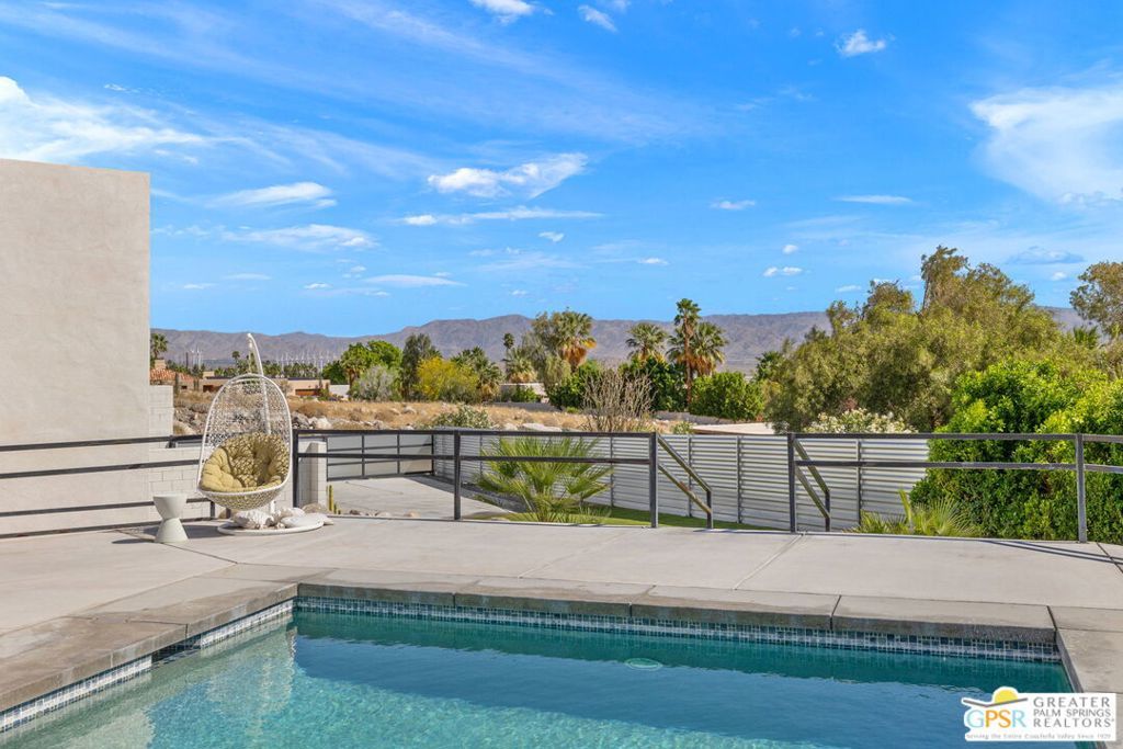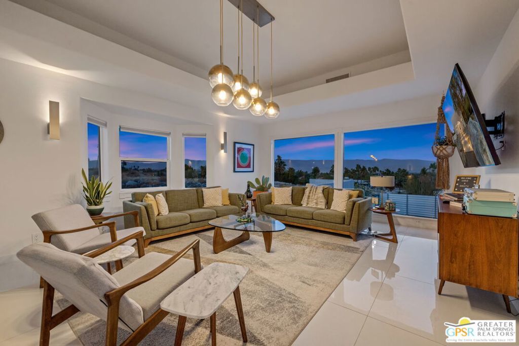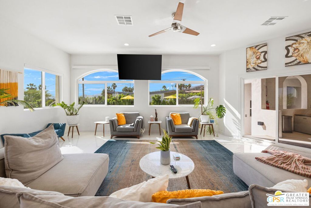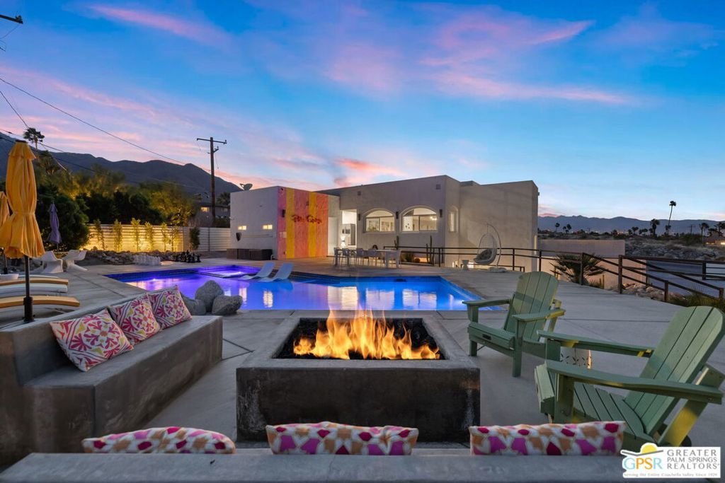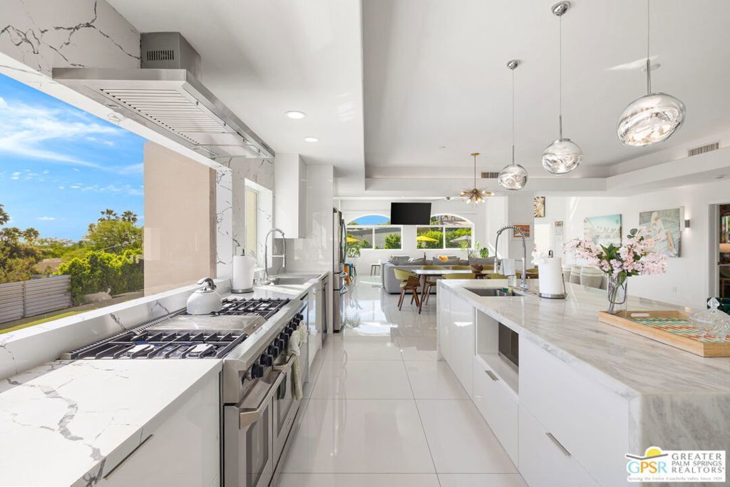 An exceptional opportunity to own a TURNKEY fully furnished renovated HILLTOP estate in Chino Canyon with jaw-dropping 360 views, resort-style amenities, and proven vacation rental income. This gorgeous retreat captures truly breathtaking panoramic views, stretching across the iconic Palm Springs mountains, sparkling city lights, and even snow-capped peaks of Big Bear. From sunrise to sunset, every angle of this property is designed to showcase the beauty of the desert from an elevated, private vantage point. Spanning over 3,500 square feet and situated on an oversized lot of more than 17,000 square feet, this completely remodeled home offers both space and privacy in a truly spectacular setting. All four bedrooms are en-suite and each with its own walk-in closet. Two bedrooms are located upstairs and two downstairs with both levels offering direct access to the backyard, creating an ideal layout for seamless indoor-outdoor living and guest privacy. The primary suite is a true retreat, complete with a soaking tub and a private laundry area conveniently located within the walk in closet. The immense kitchen is both stunning and functional, featuring quartz countertops, a striking marble waterfall island, stainless steel appliances including a Thor double oven, soft-close cabinetry, and a walk-in pantry. Designed for both relaxation and entertaining, the outdoor spaces are truly resort-inspired. Enjoy the massive pebble-tec saltwater pool with new equipment and heater, a built-in gas firepit, and a fully equipped outdoor kitchen complete with BBQ, sink, and refrigerator, all set against a dramatic backdrop of mountain views and windmill vistas. Lush grass, mature ficus, and natural rock and boulder landscaping enhance the sense of privacy and tranquility. Inside, the home features white Spanish porcelain flooring, beautifully finished bathrooms with porcelain tile showers, and a gas fireplace that welcomes you at the entry. A separate outdoor laundry room and pool bathroom add convenience for guests and effortless entertaining. Additional highlights include a motorized gated entry, security system, solar system, new plumbing (hot and cold supply), updated downstairs HVAC, EV charging in the covered two car garage, and fully permitted improvements throughout. This property is not only a stunning primary or second home, but also a highly successful vacation rental. Located in a neighborhood where short-term rental permits are still available (buyer to verify), it presents an exceptional investment opportunity with strong income potential. Here is your chance to own a meticulously upgraded desert sanctuary with unmatched views, privacy, income potential, and lifestyle amenities just minutes from the heart of Palm Springs.