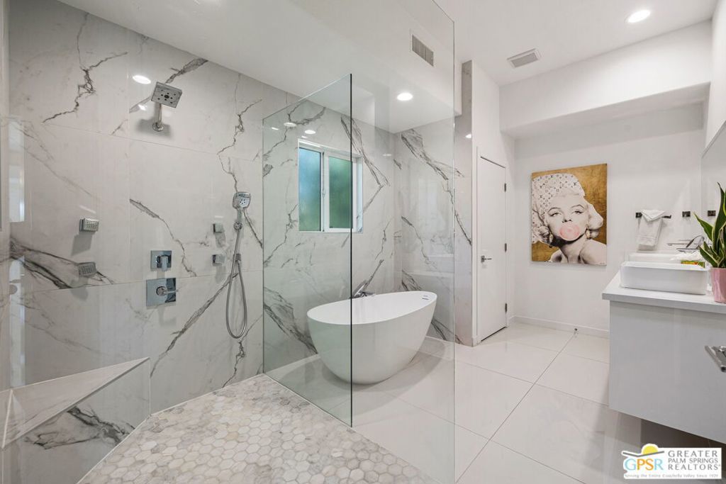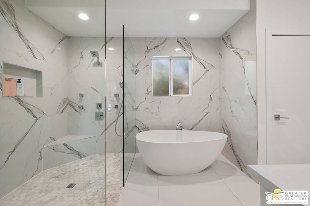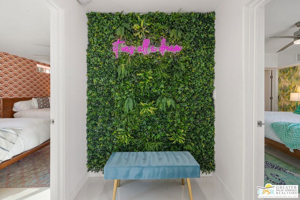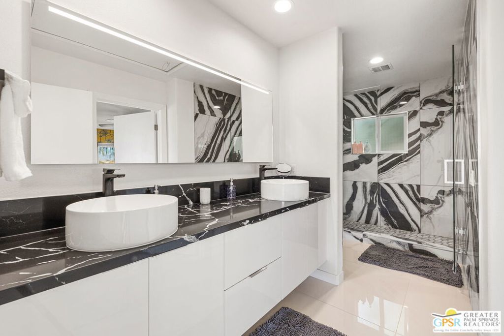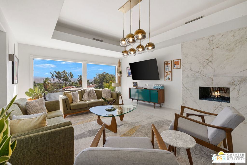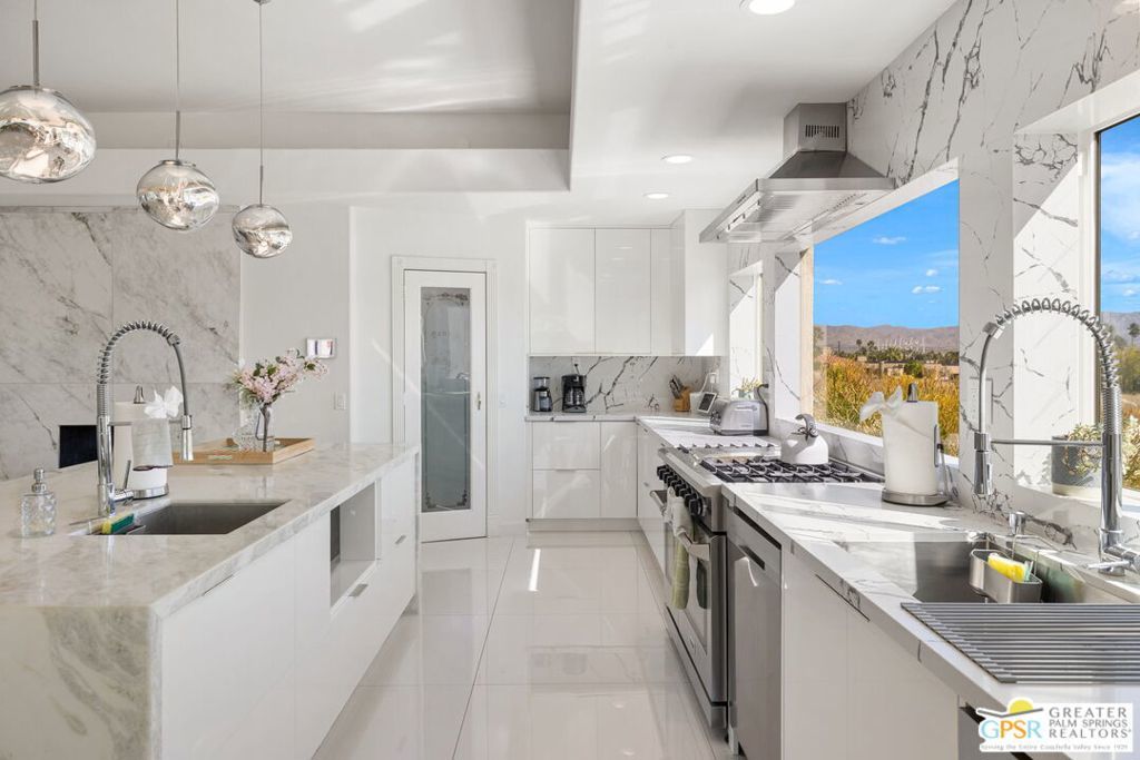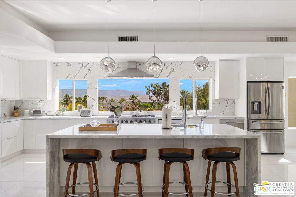 An exceptional opportunity to own a TURNKEY fully furnished renovated HILLTOP estate in Chino Canyon with jaw-dropping 360 views, resort-style amenities, and proven vacation rental income. This gorgeous retreat captures truly breathtaking panoramic views, stretching across the iconic Palm Springs mountains, sparkling city lights, and even snow-capped peaks of Big Bear. From sunrise to sunset, every angle of this property is designed to showcase the beauty of the desert from an elevated, private vantage point. Spanning over 3,500 square feet and situated on an oversized lot of more than 17,000 square feet, this completely remodeled home offers both space and privacy in a truly spectacular setting. All four bedrooms are en-suite and each with its own walk-in closet. Two bedrooms are located upstairs and two downstairs with both levels offering direct access to the backyard, creating an ideal layout for seamless indoor-outdoor living and guest privacy. The primary suite is a true retreat, complete with a soaking tub and a private laundry area conveniently located within the walk in closet. The immense kitchen is both stunning and functional, featuring quartz countertops, a striking marble waterfall island, stainless steel appliances including a Thor double oven, soft-close cabinetry, and a walk-in pantry. Designed for both relaxation and entertaining, the outdoor spaces are truly resort-inspired. Enjoy the massive pebble-tec saltwater pool with new equipment and heater, a built-in gas firepit, and a fully equipped outdoor kitchen complete with BBQ, sink, and refrigerator, all set against a dramatic backdrop of mountain views and windmill vistas. Lush grass, mature ficus, and natural rock and boulder landscaping enhance the sense of privacy and tranquility. Inside, the home features white Spanish porcelain flooring, beautifully finished bathrooms with porcelain tile showers, and a gas fireplace that welcomes you at the entry. A separate outdoor laundry room and pool bathroom add convenience for guests and effortless entertaining. Additional highlights include a motorized gated entry, security system, solar system, new plumbing (hot and cold supply), updated downstairs HVAC, EV charging in the covered two car garage, and fully permitted improvements throughout. This property is not only a stunning primary or second home, but also a highly successful vacation rental. Located in a neighborhood where short-term rental permits are still available (buyer to verify), it presents an exceptional investment opportunity with strong income potential. Here is your chance to own a meticulously upgraded desert sanctuary with unmatched views, privacy, income potential, and lifestyle amenities just minutes from the heart of Palm Springs.