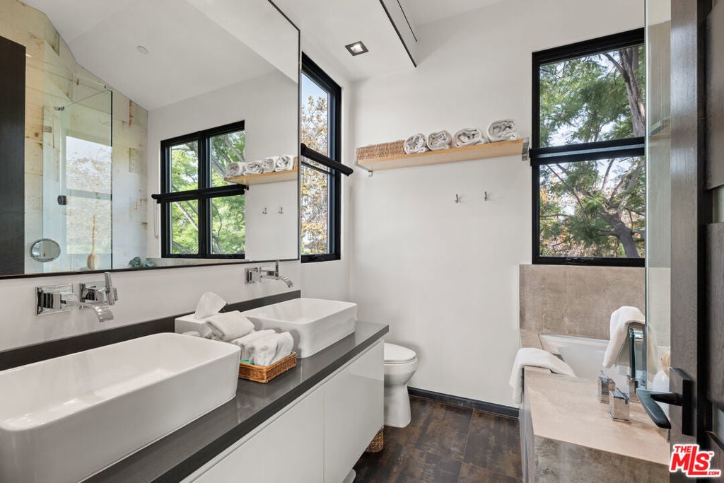 Experience the ultimate modern industrial farmhouse living with this stunning residence, crafted by renowned architect Paul Harrison, AIA. Nestled in a tranquil setting, the home features three spacious ensuite bedrooms plus an upstairs bonus room. The gourmet kitchen, adorned with sleek Italian lacquer cabinets, opens to a welcoming living area that effortlessly extends to the outdoors through expansive La Cantina glass sliders, creating a seamless indoor-outdoor flow. The backyard serves as a private retreat, boasting a sparkling pool and spa, cascading waterfall, steam shower, and outdoor bathroom. The luxurious primary suite offers a private balcony with captivating views, a spa-like bathroom, and a custom walk-in closet. Hedged and gated for optimal privacy, this exceptional residence combines luxury, functionality, and style in every detail.