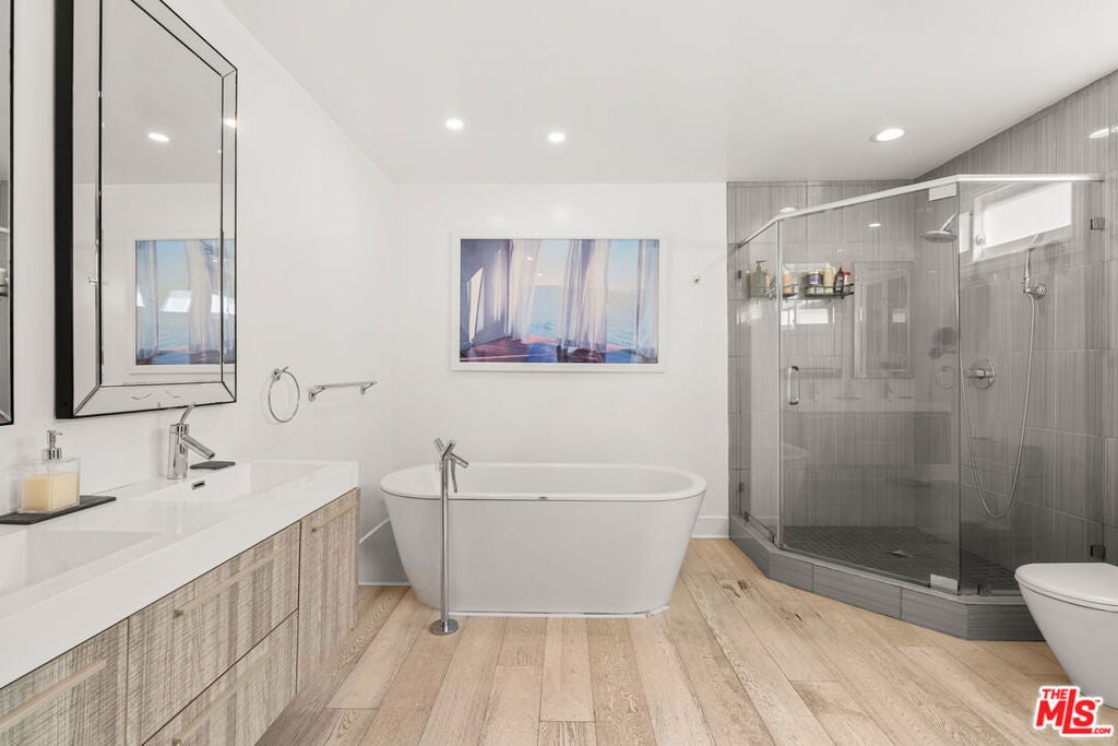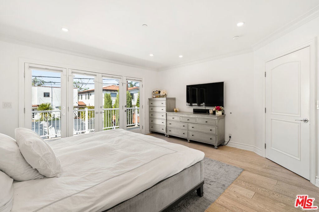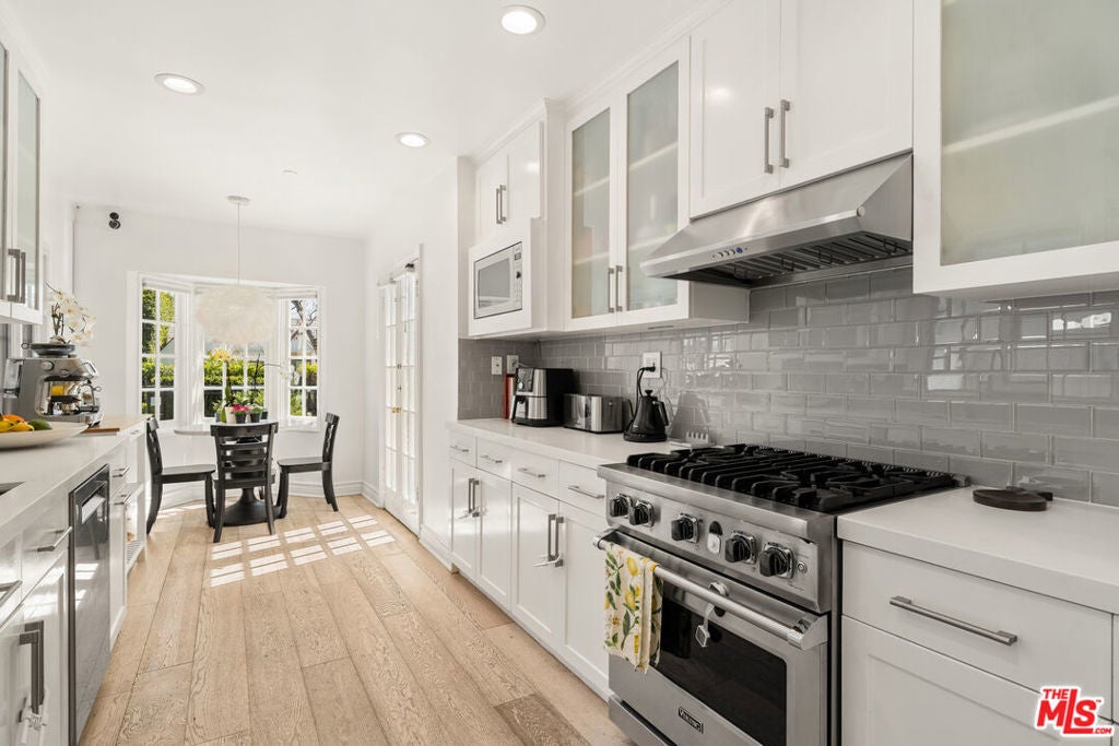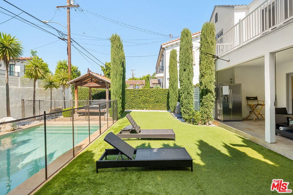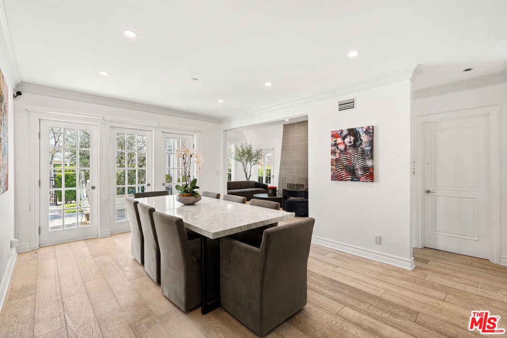 Tucked away on a quiet stretch of South Swall Drive in prime Beverly Hills, this beautifully updated residence blends timeless character with modern refinement. Behind its charming facade, light-filled interiors unfold with wide-plank wood floors, crisp white walls, and curated finishes that create a warm yet sophisticated atmosphere. Designed for both everyday living and effortless entertaining, the home features a seamless flow between formal and informal spaces, including a stylish living room with a statement fireplace, an elegant dining area, and a bright, thoughtfully updated kitchen with premium appliances and clean-lined cabinetry. French doors throughout invite natural light and open to the outdoors, enhancing the home's indoor-outdoor lifestyle. Upstairs, spacious bedrooms offer comfort and privacy, including a serene primary suite with balcony access overlooking the backyard. Outside, a private retreat awaits with a sparkling pool, manicured lawn, and lounge areas framed by lush hedging - ideal for relaxing or hosting under the California sun. With 4 bedrooms, 4 bathrooms, and 2,773 square feet of living space, this residence offers a rare combination of tranquility, style, and proximity to Beverly Hills' premier dining, shopping, and entertainment.
