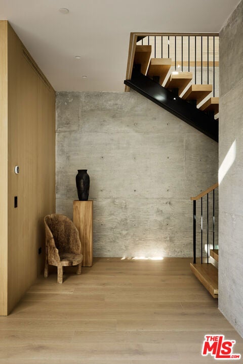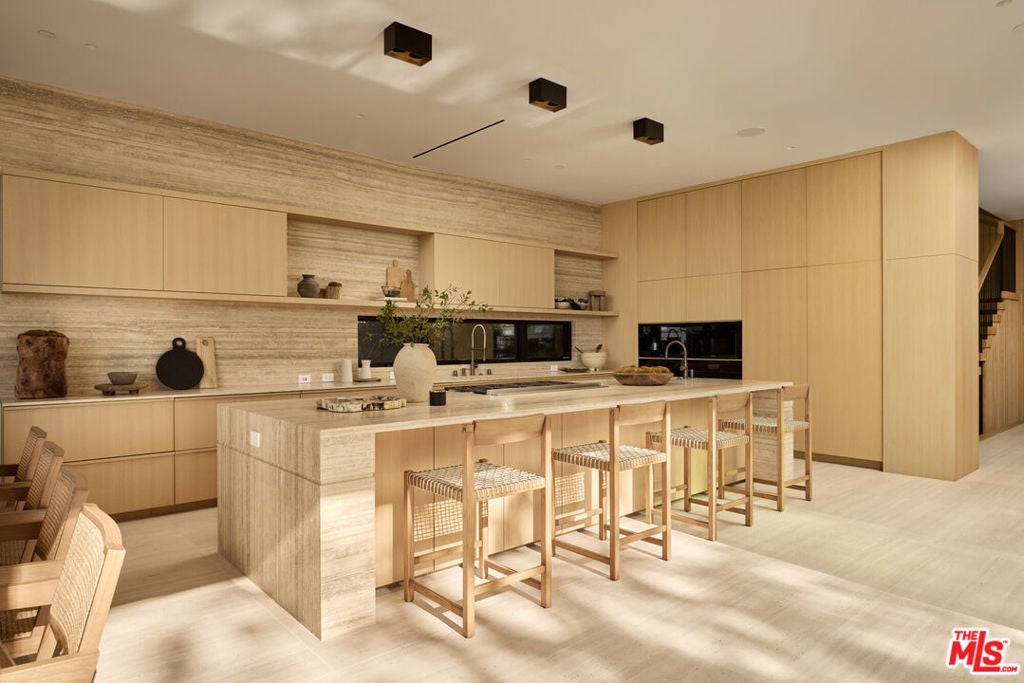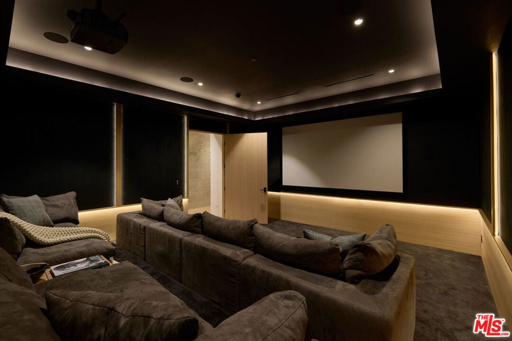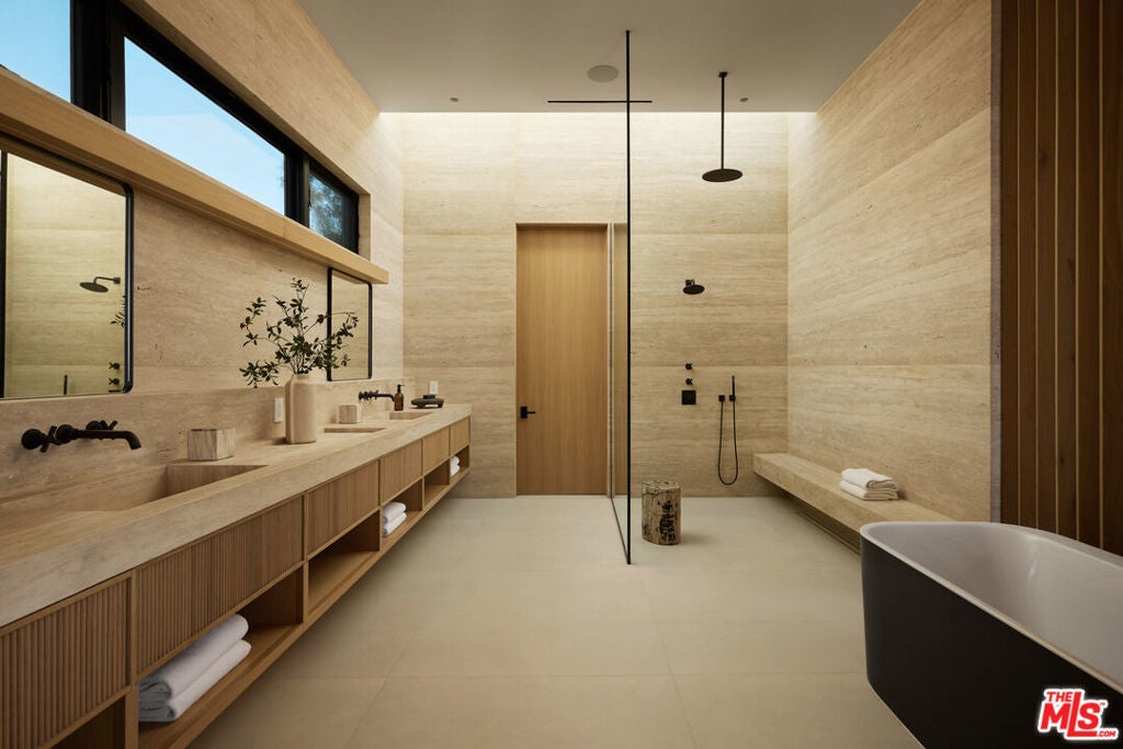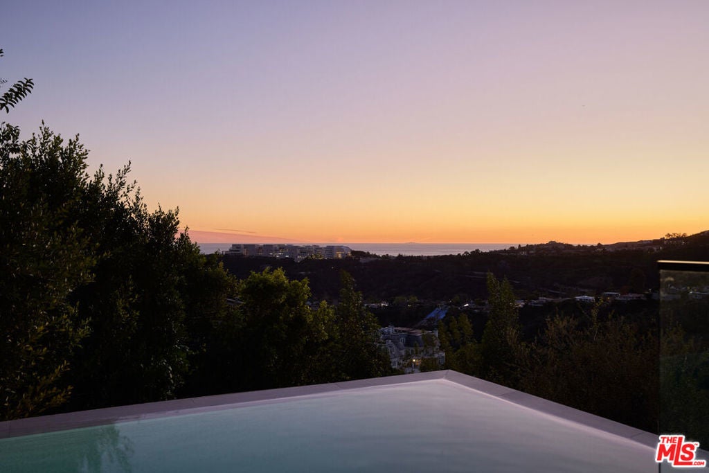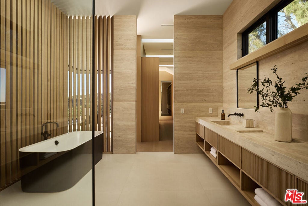 The Glassridge Residence. A Tadao Ando inspired organic modern with walls of glass that open to ocean and Getty views. Privately gated and set along one of Bel Air's most prominent ridgelines, the estate was newly completed in 2025 by Studio MD - AIA, with interiors by James Rosen. The main level is conceived as an open-plan environment with soaring 12' ceilings and sliding glass walls that connect living, dining, and kitchen spaces directly to the surrounding landscape. The kitchen reads like a gallery installation, featuring full-height travertine surfaces, a 15' waterfall island, and seamless, handle-less cabinetry that conceals an integrated Miele appliance suite, including double ovens and a built-in espresso machine. On the top level, a private vestibule with a stone-clad prep bar, integrated sink, and refrigerator precedes the primary suite, creating a quiet transition before the view reveals itself. Designed to honor its breathtaking setting, the bedroom is lined with floor-to-ceiling sliding glass walls that open to a wraparound private terrace, extending the suite outdoors and framing uninterrupted hillside and ocean views. The en-suite bath is resort-caliber, finished in travertine with a freestanding soaking tub, walk-in shower, and custom double floating vanities. A linear skylight draws natural light into the space, while a custom walk-in closet sits adjacent, integrated with matching wood millwork. The lower level is organized as a sequence of architectural moments featuring a linear corridor set against an exposed board-formed concrete wall, left intentionally raw, accented by wide-plank oak flooring. This level includes a private three-tier theater, temperature-controlled wine room, gym and steam shower, bar and lounge area that opens to a separate outdoor deck, all designed as a self-contained environment for leisure, wellness, and entertaining. A fully integrated Control4 system manages lighting, climate, audio, and security. The backyard showcases a 41' infinity pool that visually disappears into the landscape, flowing into a waterfall feature visible from the lower deck below. Lounge areas, dining zones, a built-in Alfa wood-fired pizza oven, grill, and a level lawn are arranged as distinct outdoor settings, all oriented toward the surrounding hills. 1149 Linda Flora Drive stands apart as an architecturally distinguished estate thoughtfully designed for privacy and wellness.