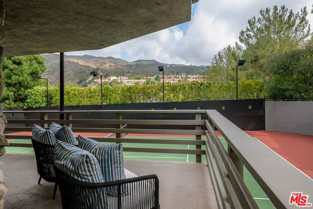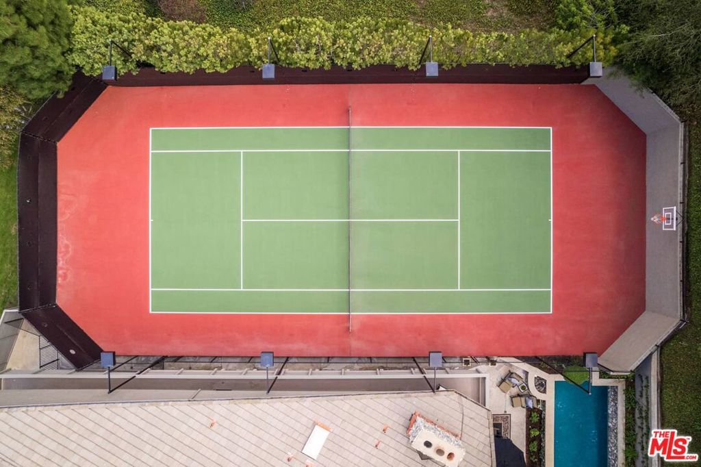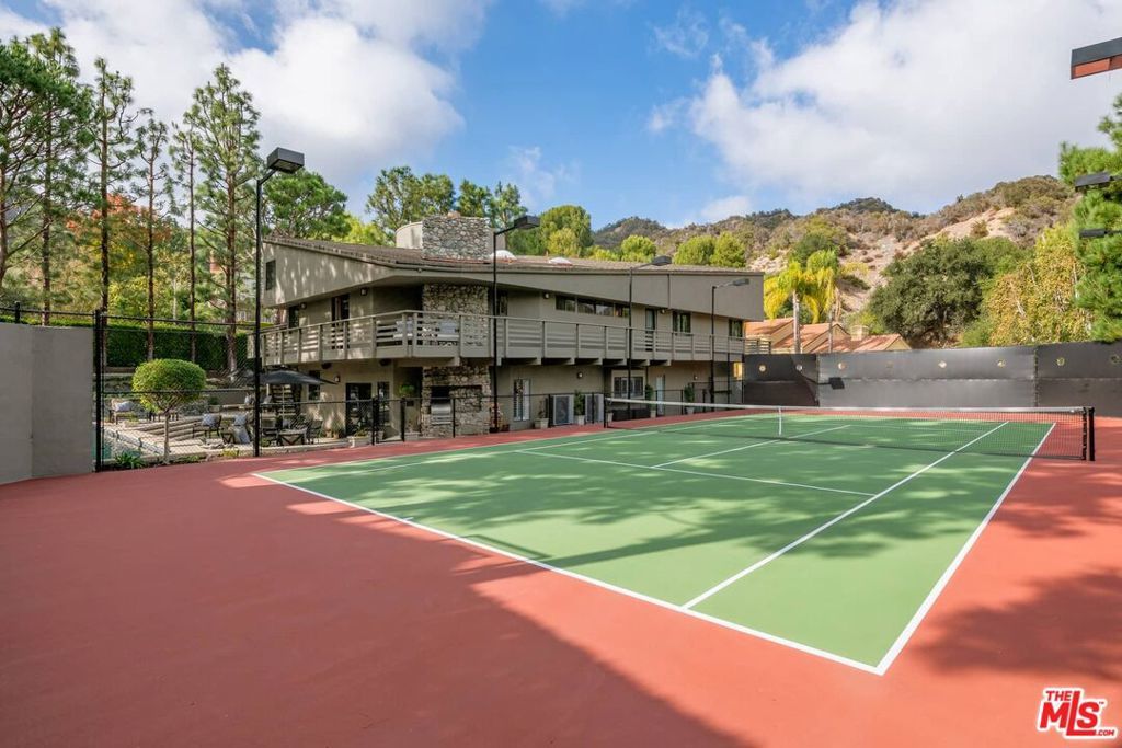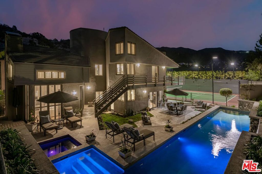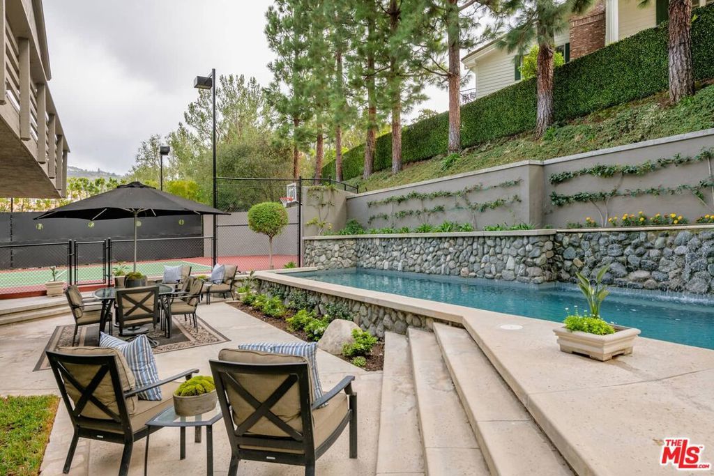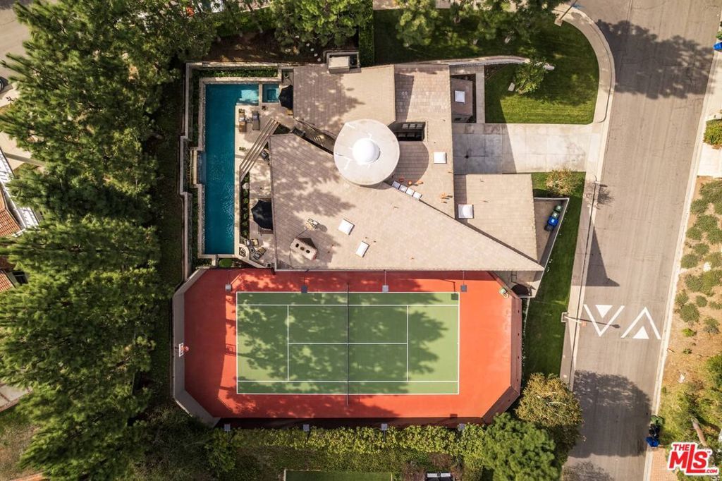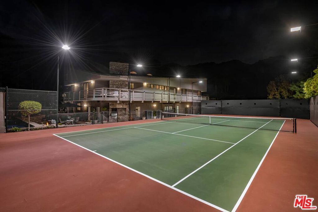 Set on more than half an acre behind the 24-hour guard gates of Palisades Country Estates, 17765 Camino De Yatasto is a striking architectural residence by Steinbrueck + Dianella, blending privacy, scale, and resort-style amenities in one of Pacific Palisades' most coveted enclaves. Spanning nearly 5,500 square feet with 5 bedrooms and 4.5 baths, the home makes an immediate impression with bold lines, a dramatic silhouette, glass-paneled garage doors, stone detailing, and a serene courtyard entry with tranquil water feature. Inside, soaring ceilings, curved walls, sculptural forms, art niches, and a dramatic circular skylit rotunda create an interior that feels both expansive and architecturally distinct. The formal living room is bright and elegant, centered around a marble fireplace and framed by towering windows, while the formal dining room overlooks the central volume and connects seamlessly to the home's entertaining spaces. The kitchen is generous in scale and function, appointed with top-tier stainless appliances, extensive cabinetry, black stone counters, a large center island with cooktop, and an adjacent breakfast area. Nearby, the family room offers a more relaxed setting with exposed beams, a striking fireplace, full wet bar, and direct access to the outdoor entertaining areas. Additional flex spaces provide versatility for office, gym, study, or creative use. Upstairs, the primary suite unfolds as a private retreat with exceptional scale, its own fireplace, sitting area, balcony access, beverage bar, oversized walk-in closet, and a beautifully renovated spa bath with dual vanities, freestanding soaking tub, and large glass shower. Secondary bedrooms are spacious and thoughtfully designed, while updated baths, dedicated laundry, and additional upstairs workspace enhance everyday livability. Outside, the grounds live like a private resort, with a long swimmers pool and spa, waterfall, multiple lounge and dining terraces, built-in BBQ, covered entertaining areas, and one of the few private full-size tennis courts in the community, all set against a lush hillside backdrop. By day, the property offers privacy, recreation, and architectural presence; by night, it becomes a dramatic retreat defined by glowing interiors, illuminated grounds, and an exceptional indoor-outdoor lifestyle. With a 3-car garage, generous additional parking, and close proximity to Palisades Village, hiking trails, and the coastline, this is a rare opportunity to own a residence of true architectural character in an exceptionally private guard-gated setting.