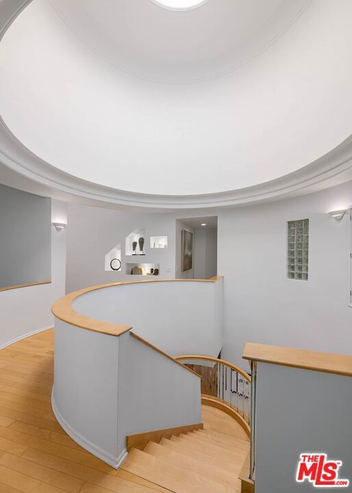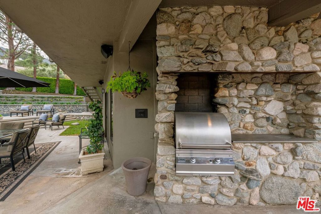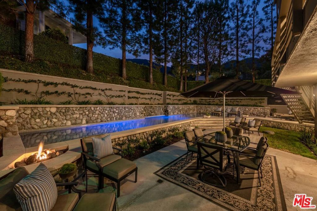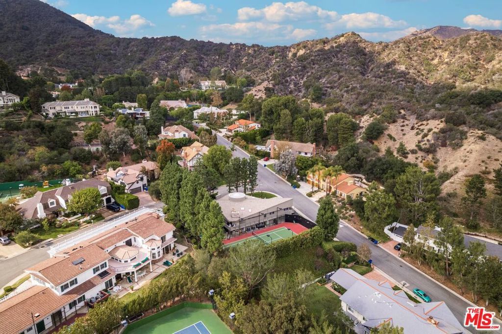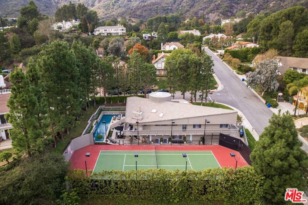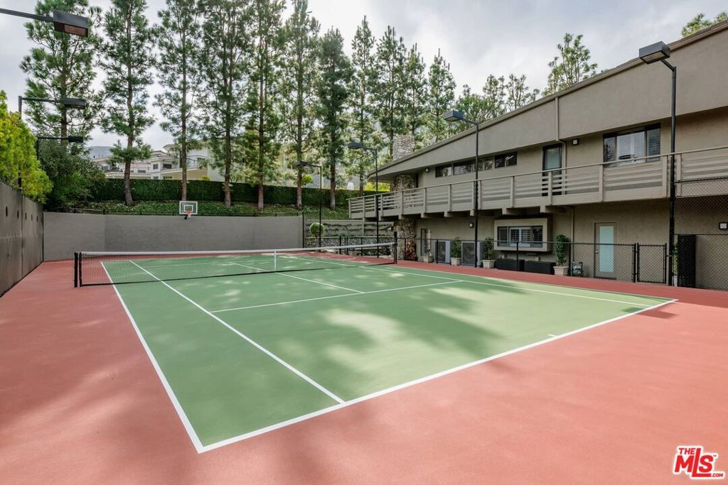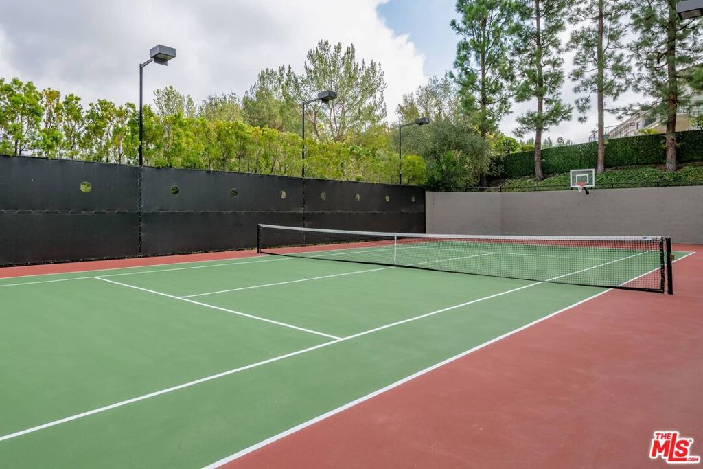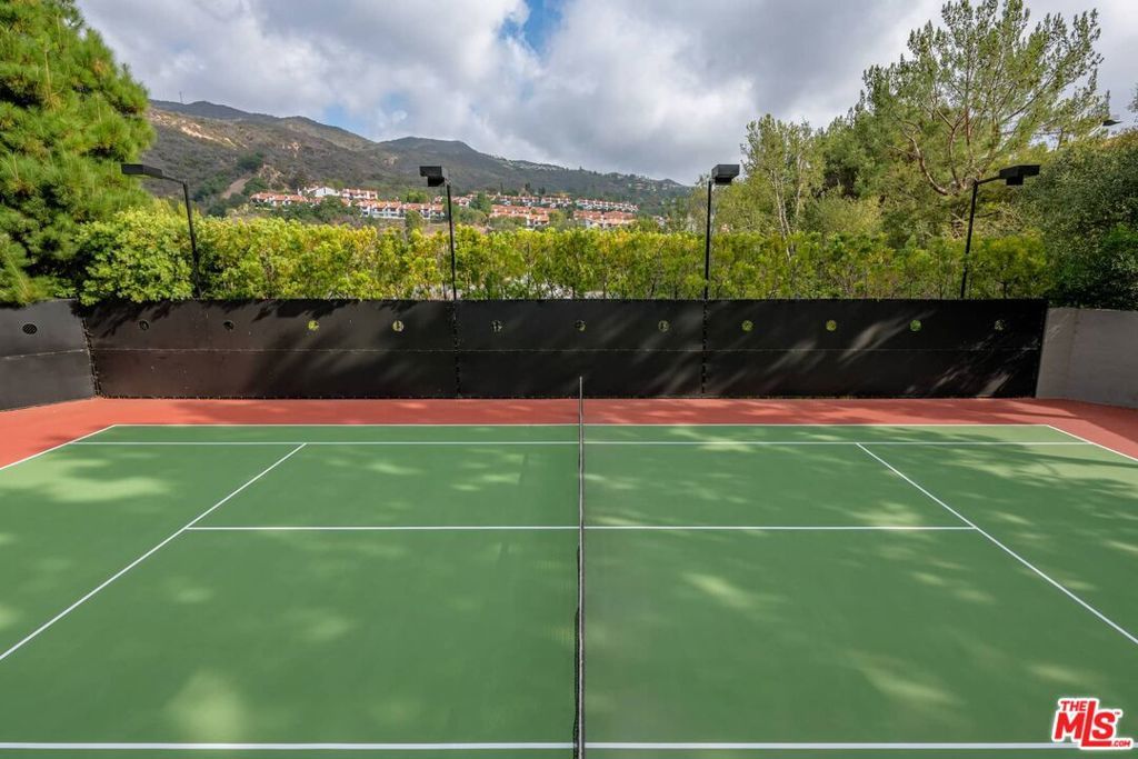 Set on more than half an acre behind the 24-hour guard gates of Palisades Country Estates, 17765 Camino De Yatasto is a striking architectural residence by Steinbrueck + Dianella, blending privacy, scale, and resort-style amenities in one of Pacific Palisades' most coveted enclaves. Spanning nearly 5,500 square feet with 5 bedrooms and 4.5 baths, the home makes an immediate impression with bold lines, a dramatic silhouette, glass-paneled garage doors, stone detailing, and a serene courtyard entry with tranquil water feature. Inside, soaring ceilings, curved walls, sculptural forms, art niches, and a dramatic circular skylit rotunda create an interior that feels both expansive and architecturally distinct. The formal living room is bright and elegant, centered around a marble fireplace and framed by towering windows, while the formal dining room overlooks the central volume and connects seamlessly to the home's entertaining spaces. The kitchen is generous in scale and function, appointed with top-tier stainless appliances, extensive cabinetry, black stone counters, a large center island with cooktop, and an adjacent breakfast area. Nearby, the family room offers a more relaxed setting with exposed beams, a striking fireplace, full wet bar, and direct access to the outdoor entertaining areas. Additional flex spaces provide versatility for office, gym, study, or creative use. Upstairs, the primary suite unfolds as a private retreat with exceptional scale, its own fireplace, sitting area, balcony access, beverage bar, oversized walk-in closet, and a beautifully renovated spa bath with dual vanities, freestanding soaking tub, and large glass shower. Secondary bedrooms are spacious and thoughtfully designed, while updated baths, dedicated laundry, and additional upstairs workspace enhance everyday livability. Outside, the grounds live like a private resort, with a long swimmers pool and spa, waterfall, multiple lounge and dining terraces, built-in BBQ, covered entertaining areas, and one of the few private full-size tennis courts in the community, all set against a lush hillside backdrop. By day, the property offers privacy, recreation, and architectural presence; by night, it becomes a dramatic retreat defined by glowing interiors, illuminated grounds, and an exceptional indoor-outdoor lifestyle. With a 3-car garage, generous additional parking, and close proximity to Palisades Village, hiking trails, and the coastline, this is a rare opportunity to own a residence of true architectural character in an exceptionally private guard-gated setting.