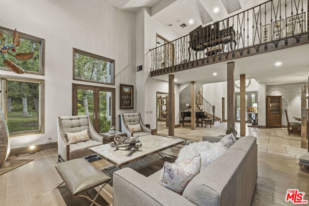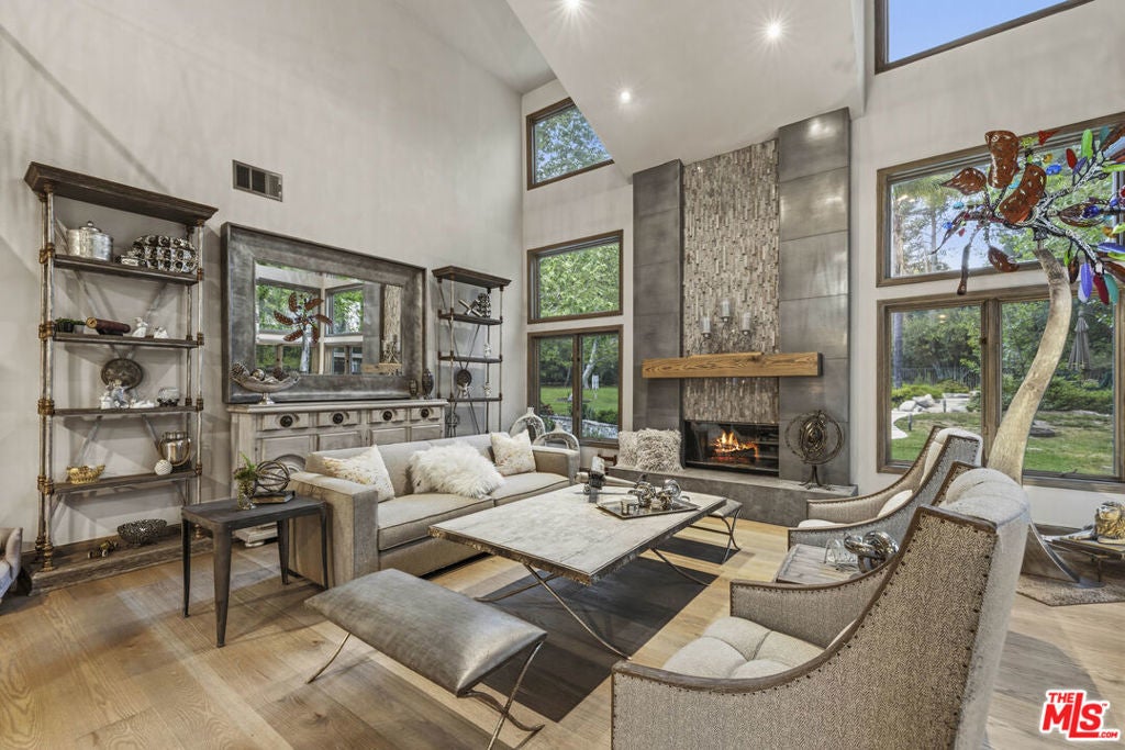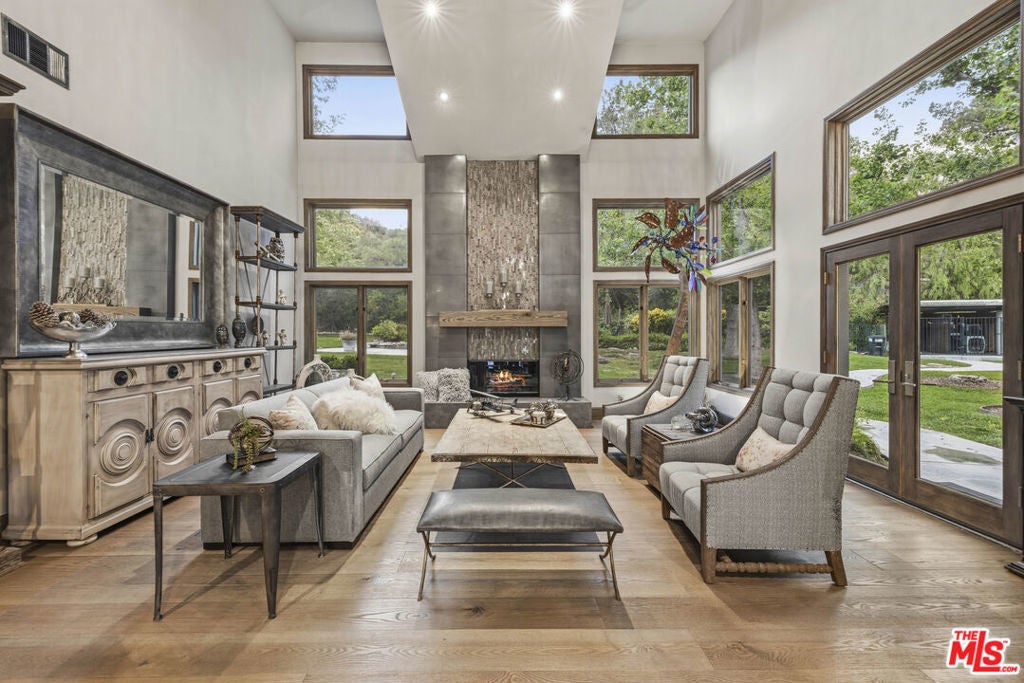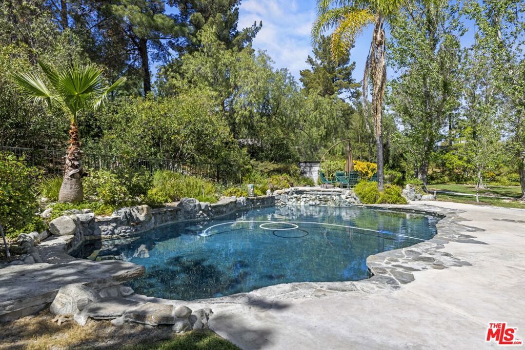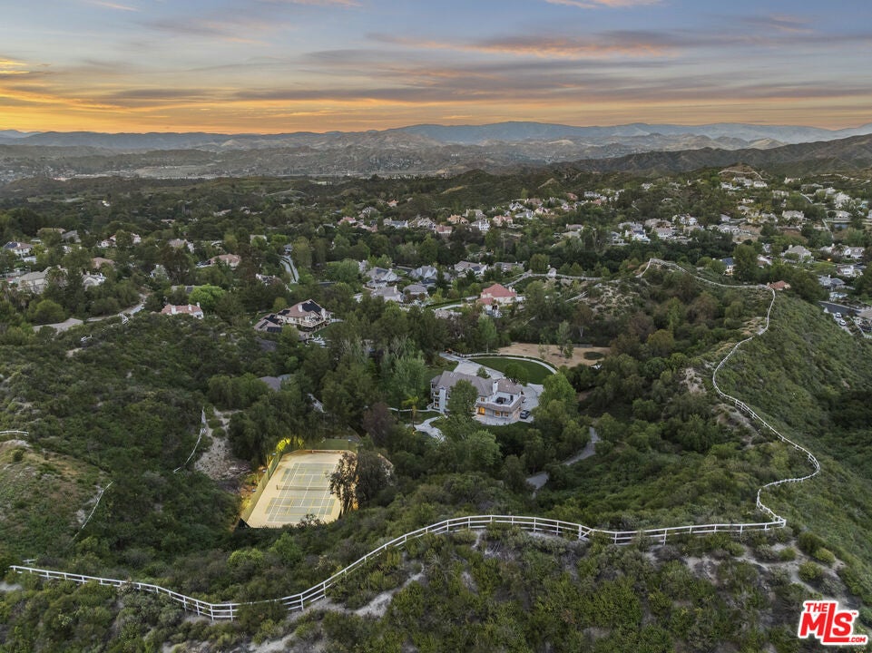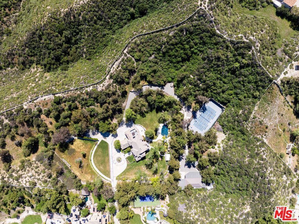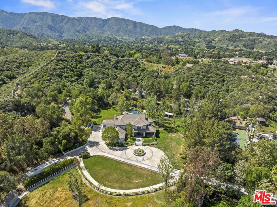 Welcome to your dream home in the prestigious Sand Canyon neighborhood! This California contemporary estate offers 5,134 sq ft of living space on a nearly 9-acre private and fully fenced property with serene mountain views. The gated drive leads to a grand circular driveway featuring a centerpiece fountain. A gorgeous custom metal front door opens into a sun-drenched great room with soaring ceilings, oversized windows, double doors leading outside, and a stunning custom statement fireplace, perfect for gathering or effortless entertaining. The formal dining room flows seamlessly from the main living space. The main level includes two well-appointed ensuite bedrooms with custom built-ins. The chef's kitchen is a true showpiece with a soapstone island, natural stone countertops, and custom cabinetry all opening seamlessly to the breakfast nook and family room. Enjoy the 6 burner Dacor range, double ovens, dual refrigerator/freezer, steamer and generous pantry storage. The expansive family room features exposed beams, a custom feature wall, an architectural fireplace with extended hearth, and a baywindow seat. Upstairs, an airy loft overlooks the great room. The primary suite is a private sanctuary with a fireplace, balcony views, and a sun patio with above-ground spa. A generous walk-in closet leads to a flexible bonus room. The ensuite bath offers dual vanities, a separate soaking tub, steam shower with rainfall feature and towel warmer, plus a laundry chute for added convenience. There are three additional bedrooms on the second floor, including one en-suite. Outside,enjoy a sprawling lawn, resort-style pool and waterfall spa, built-in BBQ, and a sport court lined for basketball and pickleball. A detached workshop/5-car garage, RV parking/electrical hookup, and generator system (with potential backup to the main house) complete this exceptional property. Whether you're dreaming of unforgettable gatherings, space for hobbies and toys, or a true retreat surrounded by nature, this property delivers a rare lifestyle in an exclusive neighborhood!