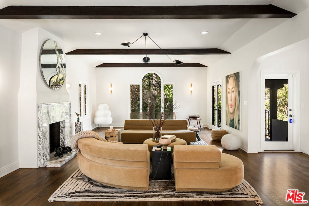 Offered furnished or unfurnished. Nestled in Los Feliz' sought-after "Oak Streets," this reimagined 4-bed, 5-bath Contemporary Spanish estate seamlessly blends historic charm with modern luxury. From the gated drive and lush landscaping to arched windows and exposed beams, every detail feels curated and inviting. Perfectly positioned between Beachwood Canyon and Los Feliz, the home offers rare dual access ideal for those who love the Eastside's character yet want the convenience of an easy connection to Hollywood and beyond. The sunlit living and dining rooms flow into a soaring double-height family room, while the chef's kitchen overlooks a stunning oversized mosaic-tiled pool. Designed for entertaining, the backyard features a pergola lounge with fireplace, outdoor kitchen, and spa all framed by views of Griffith Observatory in total privacy. Upstairs, the primary suite offers dual walk-in closets, a spa-like bath, and a private fireplace. Three additional bedrooms provide easy access to updated bathrooms, custom built-ins, and flexible spaces for family, guests, or a home office. Offered fully furnished, this residence invites you to embrace elevated living where classic design meets modern convenience, just minutes from Griffith Park trails, the Trails Cafe, and the best of Los Feliz.