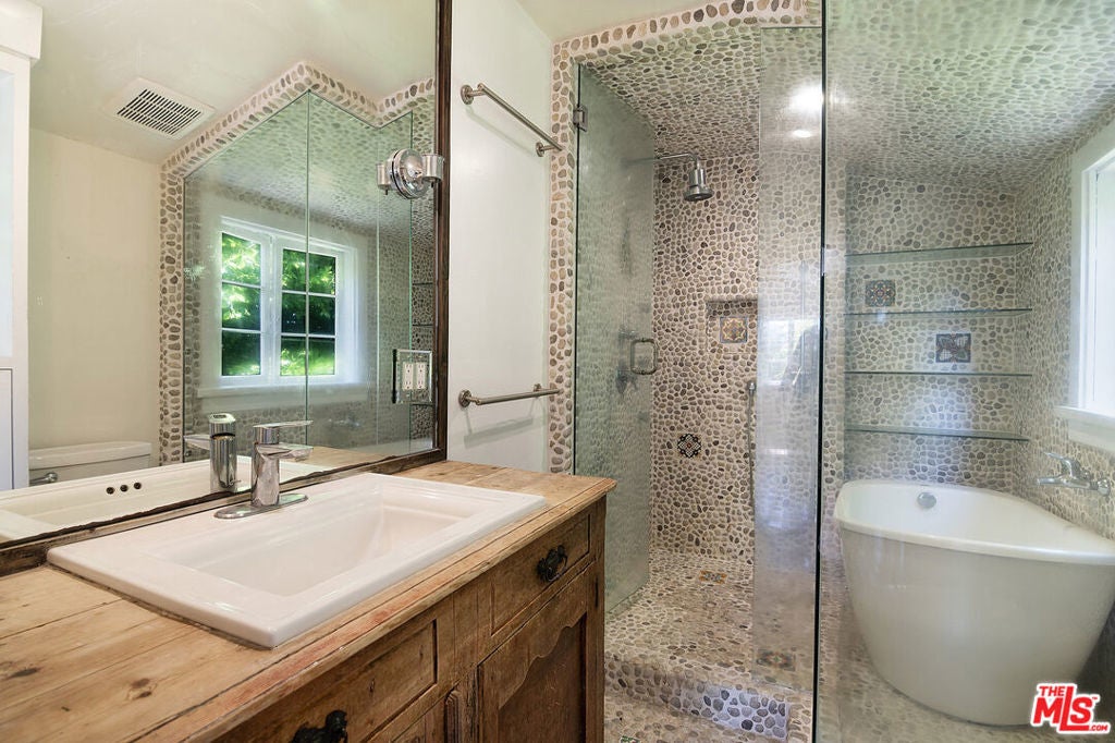 Prime Santa Monica, North of Montana and just East of 7th Street. Classic 1925 Spanish Revival style in a private, secure, and serene setting. Beautiful architectural details abound including a hand-carved wood entry door, exposed wood beams, soaring ceilings, and graceful arched passageways all bathed in natural light. The indoor/outdoor flow of the home takes advantage of the beautiful Santa Monica year-round weather and provides a great ambiance for living and entertaining. One of the downstairs bedrooms has a separate entrance offering flexibility for guests or a home office. Home is set way back from San Vicente behind lush, mature hedges and offers exceptional privacy in a prime location. Easy stroll to the beach and Montana Avenue and a short drive to the Third Street Promenade, Santa Monica Pier, Brentwood Country Mart, and the best of Southern California lifestyle.
