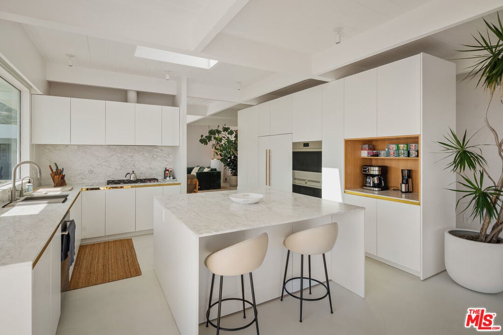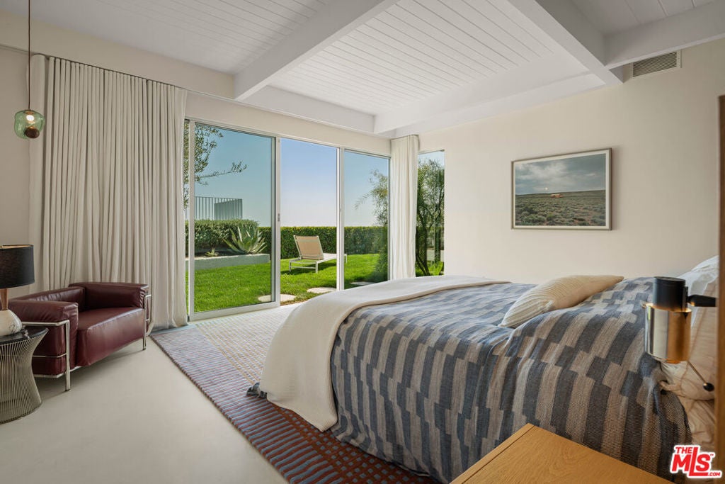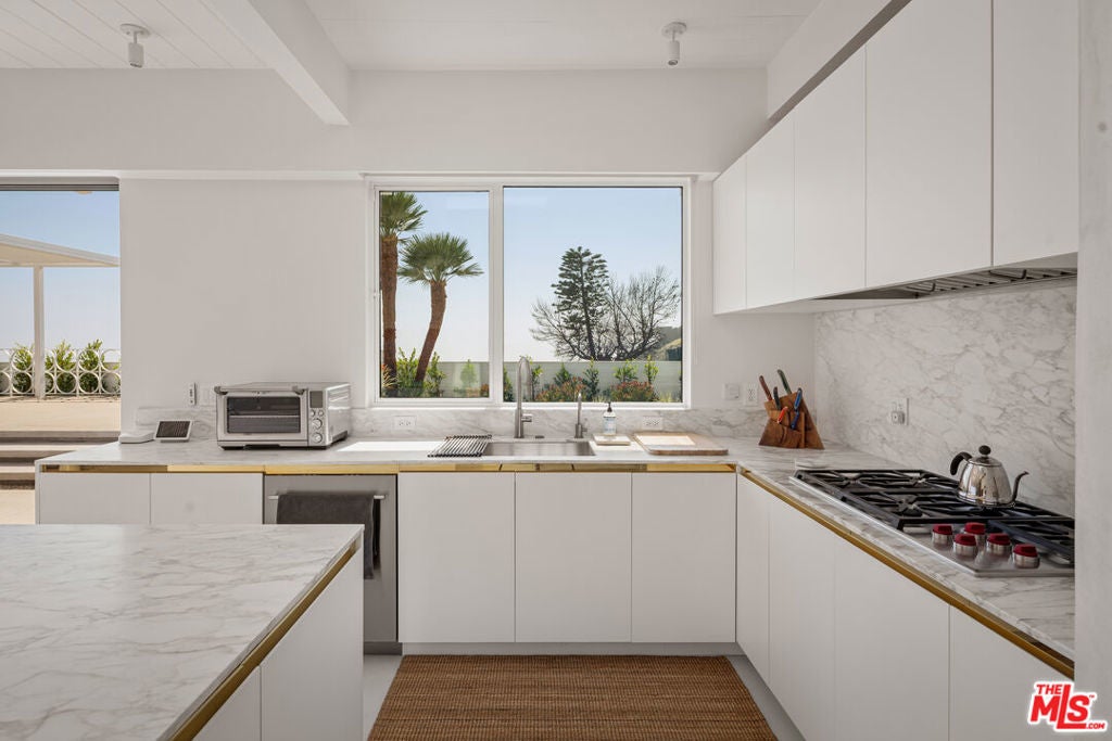 Set in coveted Marquez Knolls, this private 1960s Mid-Century residence has been meticulously restored with exceptional finishes and sweeping ocean views. Spanning approximately 3,503 square feet, the single-level 4-bedroom, 4-bath home offers seamless indoor-outdoor living. A dramatic entry opens to vaulted ceilings and abundant natural light throughout. The layout includes a formal living room with fireplace, separate family and dining rooms, and a chef's kitchen outfitted with high-end appliances and a large center island. The primary suite features a walk-in closet and spa-inspired bath with soaking tub, dual vanities, and walk-in shower. Extensive improvements enhance both the interiors and outdoor living spaces. The grounds have been thoughtfully reimagined with new concrete, updated gates and fencing, a pergola, garden shed, landscape lighting, irrigation, French drains, downspouts, refreshed soil and stonework, and an outdoor shower. The pool and entertaining areas have been completely upgraded with new equipment, plumbing, tile, plaster, and a custom BBQ with countertop and tile finishes, creating an ideal setting for year-round enjoyment. The entire property, including the home and surrounding walls, has been freshly painted and newly landscaped for a polished, cohesive presentation. Prior upgrades further elevate the home, including refreshed interiors, built-ins, upgraded lighting, refinished garage flooring, new electrical in the garage with Tesla universal charger, security cameras, updated bathroom hardware, installed TVs, improved sliding glass doors, and generator servicing. The home has been thoroughly remediated and professionally tested, offering a clean, move-in ready opportunity with documentation available. As the Palisades continues its revitalization, key landmarks are reopening including Palisades High School with the Village slated to return this summer, signaling strong momentum and renewed energy throughout the community. Ideally located near top-rated schools, dining, and coastal amenities, this home captures the essence of California living.