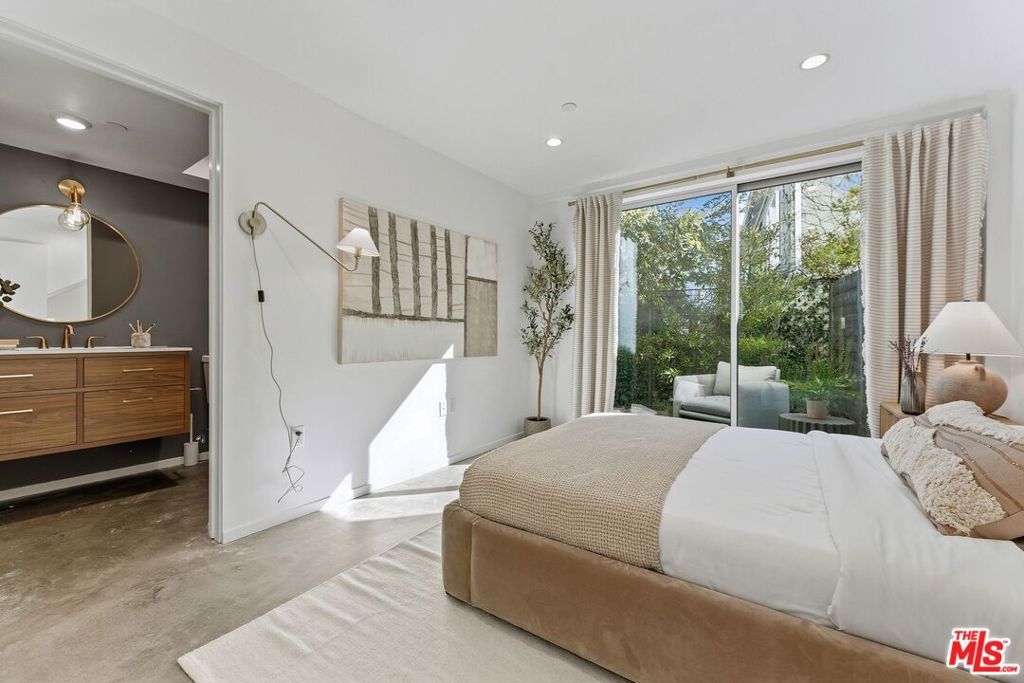 Welcome to a thoughtfully crafted, architect-designed modern residence in a boutique five-unit building completed in 2022. This home blends clean contemporary design with soaring ceilings, walls of glass, and an airy open-concept layout filled with natural light. The interiors feature a refined mix of concrete and hardwood flooring, a sleek designer kitchen with premium appliances, and curated finishes that feel both warm and modern. A light-filled skylight room adds architectural interest and flexibility ideal as a home office, creative studio, or serene retreat. The layout offers distinct yet connected living and entertaining spaces, while a private rooftop deck captures city views with an ocean backdrop perfect for sunset lounging or casual gatherings. Additional amenities include central HVAC, in-unit laundry, secure subterranean parking, and solar panels supporting energy-efficient living. Ideally located just minutes from Wilshire Boulevard, the beach, top dining, and everyday conveniences, this residence delivers a relaxed yet refined Santa Monica lifestyle with timeless architectural appeal.