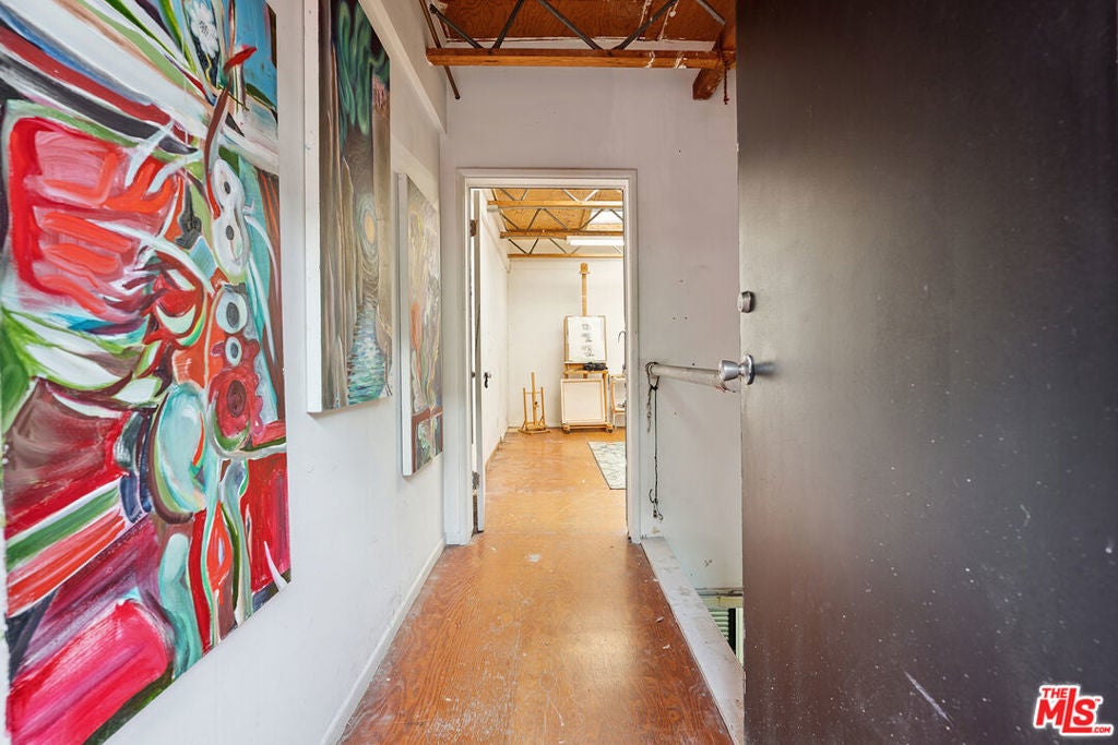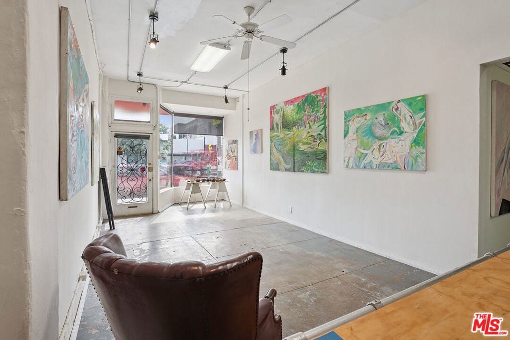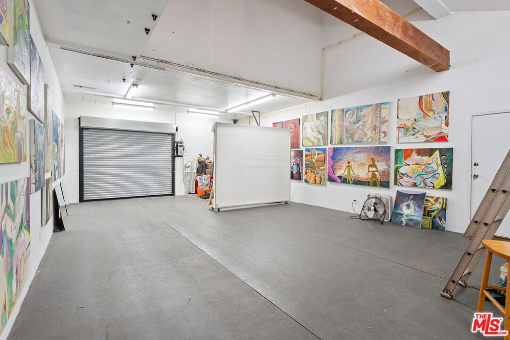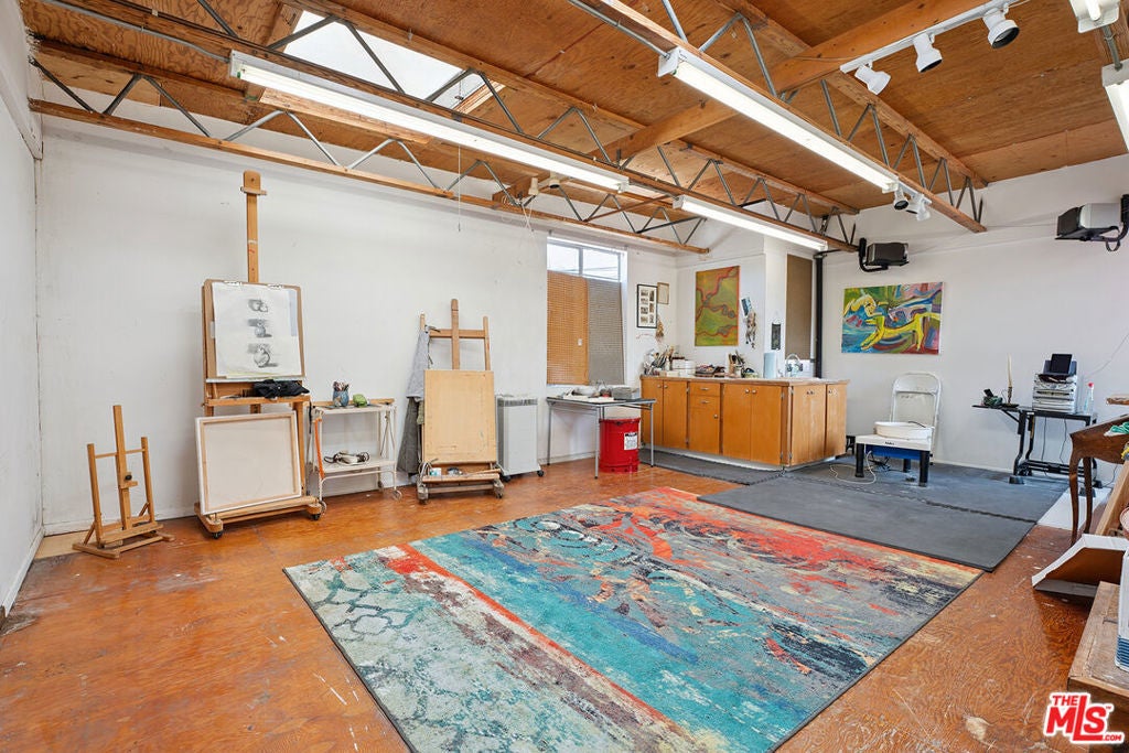 Welcome to 2847 Robertson, a truly unique opportunity to own a piece of Los Angeles history. This storied address was once the working studio and home of the legendary Rachel Rosenthal, one of the most influential interdisciplinary artists, performers, and teachers of the 20th century. The front half of the property is smartly partitioned into two distinct rooms, making it well-suited for two separate businesses or creative ventures. Behind this, there is a performance studio with 220-amp power and dramatic double-height ceilings. This studio space can easily function as a garage, accommodating up to four vehicles. Upstairs, there is a spacious studio apartment, a large patio, and an additional studio space. The studio apartment upstairs features a full kitchen, living room, and bathroom with incredible tree-top views. The additional studio offers exceptional natural light and could potentially be transformed into an additional residential unit. Recent improvements include brand new lighting and windows throughout, new roofs and a deck (2025), and major system updates: upgraded electrical panels (2023 & 2024), and new HVAC. Rarely does a live-work residence combine such versatility and historic provenance.
